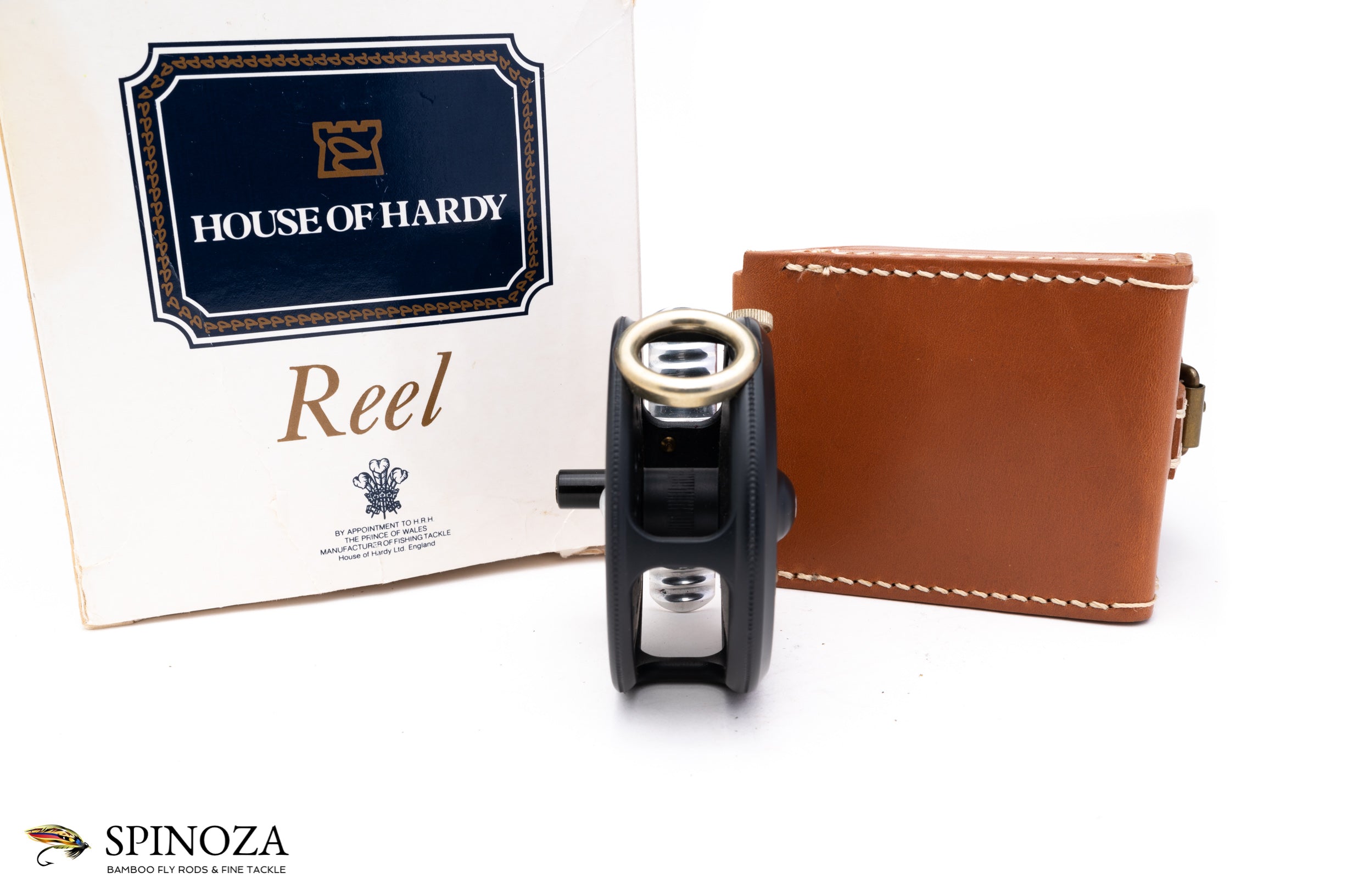 An excellent little Hardy St. George Jr. fly reel, one of the late 1990's limited reissue reels. 2 9/16" diameter and rated for a WF4 line and 45 yards of backing. Set up for RHW. Mint condition. Nickel silver line guard. Charcoal frame and spool, with a ribbed silver foot. Comes in the original Hardy leather block case and box (no paperwork).