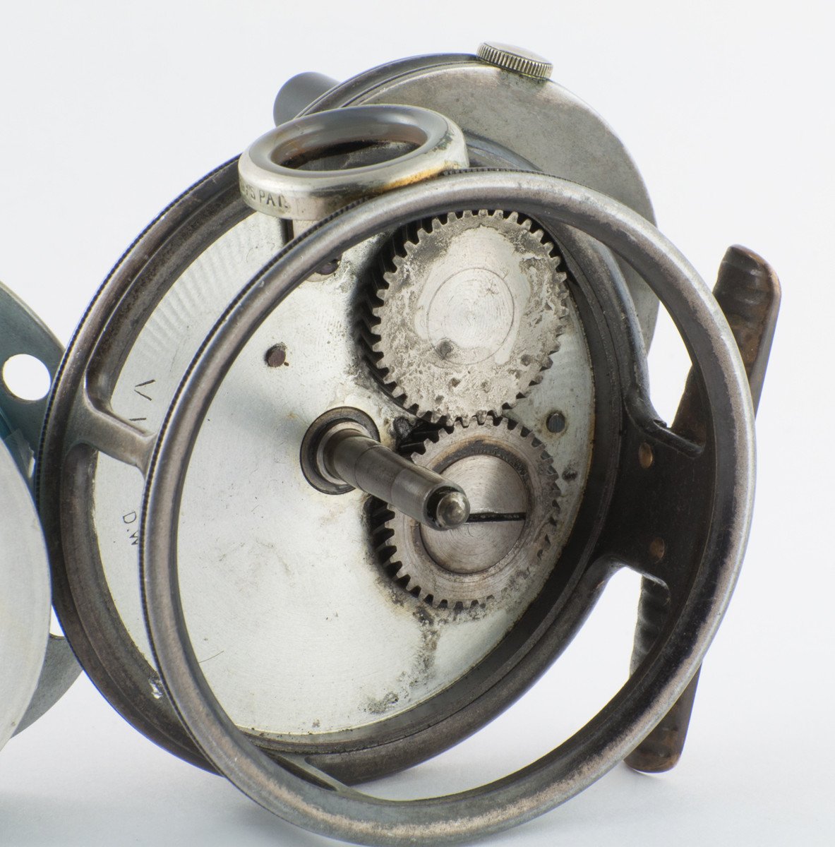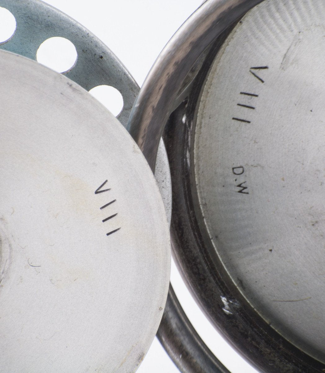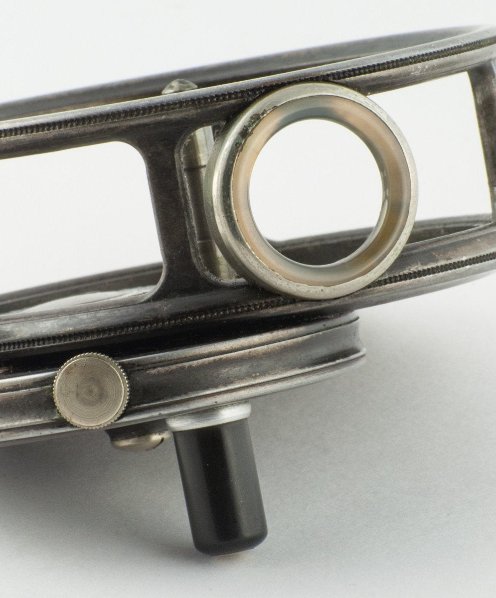 For sale here is a scarce Hardy St. George Multiplier 3 3/8" fly reel with three-screw latch from the 1927-1939. "DW" on inner frame for Deny Ward, Hardy reel maker. Excellent original condition throughout. Ribbed brass foot is full length and has not been filed. The reel is nice and tight mechanically. Stunningdark brown agate line guide is unblemished. Ebonite handle spins freely. Tension regulator works as intended. Nice strong check throughout its range. A fine collector example!