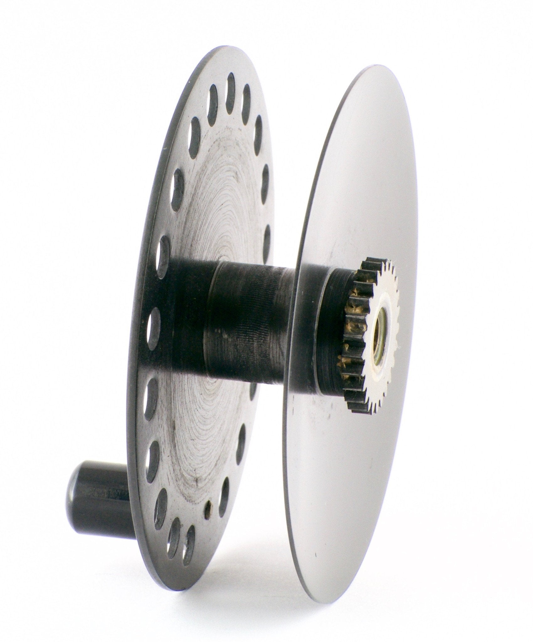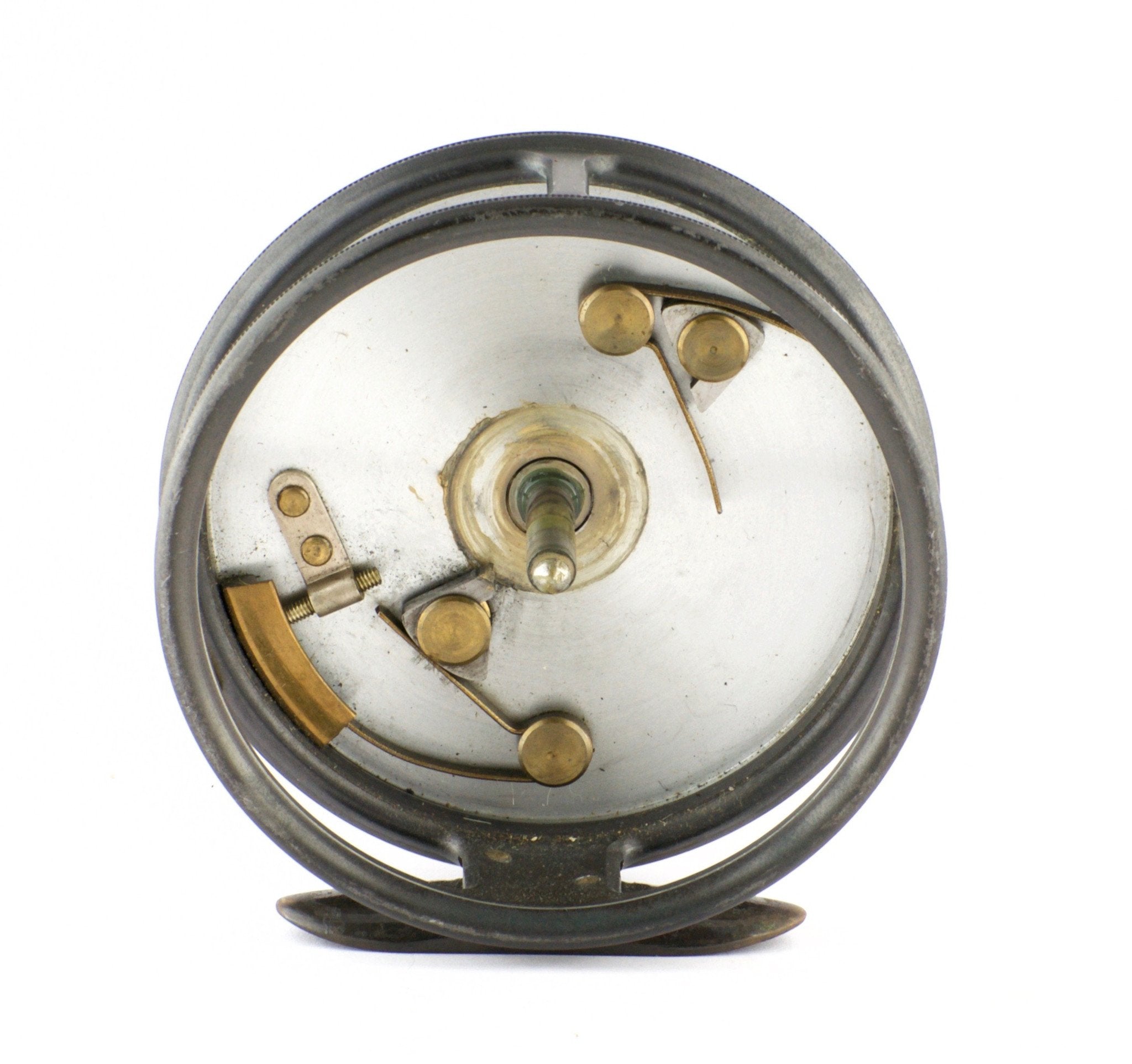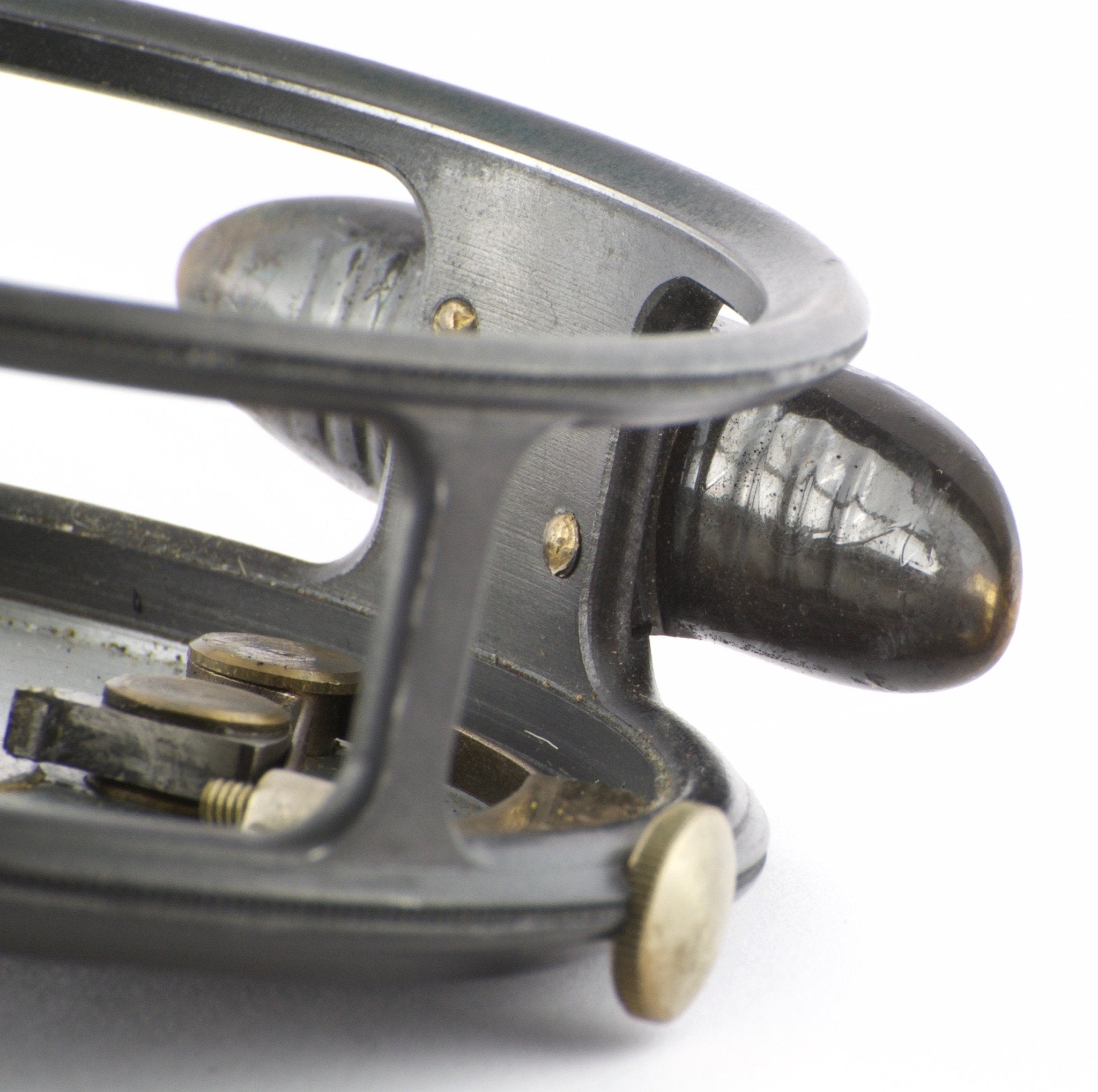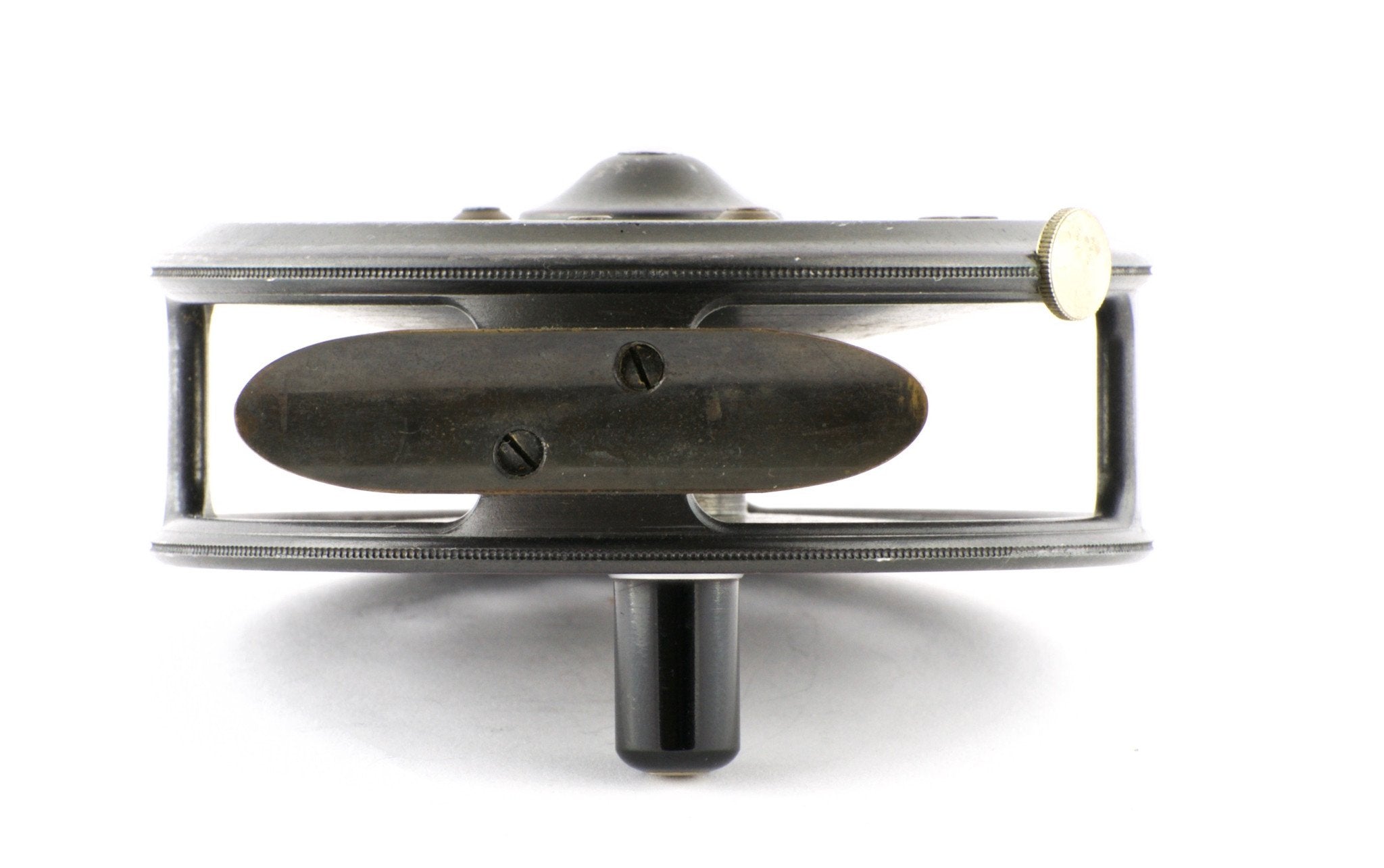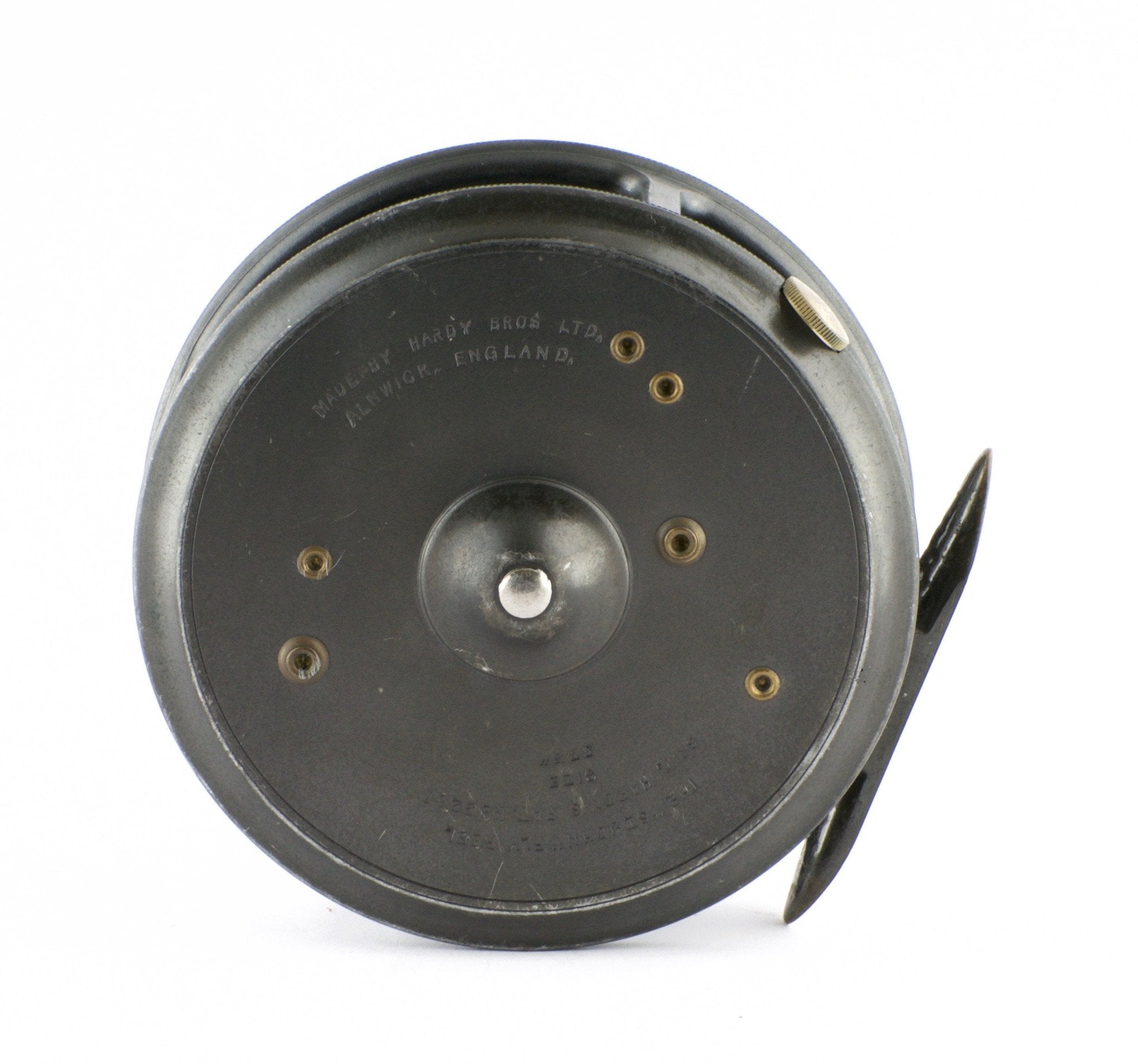 For sale here is a pre-war Hardy St. John 3 7/8" fly reel with the Duplicated MKII check. The leaded finish is amazing. Full length and unaltered ribbed brass "bullet" foot (super scarce). Ebonite handle spins freely. Tensioner works perfectly. No line burns. No cracks/chips/dings. No problematic wobble or end play. NEAR MINT CONDITION!