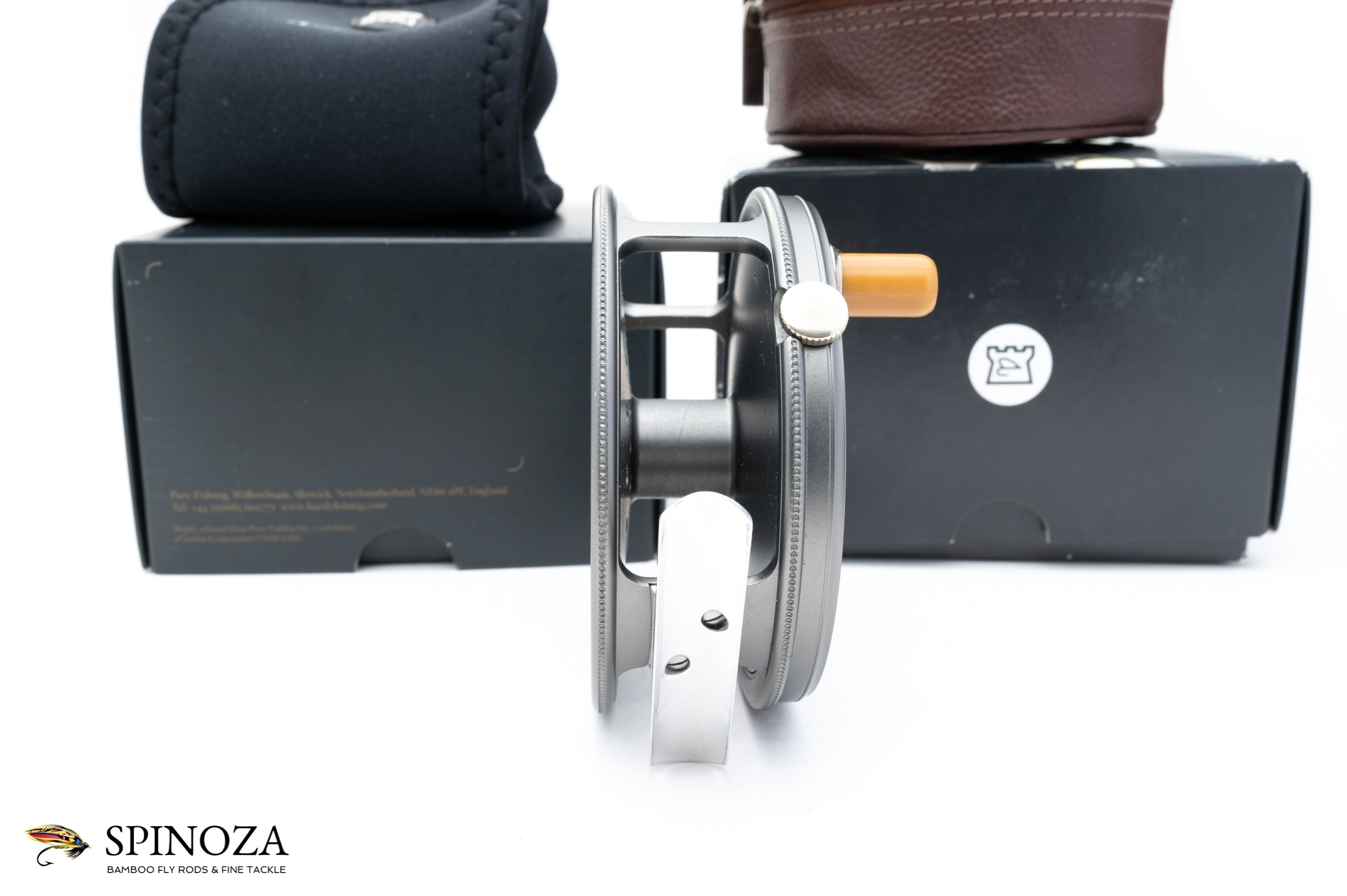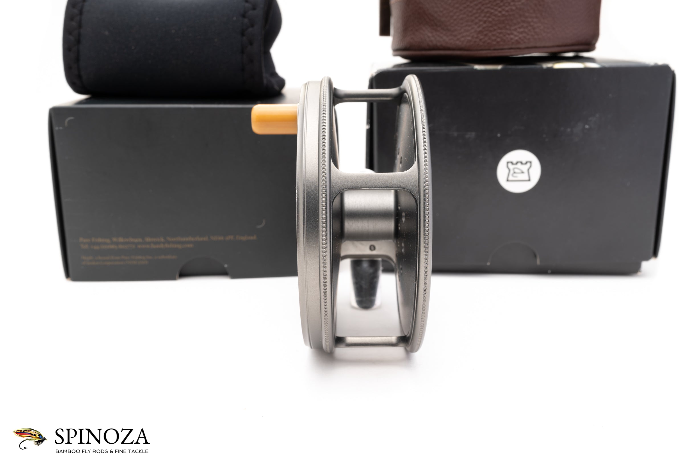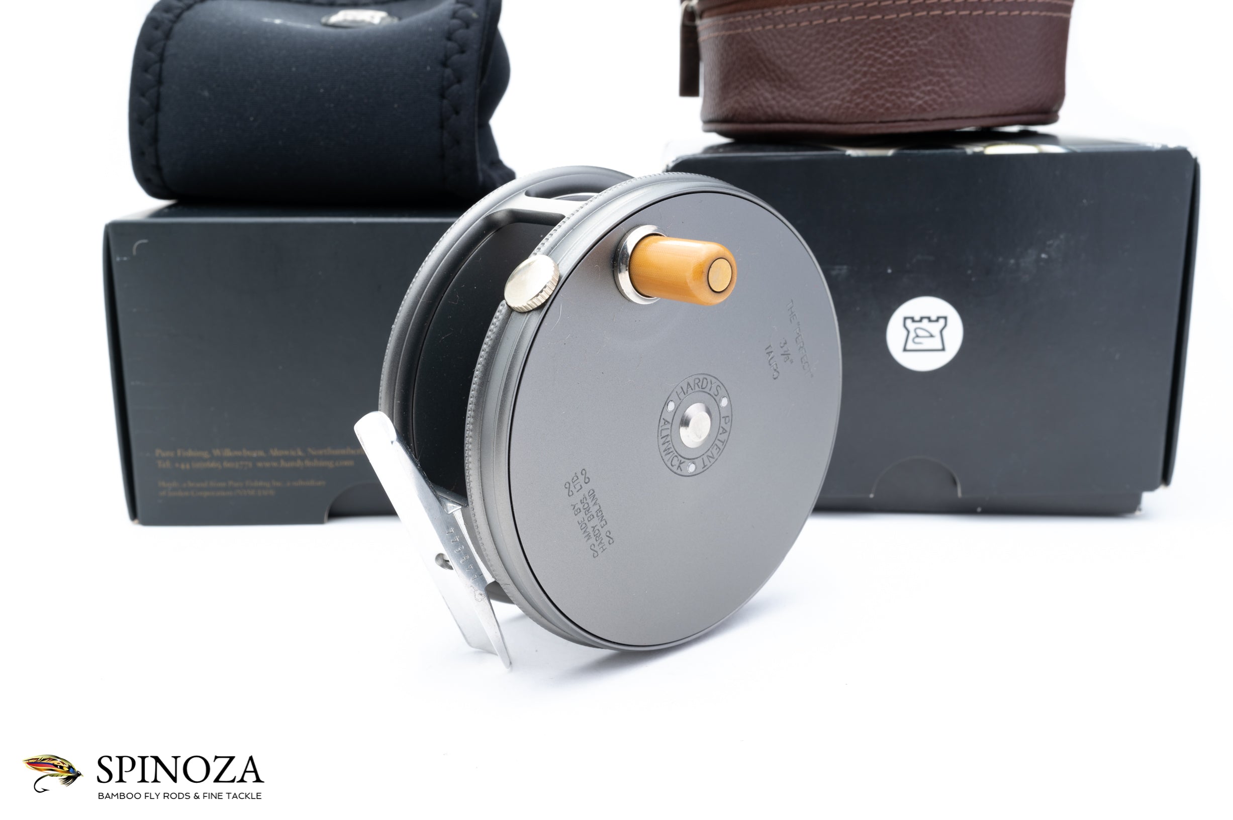 A nice Hardy Perfect Taupo fly reel with a spare spool. This is the modern re-issue of this rare early model. 3 7/8" and weighing 7 1/2 oz. Near mint condition with very slight marks on the reel foot and one tiny scuff on the edge of the frame, though they are very tiny. Very clean reel throughout. Currently set up for RHW but can be easily switched. A nice size here for heavy trout, landlocked salmon, or light salmon or steelhead angling. The reel comes in the original leather fleece-lined pouch while the spool comes in a neoprene case, and both have the original Hardy boxes with paperwork.