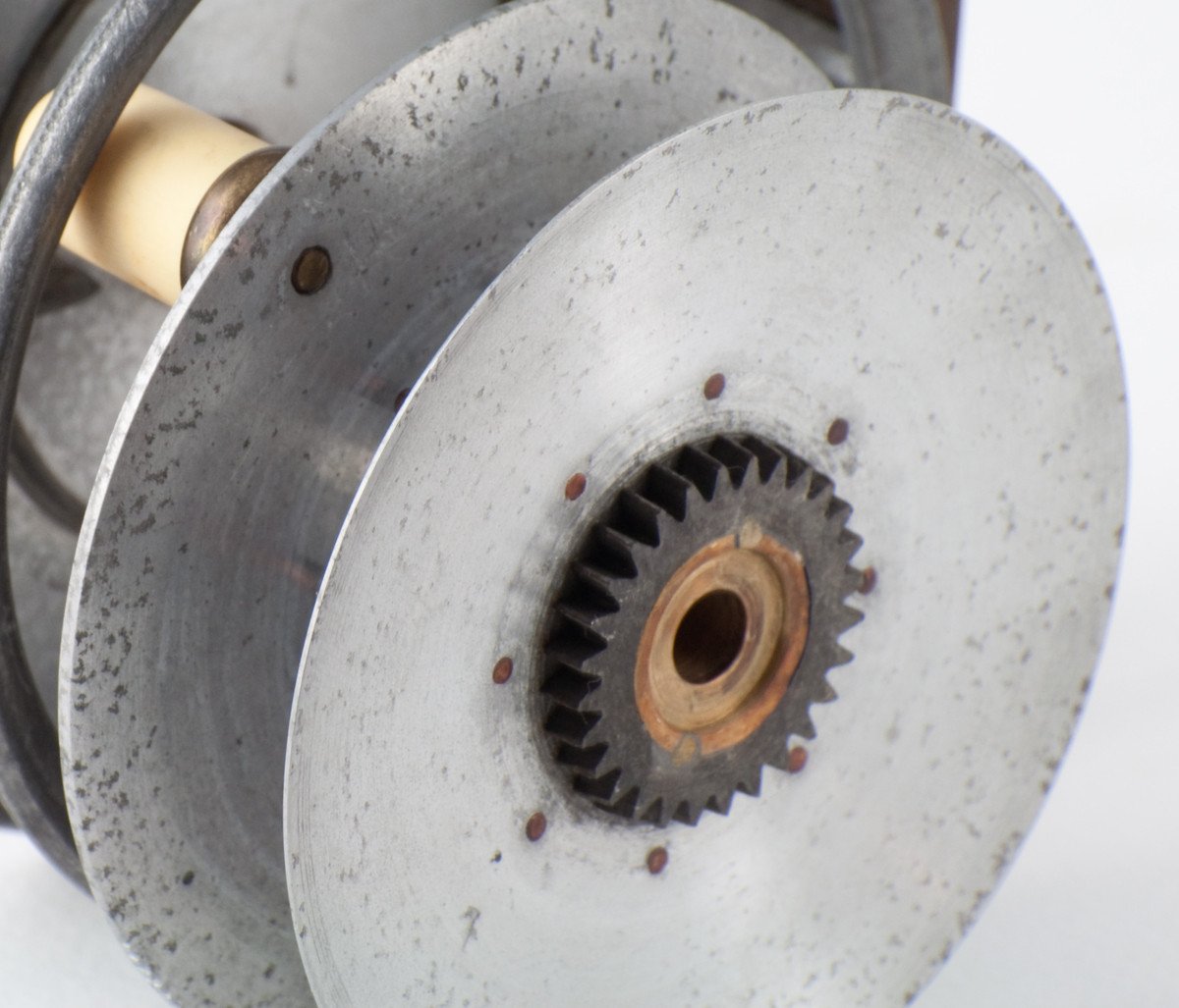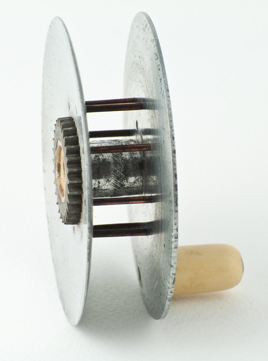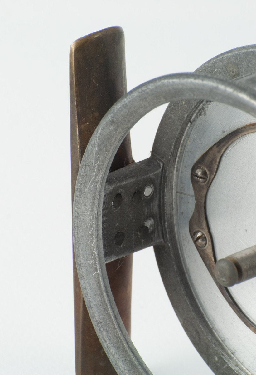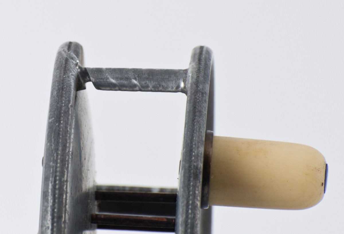 For sale here is a very scarce and early Hardy Uniqua model - 3 1/8" diameter with the early flat caliper spring check. Marked Hardy's Patent "Uniqua" Reel. Ivory handle. Mechanically the reel is still in good condition with a RHW fixed check and some end play like most Uniqua-style reels. The original 3" long smooth brass foot is unblemished. No cracks, chips, or dings. As you can see in photo #5, the stripping pillar does have a substantial groove in it (only 1/4 of the pillar remains in that location!) What makes this reel possibly unique is the brass pins / caged spool configuration that could have been done at the Hardy factory or perhaps an after-market addition. A very nice and rare old Uniqua!