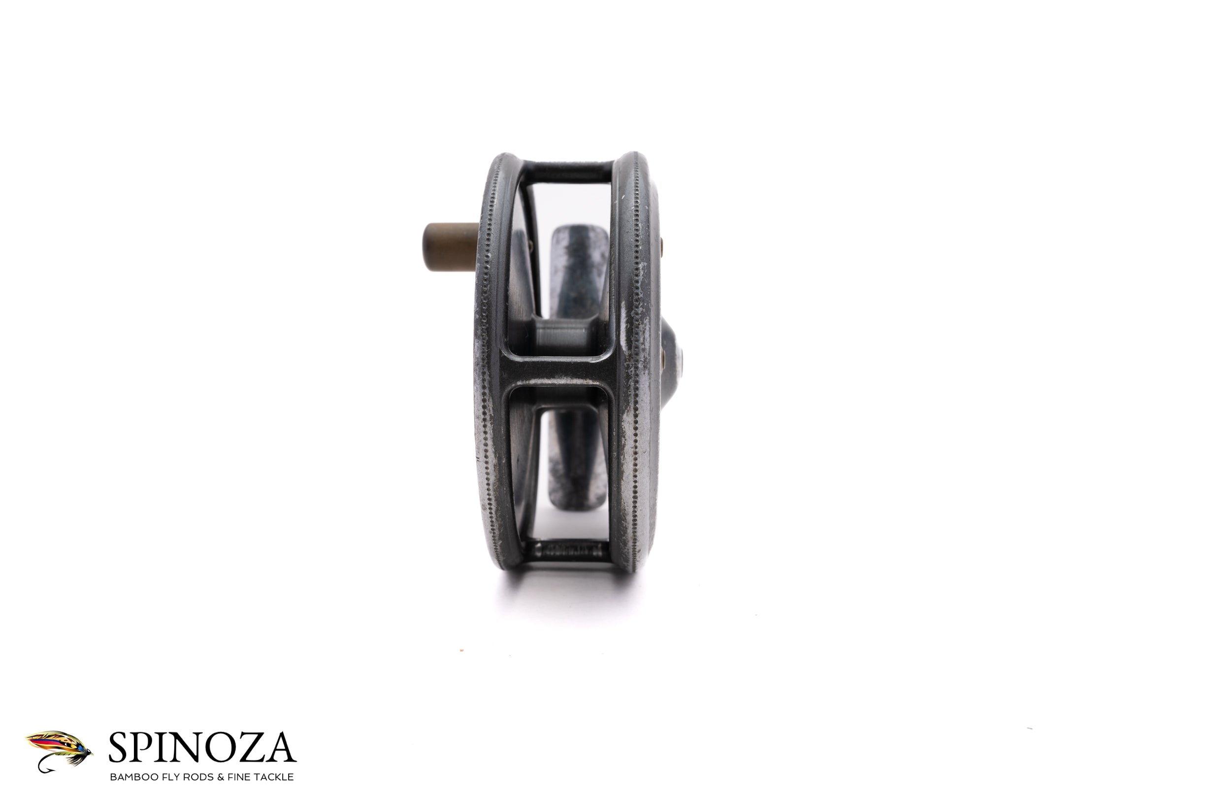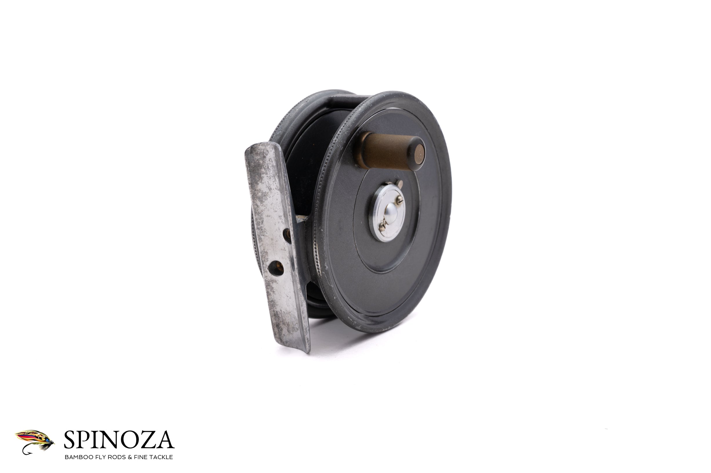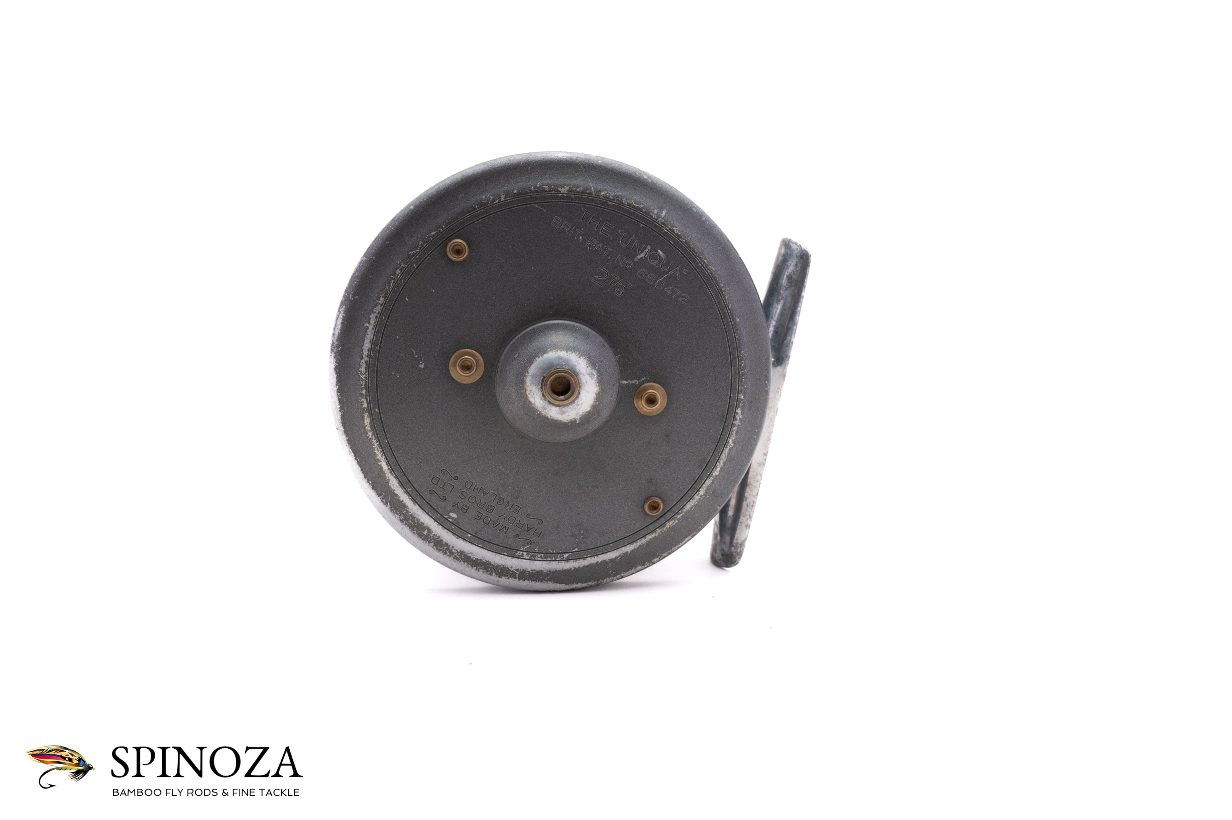A Hardy Uniqua fly reel, 2 7/8" diameter and set up for RHW. Later enamel model. Good used condition with some moderate cosmetic wear throughout with some finish loss concentrated around the frame edges. Mechanically the reel is sound with a nice click and tight spool. Smooth alloy foot and a dark caramel colored handle. No bag or pouch.