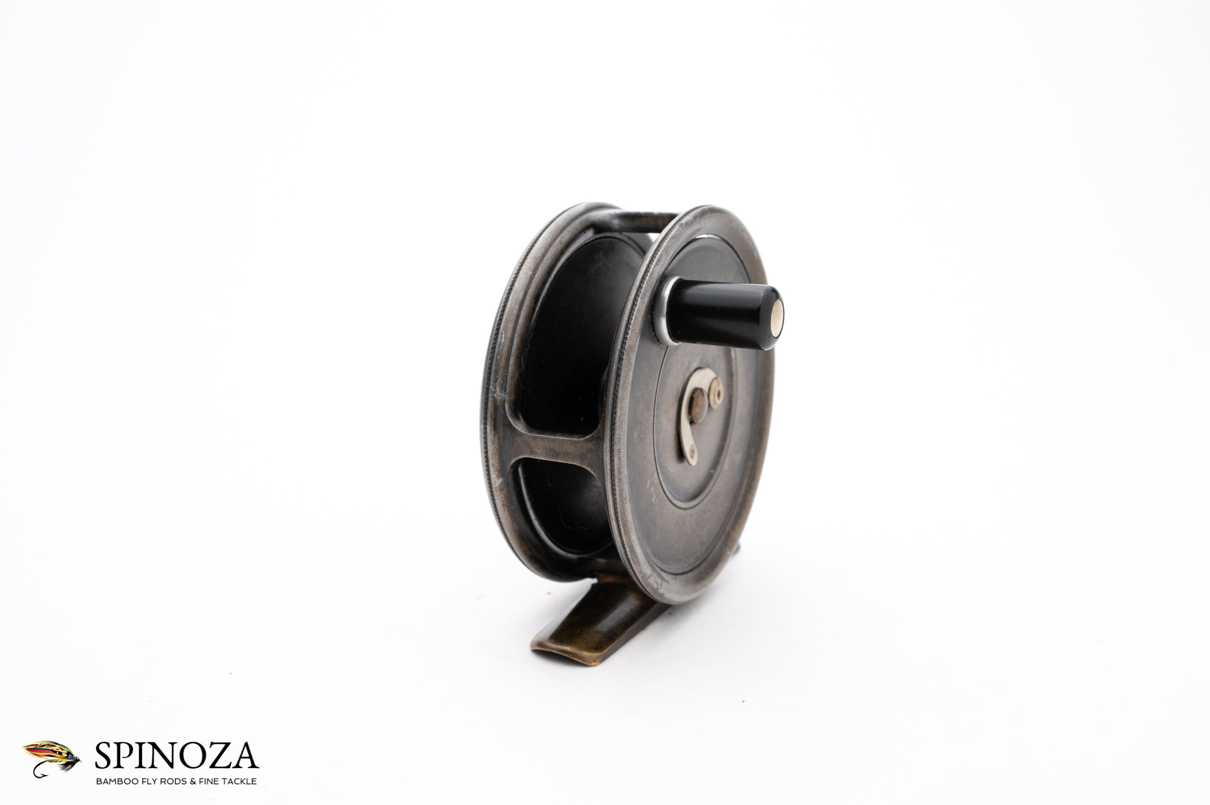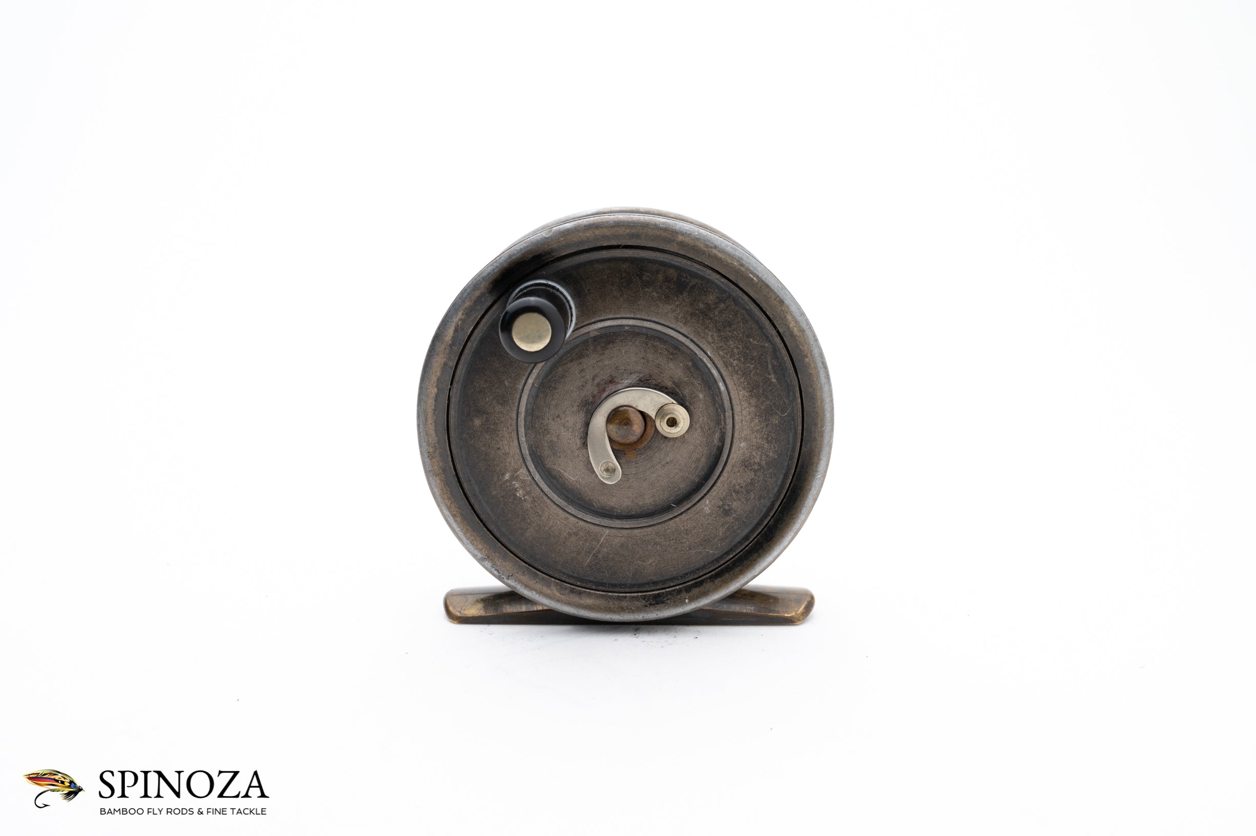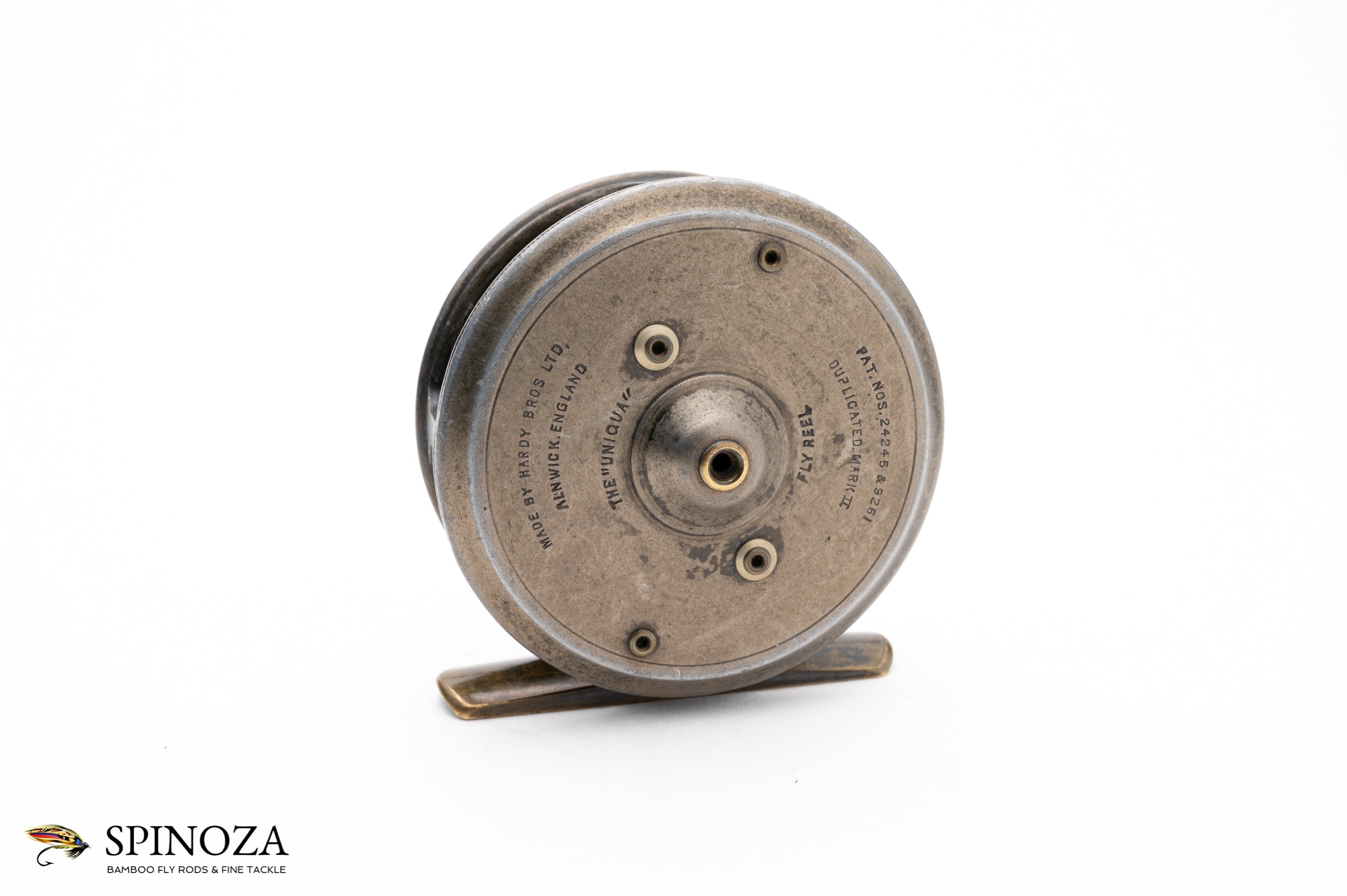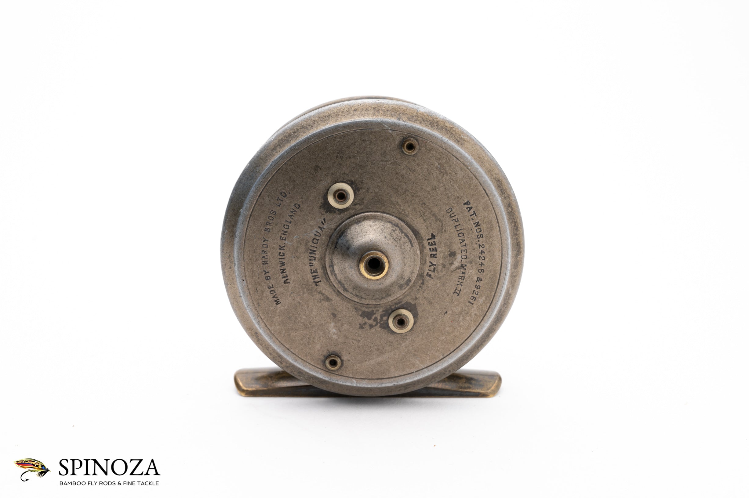 A nice Hardy Brothers Uniqua fly reel in a rare 2 5/8" size. RHW. Circa 1925 production. This little Uniqua was the smallest size of this model that Hardy made, and it has a smooth brass foot and the early horseshoe latch. It comes with the MKII check, and it is at least 95% of its original leading is intact. There is no spool wobble, and there are no line burns, dents, or scratches. A great little example of this collectible size.