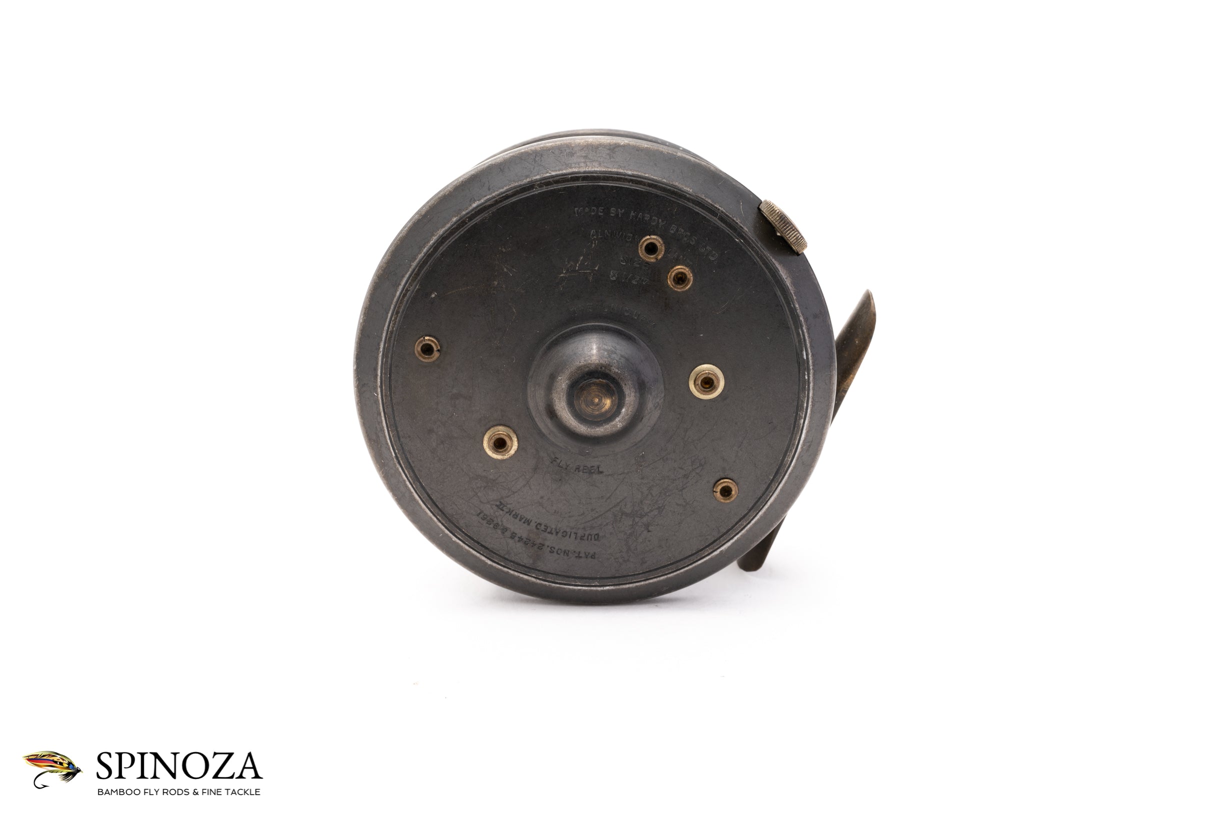 A nice Hardy Uniqua salmon reel, 3 1/2" in size. Set up for RHW though it's fairly close to having a neutral bias. Duplicated Mark II check and the graceful "telephone" latch design secures the spool. Good used condition for a reel of its vintage with minor cosmetic wear here and there though nothing especially noteworthy. The reel foot has been altered however with both ends filed and one side is about 1/8" or so shorter than the other. Mechanically the reel is tight and sound.
