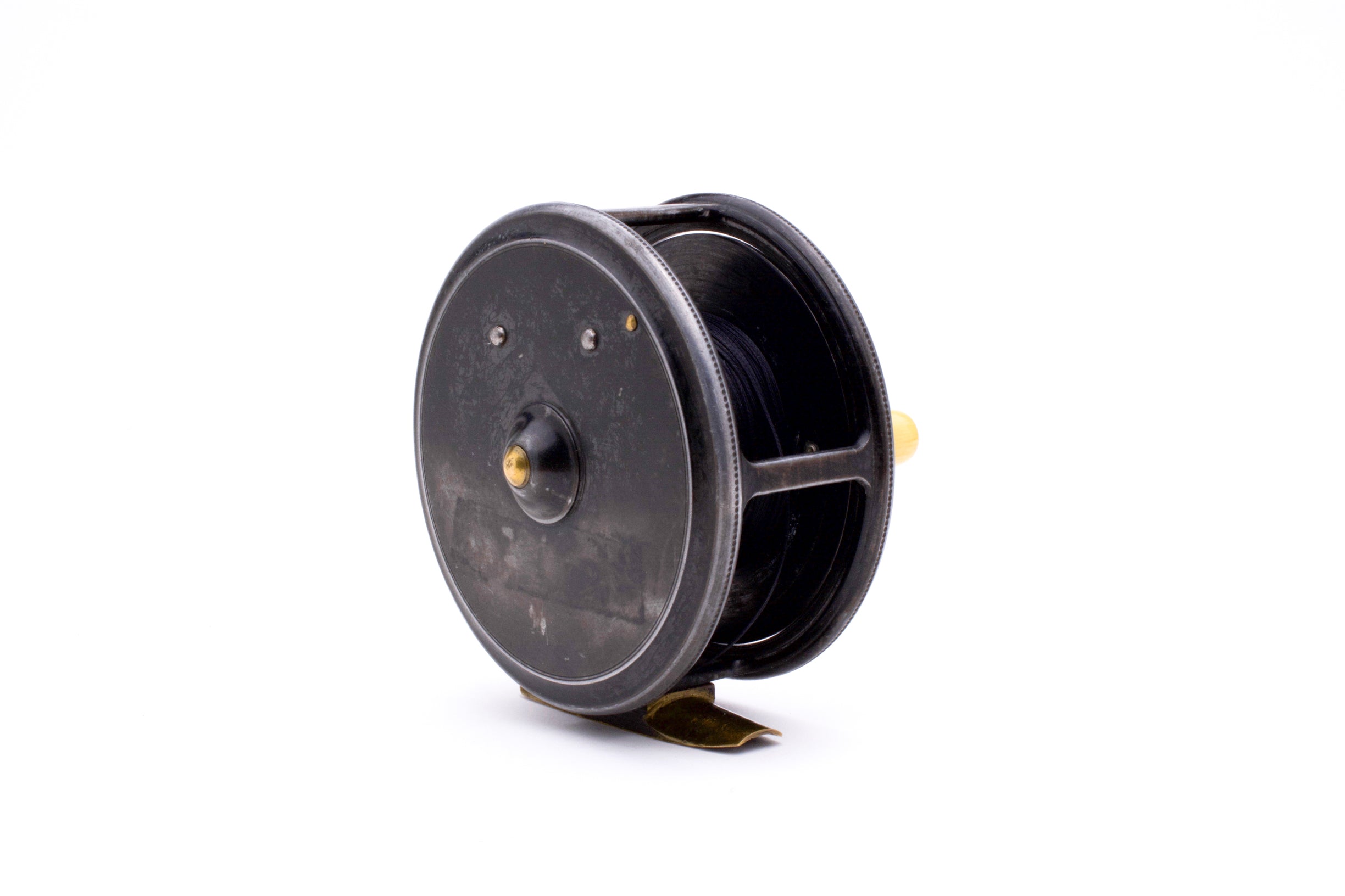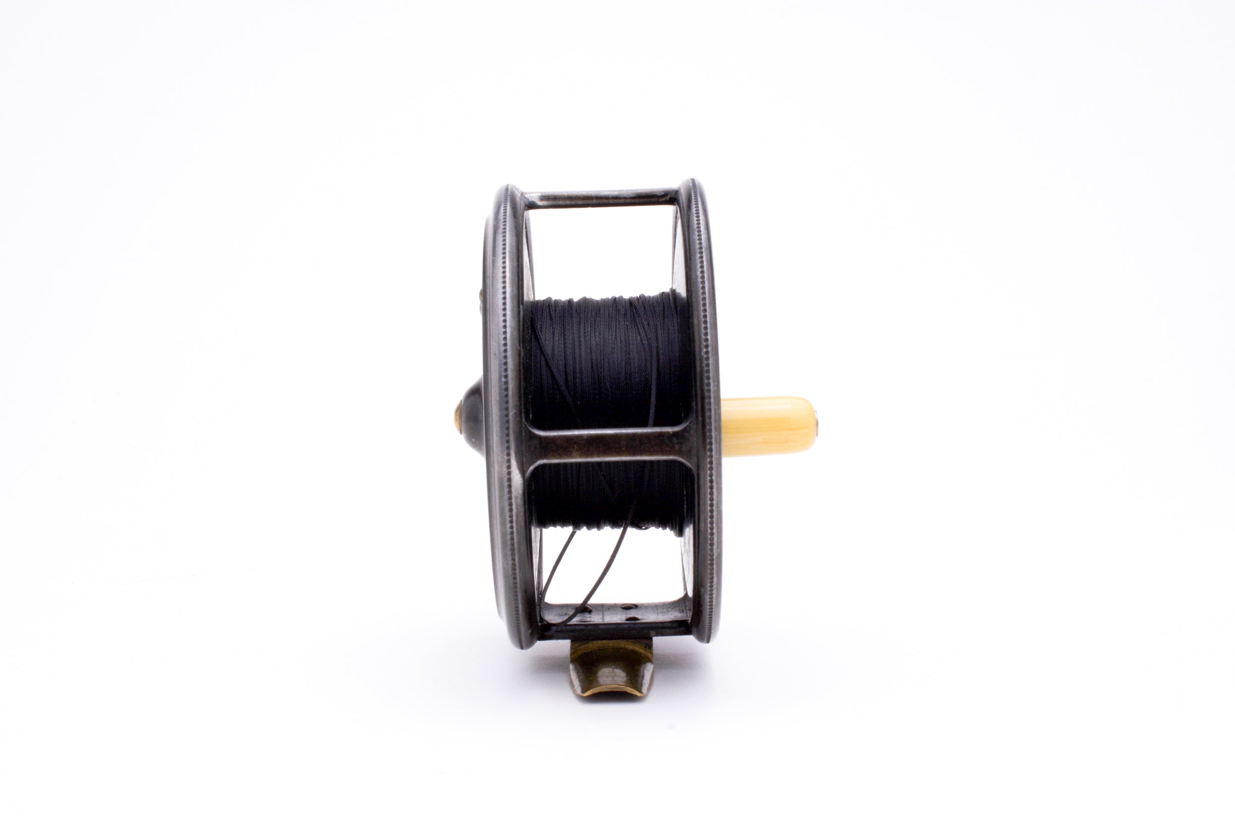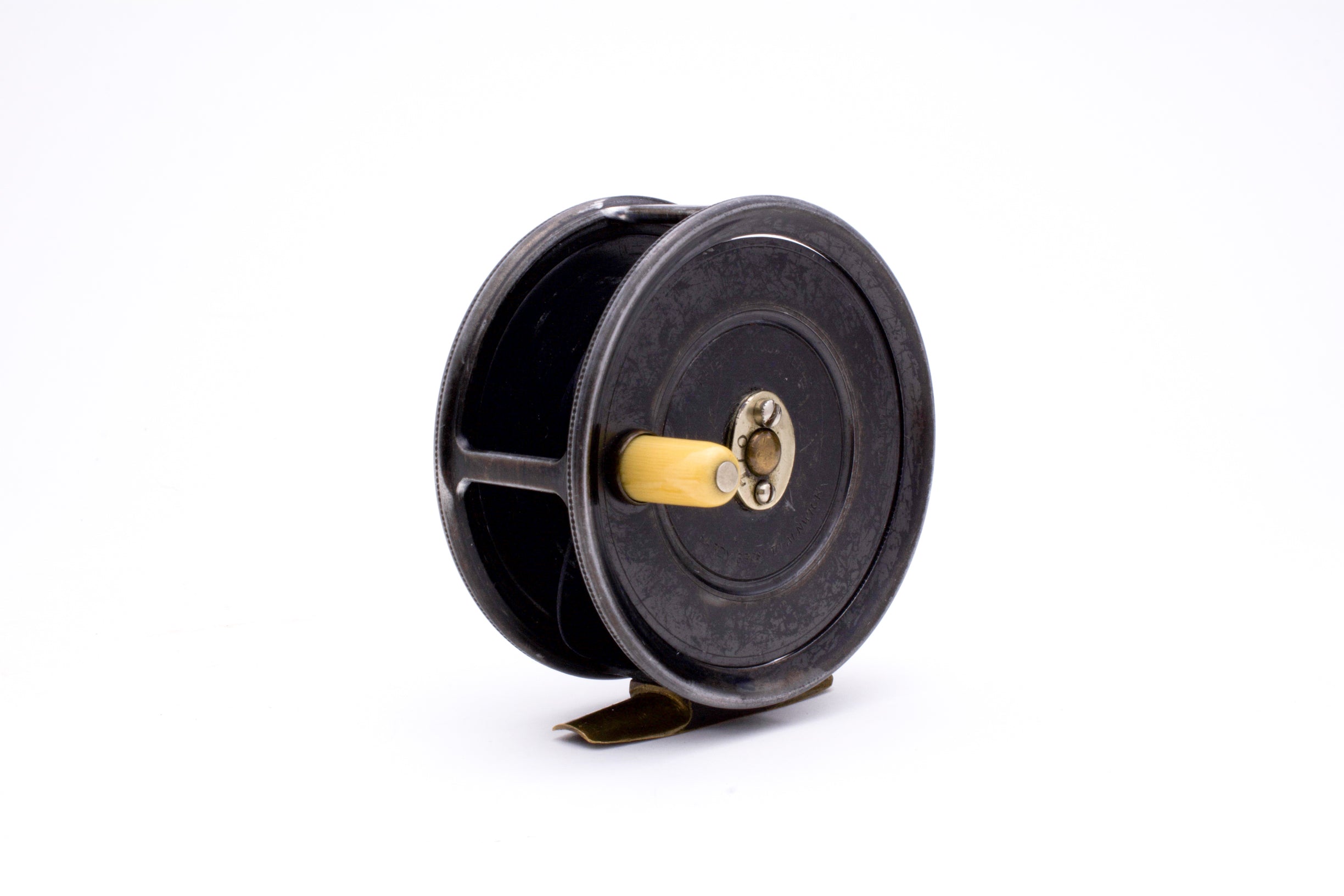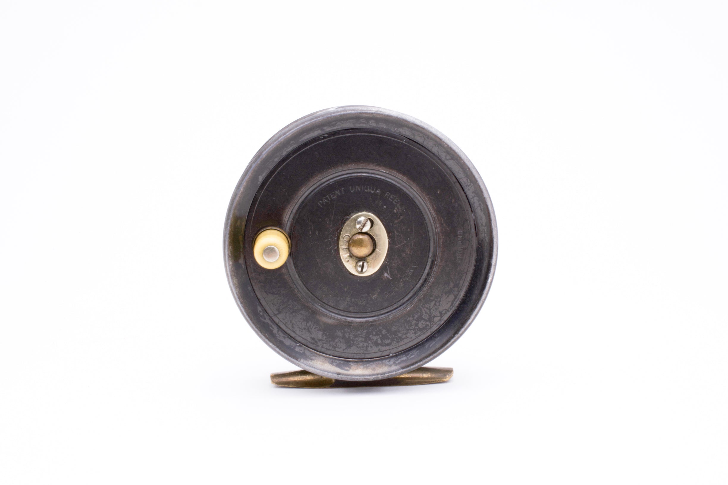 A nice Hardy Uniqua Wide Spool reel, 3 1/2" in diameter and built for RHW. Excellent used condition. Nice and tight with very little wobble and a handsome patina (there is an outline on the non-winding plate where a sticker likely resided at one point). Nice ivorine handle. Has some black dacron backing still on it and comes in a Sage neoprene pouch.