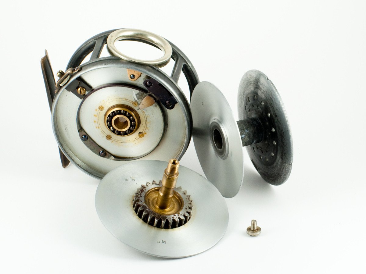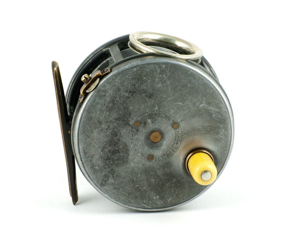 For sale here is a 3 3/4" wide drum Hardy Perfect fly reel with 1906 check and rotating nickel silver line guide. RHW. Much of the original leading remains. The tensioner (with Turks locking nut) works great throughout its range. No wobble and very little end play. The ivory handle spins freely. Stamped "5" throughout. Smooth brass foot is full length and unfiled. The patina of the not-often-seen line guard mounting bracket matches that of the foot perfectly. No cracks/chips/dings. A rare reel in excellent condition that needs to get back on the water!