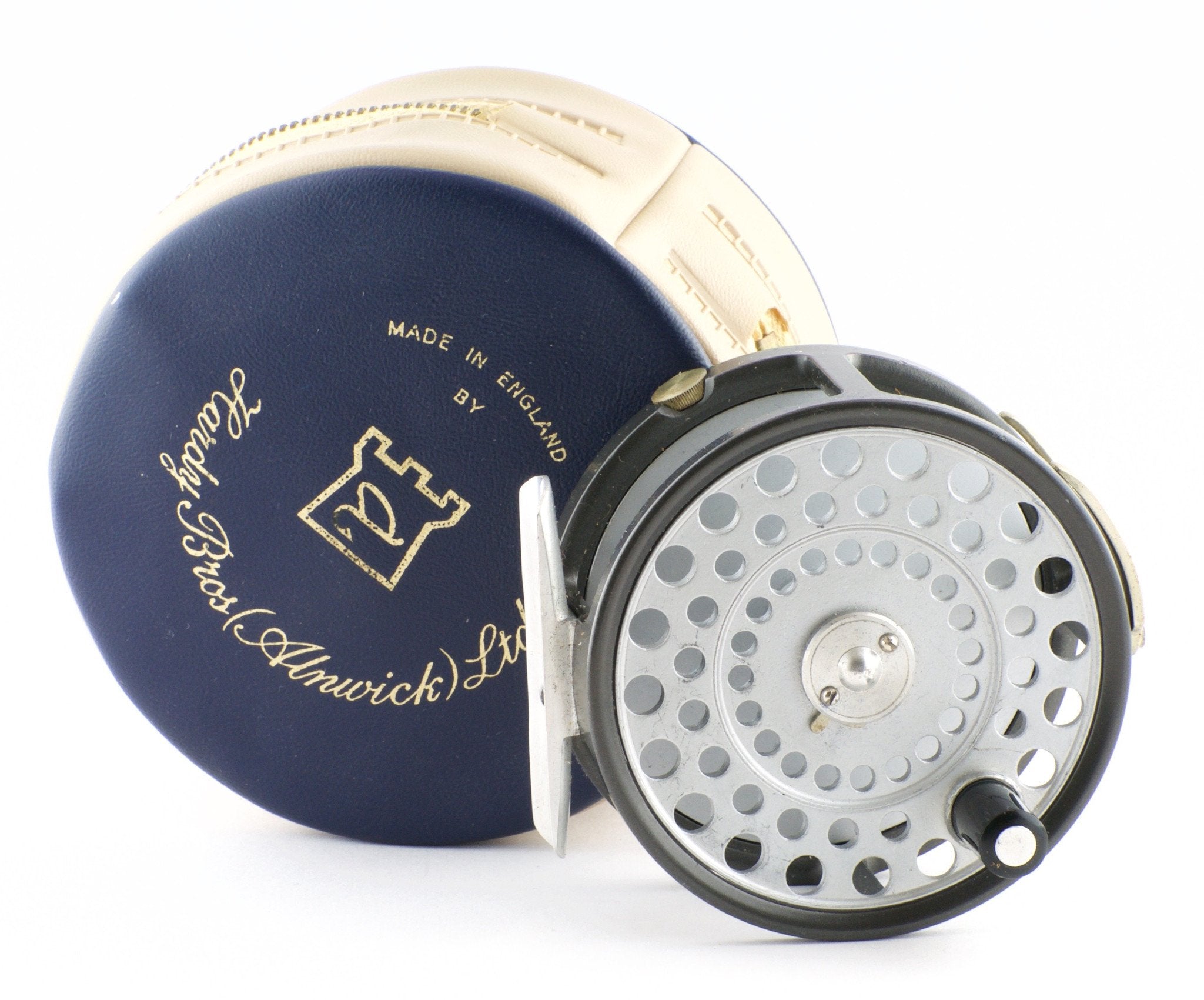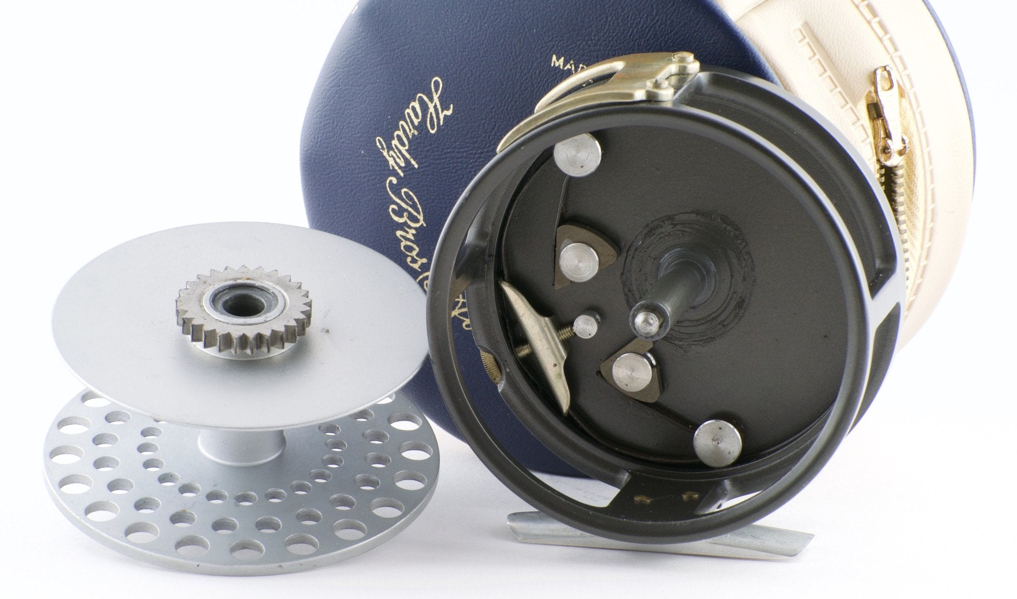 For sale here is a Hardy Zenith wide drum reel. LHW or RHW. Excellent+ condition. Reversible two-screw U-shaped nickel silver line guide. The Zenith was part of Hardy's Lightweight Series of reels. This was one of two wide drum Lightweight models made in the mid to late 1960s, the Husky being the other. Both were 3 3/8" diameter. Spool width 1 3/16". The reel weighs 6 3/4 oz. Capacity is WF9F plus 80 yards of 18# dacron backing.