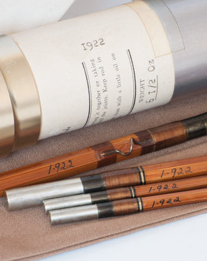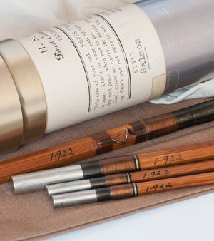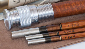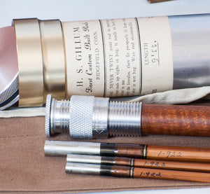 For sale here is a Harold S. "Pinky" Gillum salmon fly rod in unused condition -- his "Stagg Special" model. Nine feet with three sections and two tips. Original bag and tube with label in fantastic condition. Label weight is 6 1/2 oz. Actual weight on my scale is 6 3/4 oz. Serial number I-922 circa 1961. The widely accepted thought was that Gillum produced about 1000 rods in his career. The Super-Z ferrule fit remains very tight and excellent. The black and white (looks gold) silks on the winding check wraps and male ferrule wraps are classic Gillum. Each rod section is arrow straight. The rod also comes with a detachable fighting butt and separate slip-cover that fits over the tube.