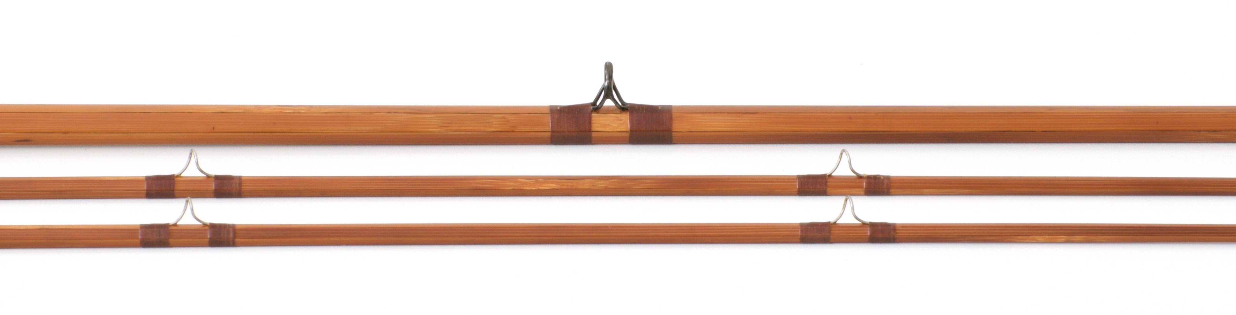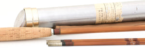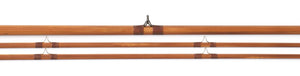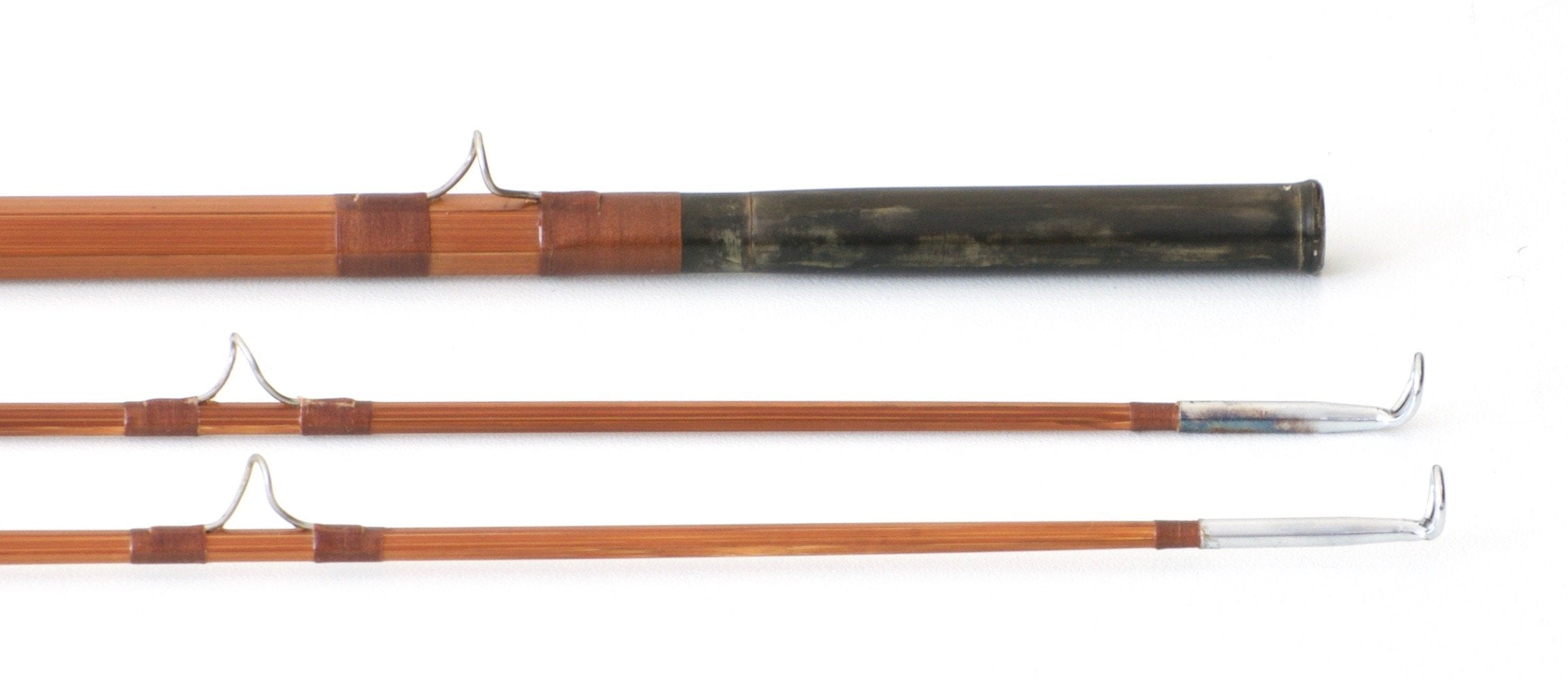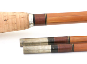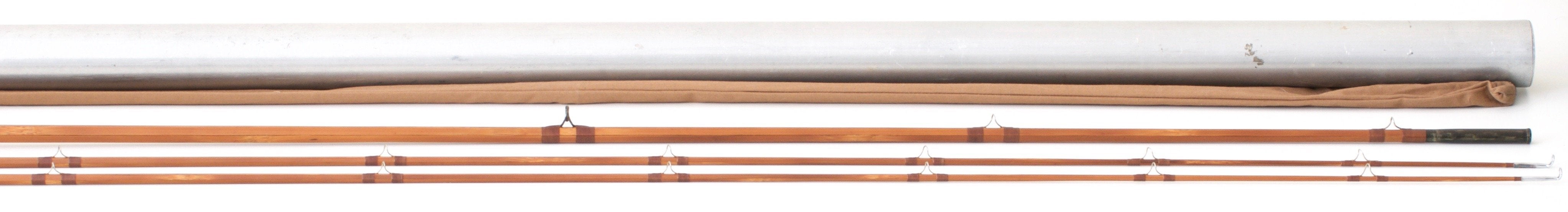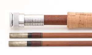 Fine hand brushed matte finish and resorcinol glue lines. Chestnut silks with black and white tipping at the winding check and male ferrules. Bright guides. Reverse-half wells grip 7 1/8" in length with only light soiling. There are a few minor areas on the grip with filler. Bright aluminum up-locking reel seat over a walnut spacer. The knurled butt cap is removable to accept a fighting butt. The butt cap seats with a friction fit copper ferrule, the fit is perfect. The fighting butt is not included. The blued nickel silver Super-Z brand ferrules are size 18/64 with an excellent fit. Indented witness marks on the ferrules. The rod weighs in at an even 8 oz. The rod has a medium fast action and gives the impression it could cast line into the next county. Includes the original bag and tube with the label partially intact.
