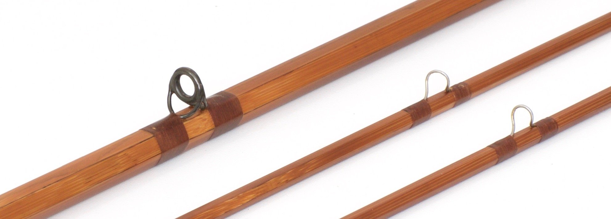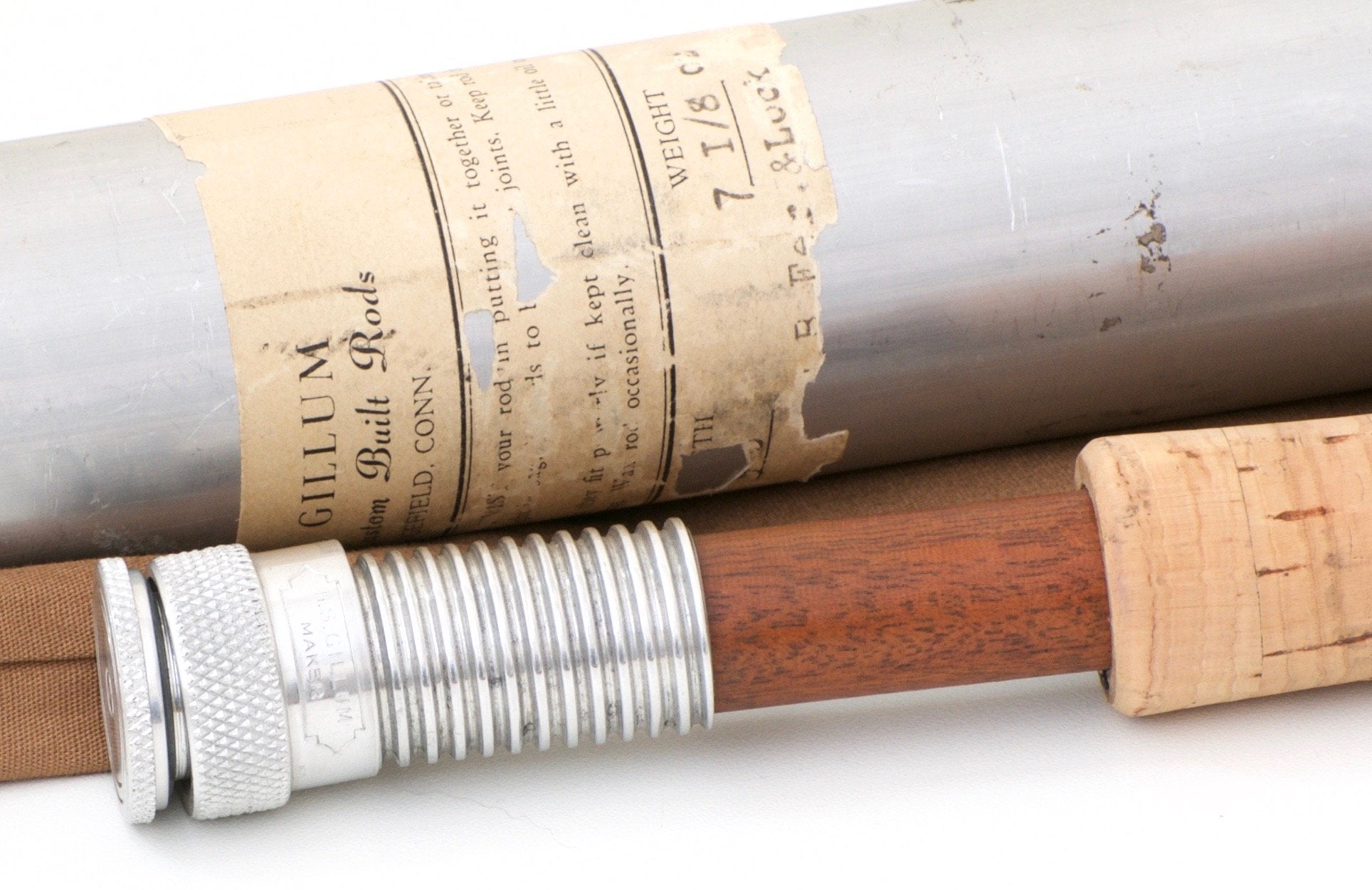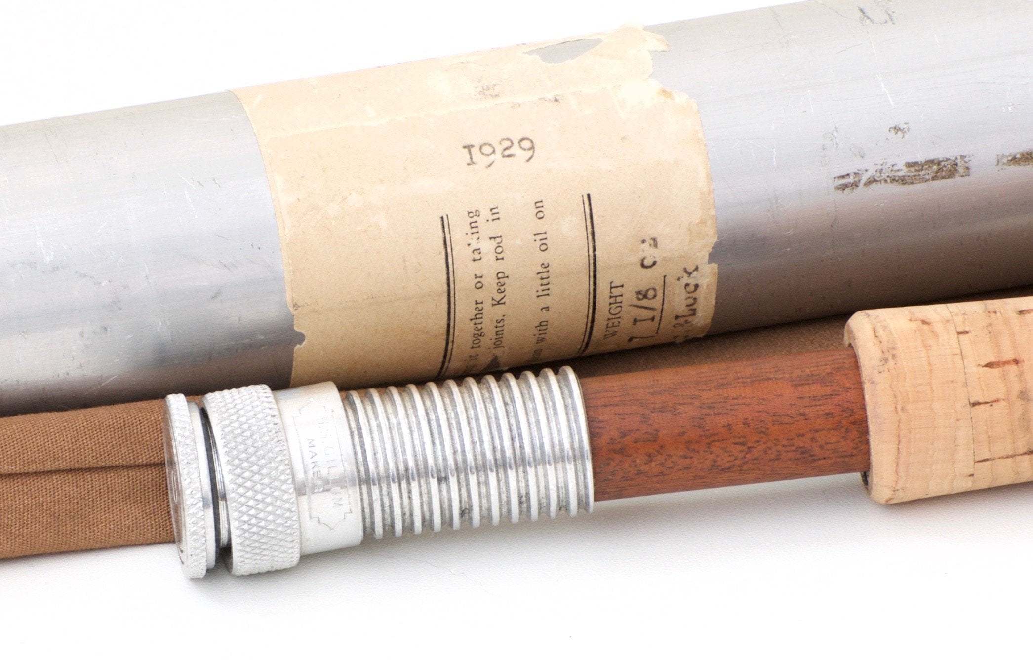 Fine hand brushed matte finish and resorcinol glue lines. Chestnut silks with black and white tipping at the winding check and male ferrules. Bright guides. Reverse-half wells grip 7 1/8" in length with only light soiling. There are a few minor areas on the grip with filler. Bright aluminum up-locking reel seat over a walnut spacer. The knurled butt cap is removable to accept a fighting butt. The butt cap seats with a friction fit copper ferrule, the fit is perfect. The fighting butt is not included. The blued nickel silver Super-Z brand ferrules are size 18/64 with an excellent fit. Indented witness marks on the ferrules. The rod weighs in at an even 8 oz. The rod has a medium fast action and gives the impression it could cast line into the next county. Includes the original bag and tube with the label partially intact.