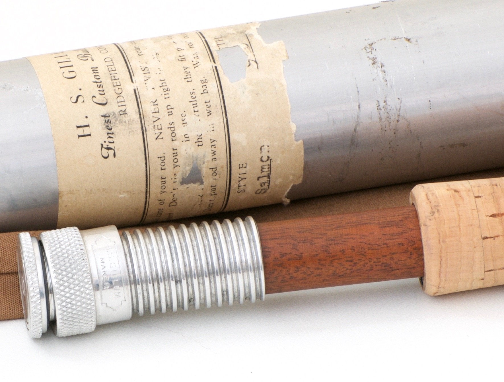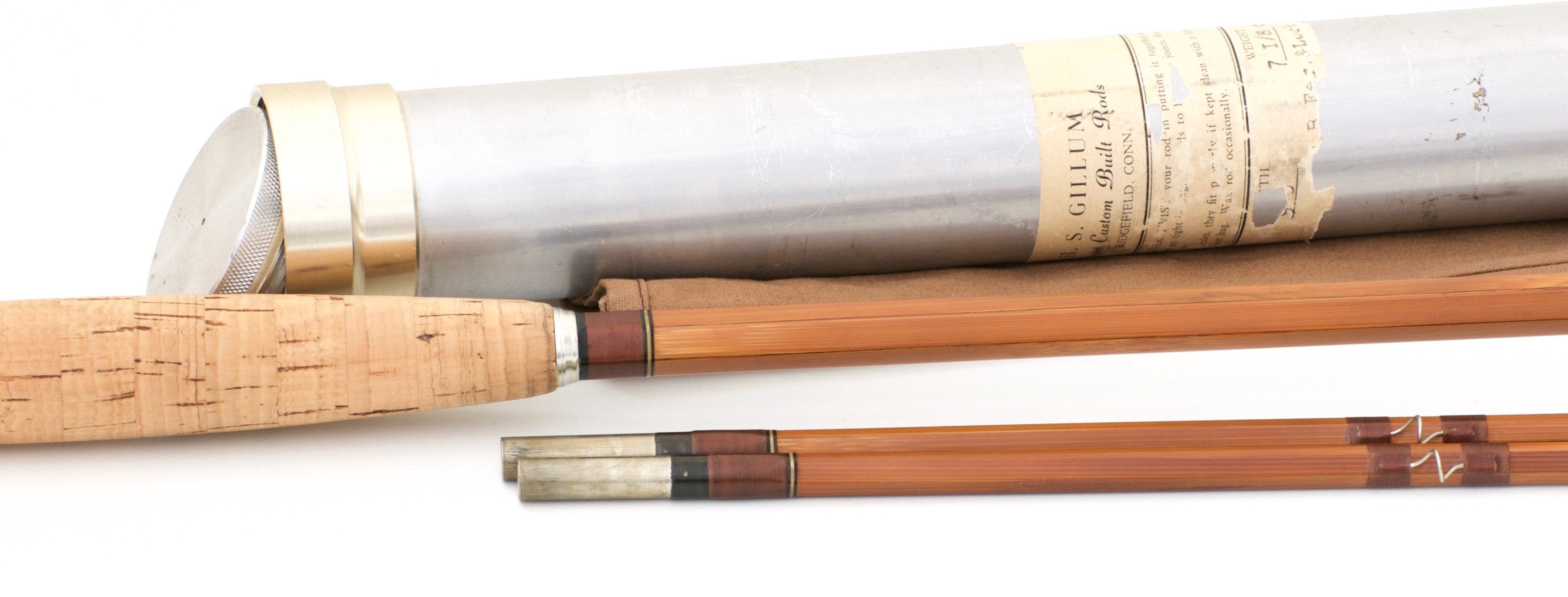 For sale here is a Harold S. "Pinky" Gillum 9'6" 2/2 salmon fly rod. Serial no. I929. The rod is in excellent+ condition. There are a few very minor use marks in the varnish. The last guide up on one of the tips exhibits very light fraying on the edge of the upper wrap. The winding check and wrap are both replacements. All sections are full length and arrow straight.