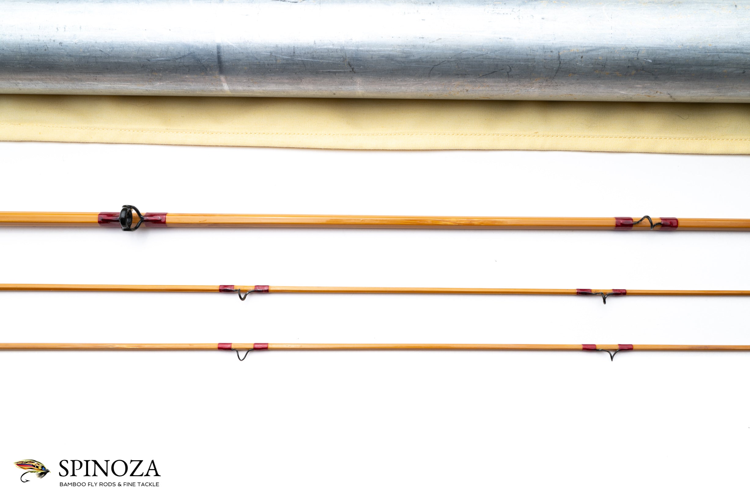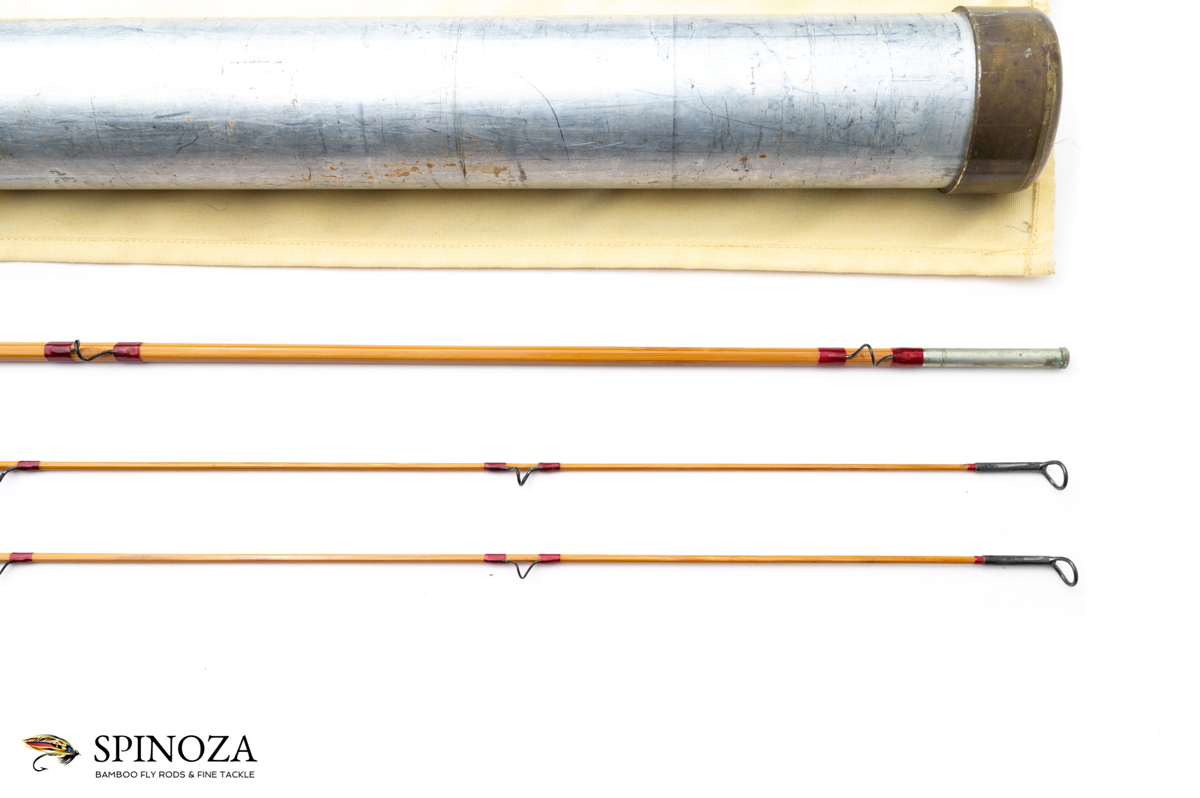 A very nice Leonard Model 38-L fly rod, 7', 2-piece, 2-tips, and built for a #3 or possibly even a #2. Serial #1257 which dates this to approximately 1970 or 1971. Very good used condition. Very slow, delicate action. Blonde cane done in a three up node pattern. Red wraps. Brush coated varnish. Black stainless snake guides. The keeper is one flat right and the serial number is lettered one flat left. The grip is 5" long, shaped to a medium cigar, and has some soiling from use. The reel seat is a varnished butternut cap and ring. The die stamp on the cap reads "HLL Leonard, Rod Co, Makers" in a cartouche. The ferrule fits are tight and the rod is nice and straight. This is a fairly rare model, the first one I have handled in quite a while. The rod packs into a yellow cloth bag with stiffener and an aluminum tube with brass hardware.