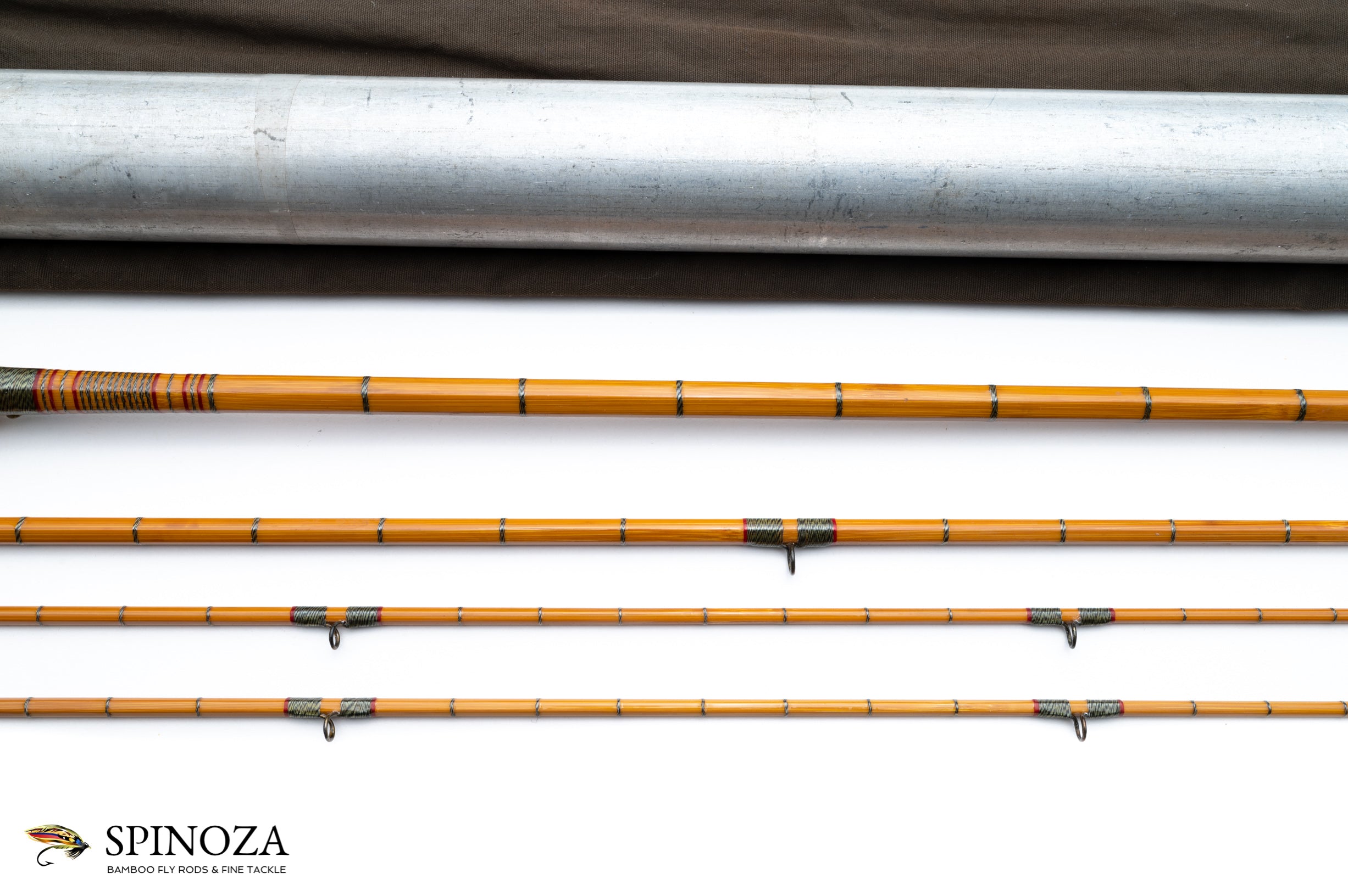 An HL Leonard Hewitt Tournament bamboo fly rod, 8', 3-piece, 2-tips, built for what feels like a #5. Medium fast action. 4.1 ounces. Restored condition. This is the "Hewitt" model if the restoration is accurate. The main wraps are black and white jasper with red edges. Signature wraps in jasper and red and full intermediates of black and white jasper. Agate stripper and "circle" snake guides. The tip tops are perfection taper tubes with the patent date and small hoops with almost no sign of wear. All the hardware is polished and the step ferrules are the pot belly type with the patent date stamp on the female. All rod sections are full length, show no signs of damage, and are straight. The temper color is medium blonde and the nodes are done in a three up configuration. The grip is 5" long in a medium cigar and done in 3/8" corks. The reel seat is butternut wood with a cap and ring. The butt cap is stamped "The Leonard Rod, HL Leonard Rod Co, Makers" in a cartouche and on the reverse "Tournament". The poplin rod bag is dark brown in color and has no hang tag but looks correct for the period. The rod tube is also correct for the period with a large brass collar and top. An interesting historical and rare model.