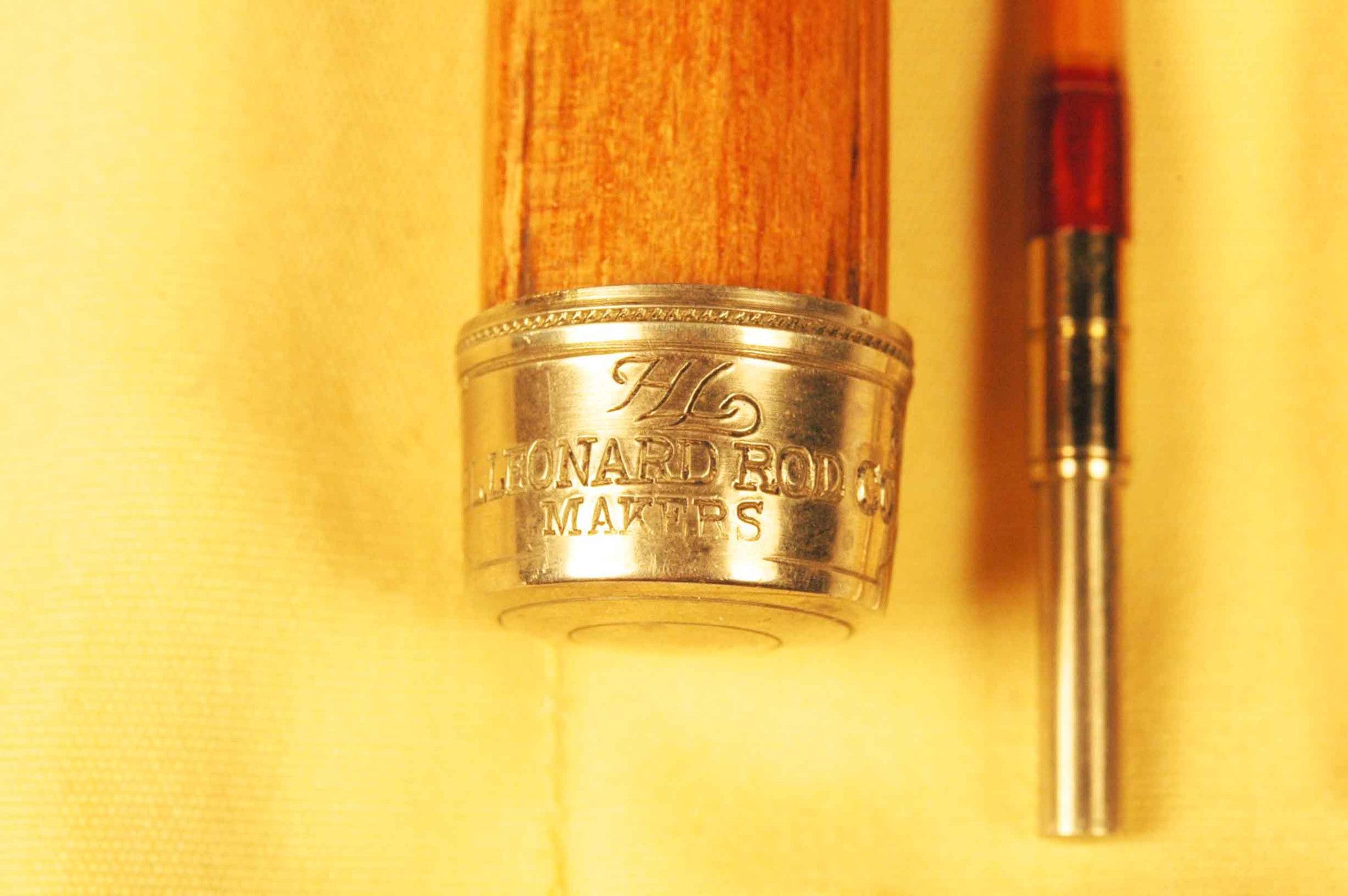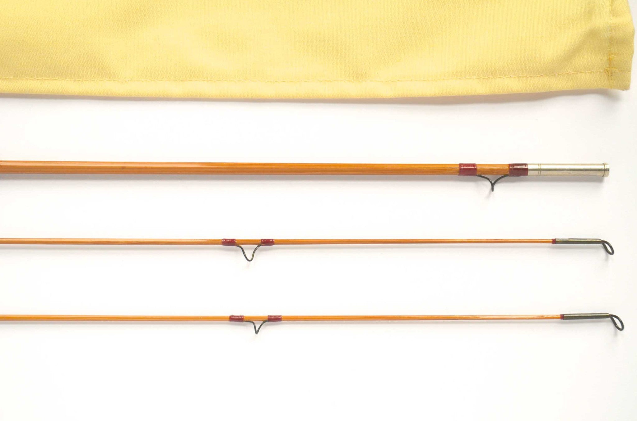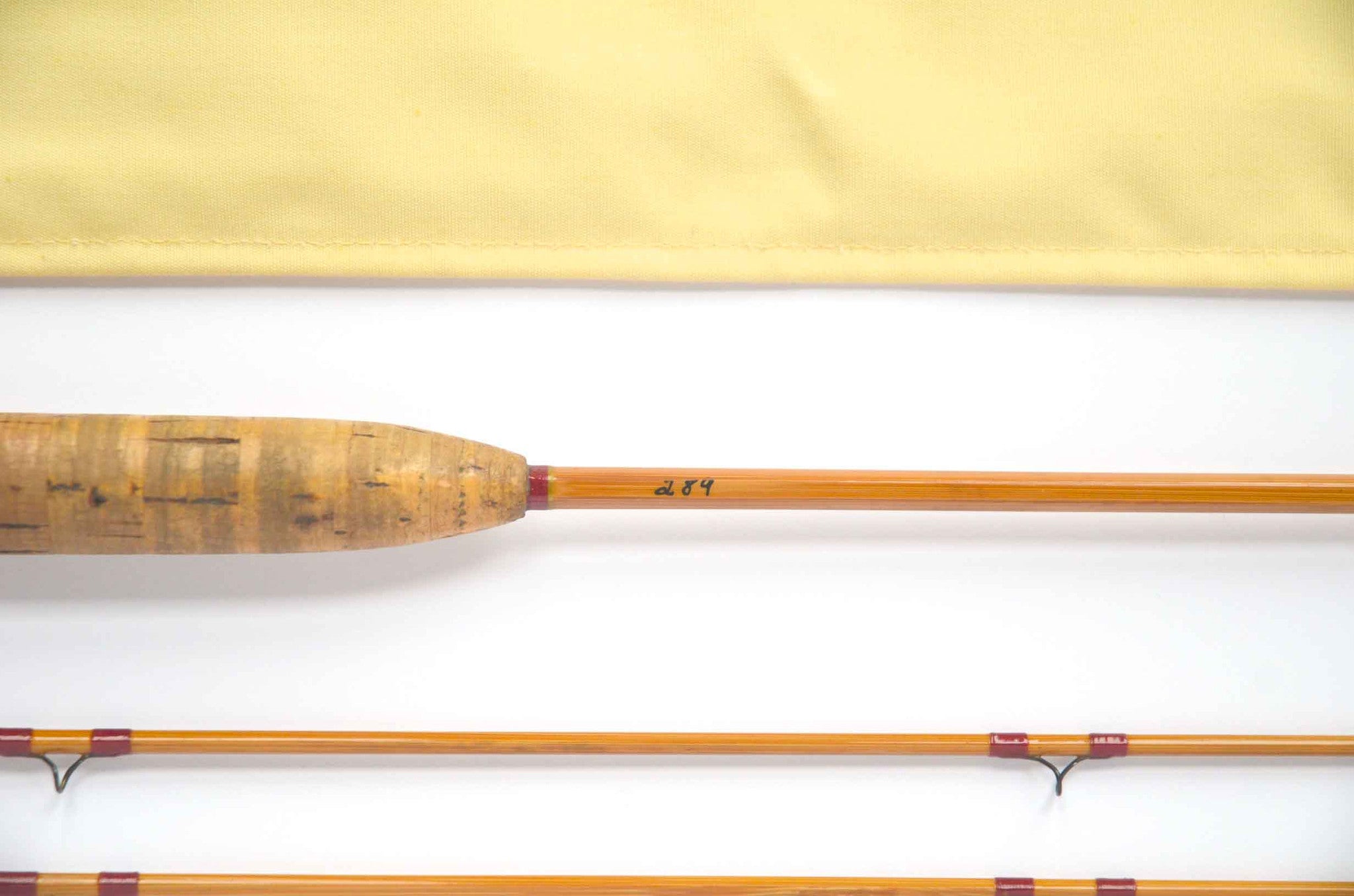 A Leonard 37 ACM Baby Catskill rod in superb condition. This rod is a rare find, with Leonard making relatively few of these models. The rod boasts Leonard's red wraps and bright hardware with the "wedding band" style ring. The cork grip has very slight soiling on the grip. The rod has been fished very slightly but is still in excellent shape. The original owners name "R.B. Julius" is written on the butt section, and it comes with the original tube, cap, and bag with a wooden stiffener. The serial number is 289.
