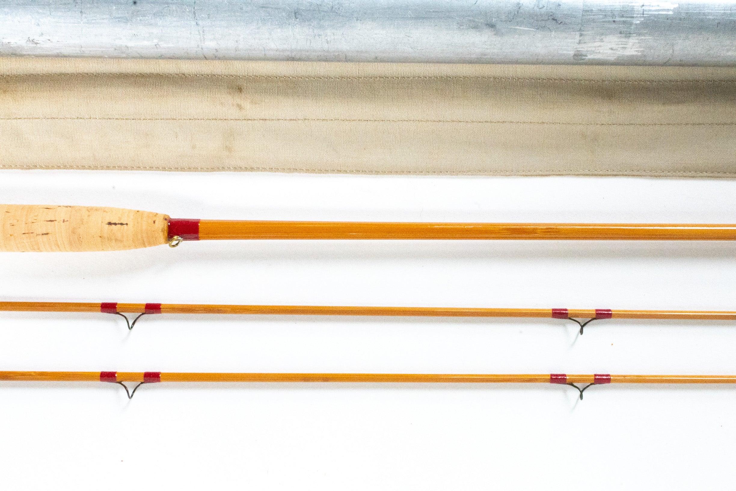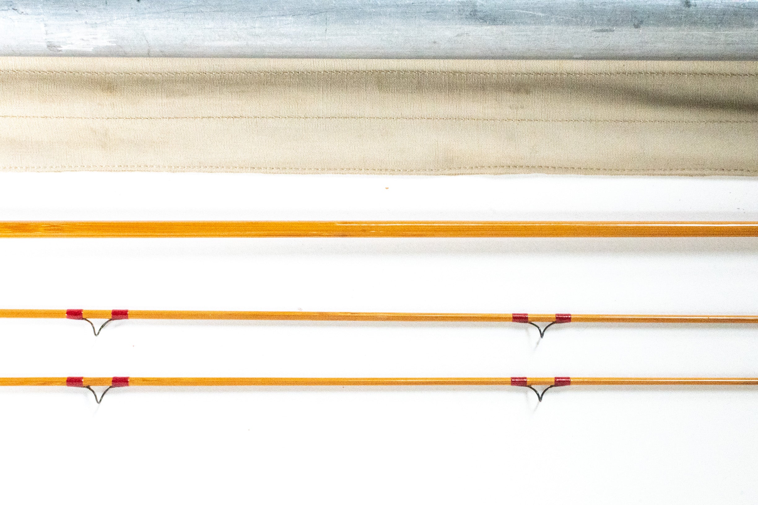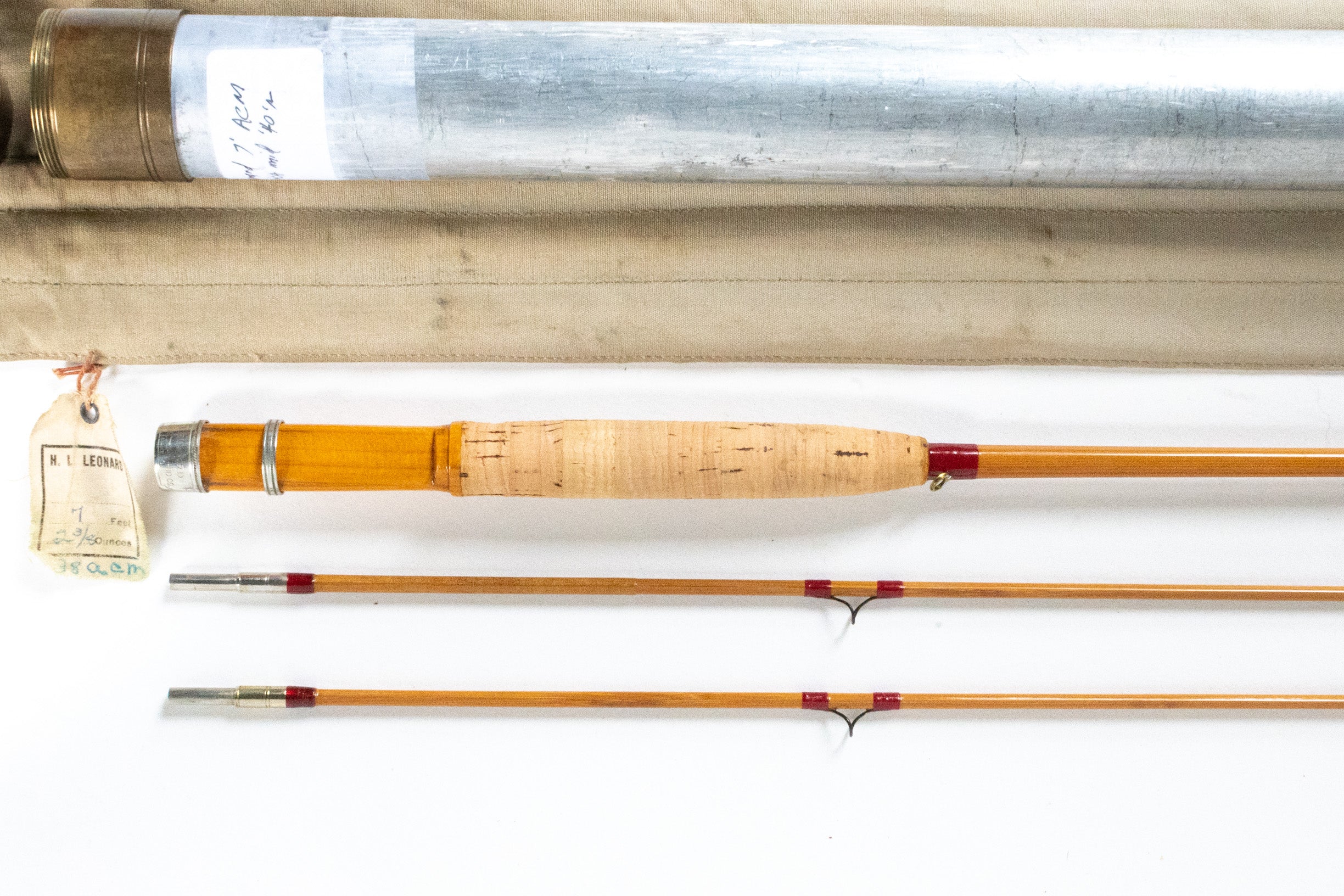 A nice H.L. Leonard 38 ACM fly rod, 7', 2-piece, 2-tip, built for a #3 line. Medium slow action. These ACM models are very hard to find! This one is refinished and the sections are full length and the ferrule fit is good. One tip is in very good condition and the other has two clear wraps. The first clear wrap is at the bottom between the guide and the ferrule. The other starts at the base of the top guide and extends down 1 7/8". The wraps are red and the snake guides show some wear. The tip tops are the large hoop pear shape and I suspect they have been replaced. The varnish is good, in fact too good to be brush technique, and was likely dipped. The keeper is 1 flat right. The grip is 4 1/4" long in a slim cigar shape with no front or rear cork check. The grip shows a lot of erosion near the bottom where the wood lip of the reel seat meets the grip. The seat is varnished white cedar and the cap and ring are tiny, probably made from a tapered spun cap. The die stamp on the butt cap reads "Leonard Rod, H.L. Leonard Rod Co., Makers" in a cartouche. The bag and tube are original. The hangtag states "H.L. Leonard, 7 feet, 2 3/8oz, 38 ACM". A very hard to find light line model here.