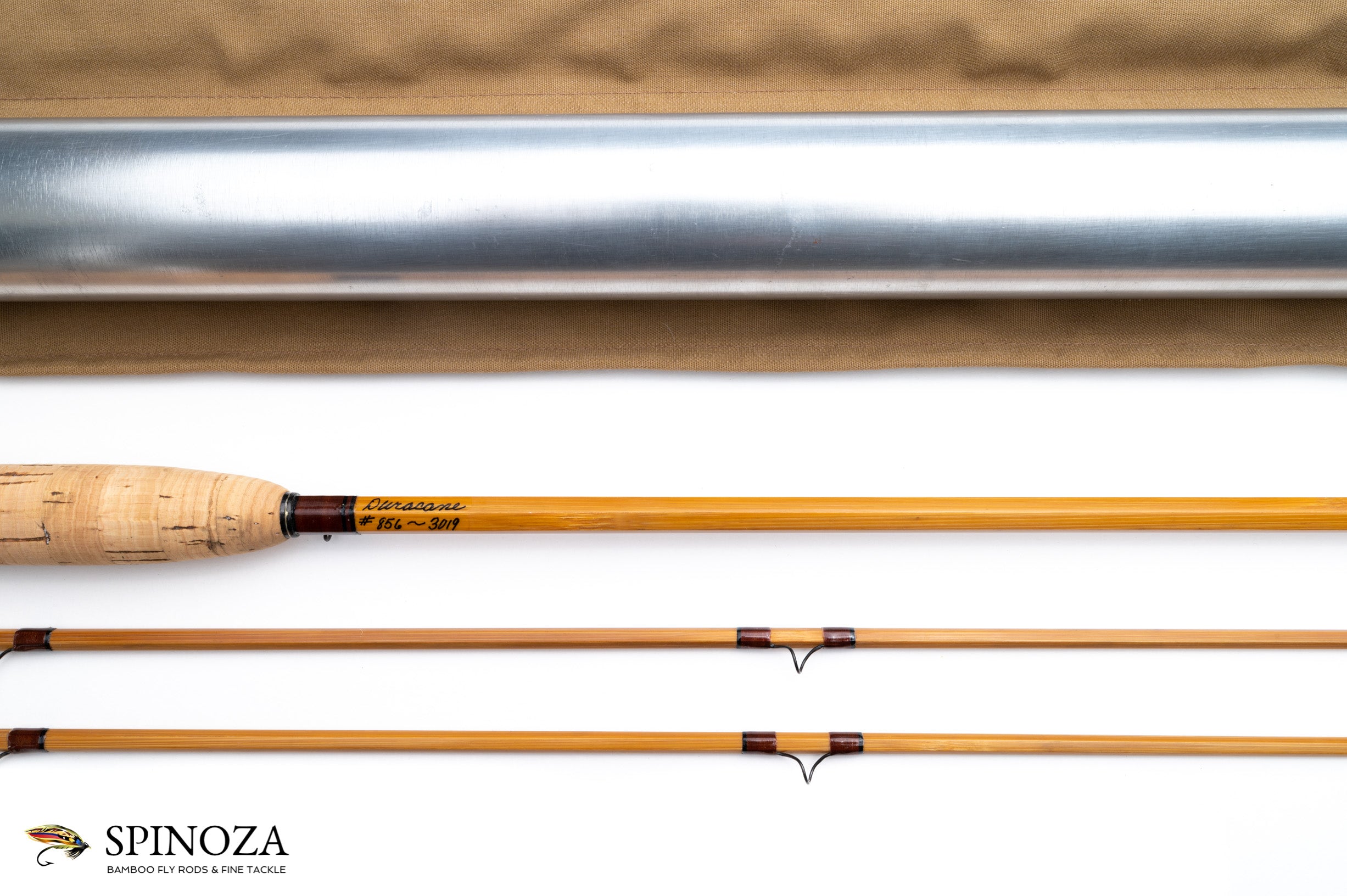 A nice Leonard Duracane fly rod, 8'6", 2-piece, 2-tips, built for a #6 line. Serial number #3019. 3.9 ounces. 1975 or 1976 manufacture date. Good used condition. The grip has been cleaned and the guides show a modest amount of wear. There is a small amount of brassing to the ferrules and hardware. Medium slow action could also use a #5 line to speed it up a bit. The cane is impregnated and is a wheat straw color in a three up node pattern. The wraps are brown with black edges with an extra band of brown and black at the keeper, male ferrules, and tip tops. Ceramic stripping guide. The grip is a 6" long blunt cigar with an all cork seat consisting of an oxidized nickel silver ring and pocket cap. The cap is stamped "HLL, The HL Leonard Rod Co, Makers" in a cartouche. This rod is packed in a light brown bag with a stiffener and a brushed aluminum tub with a brass collar and top (the tube collar has a split which allows it slide slightly but should be easy to re-glue).