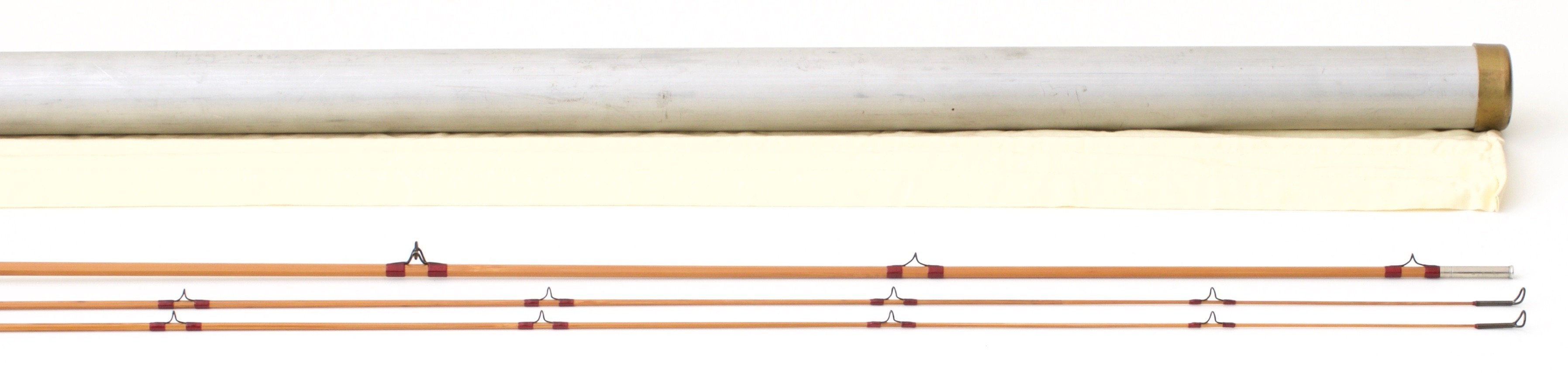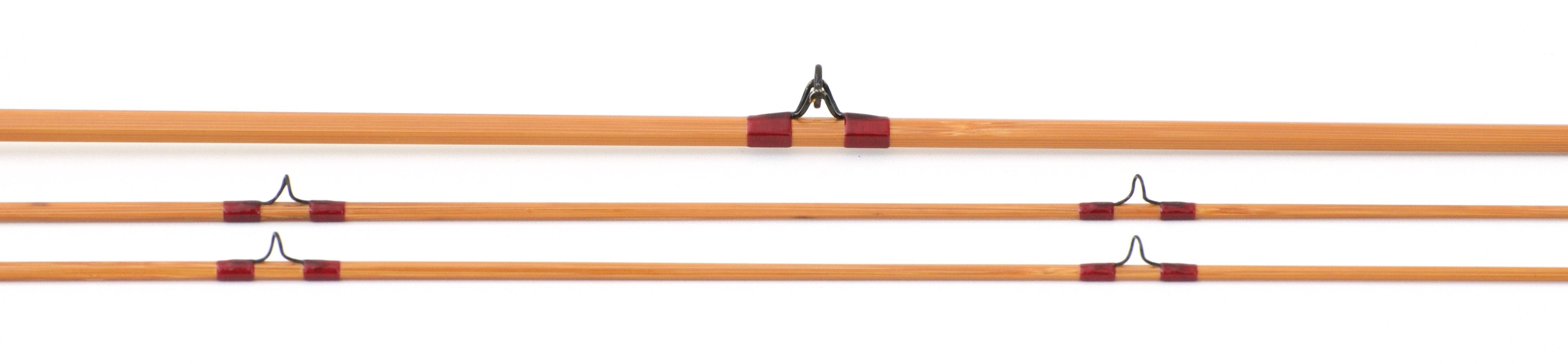 Straw colored cane with dark red wraps. Blued guides. Petite swelled butt with a ring hook keeper. The diminutive cigar grip measures 5" with only light soiling. Cap and ring over a mortised butternut spacer. The bright nickel silver ferrules are size 10/64 with an excellent fit. Indented witness marks. The rod weighs 2.35 oz. Medium action and best with a three weight line in my opinion. Includes original bag with stiffening dowel as well as the original tube with brass fittings. A truly classic taper and a fantastic small stream rod.