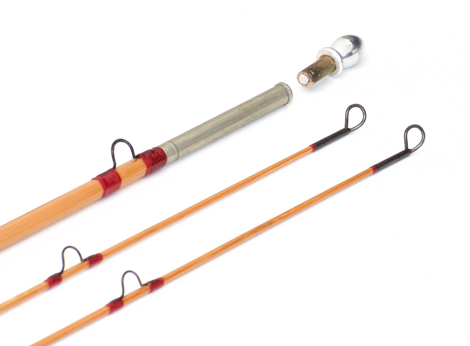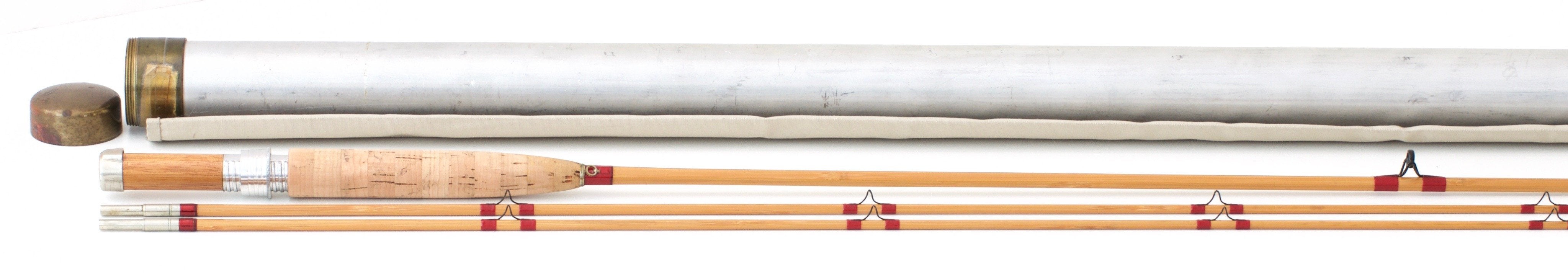 The rod features blonde, straw colored cane with transparent Chinese red wraps. The winding check and male ferrules feature crimson tipping. Darkly oxidized guides. Stylish, gradually swelled butt. The black script indicating the serial number on the butt and tip sections remains clean and bold. Ring hook keeper. Bright aluminum winding check. Classic cigar grip 5 1/2" in length with only the lightest of soiling. Free of any ridging, dents, hook gouges, etc. Bright aluminum down-locking reel seat with a butternut spacer. The seat and butt cap remain free of wear.