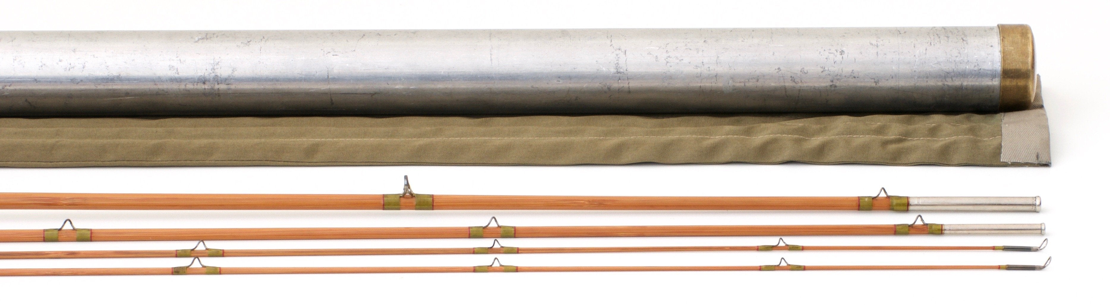 The rod features a beautifully varnished finish with olive green wraps and bright red tipping. Reverse twist English-style oxidized guides. Ring hook keeper. Mildly swelled butt. Nickel silver checks. Classic cigar grip 5" in length with light soiling and some very minor ridging. Bright nickel silver cap and ring reel seat over a mortised butternut spacer. "Tournament" is stamped on the butt cap along with the pre-fire Leonard stamp and a bull's eye pattern on the bottom. Some of the stamp has worn thin with time. Excellent ferrule fit. Indented witness marks on the ferrule shoulders. The rod weighs 3.60 oz. Reflecting the fishing style of the day this is a versatile medium-fast action rod, well suited for dries or wets. Original bag and tube. The bag has a reinforcement at the bottom probably from worn stitching.