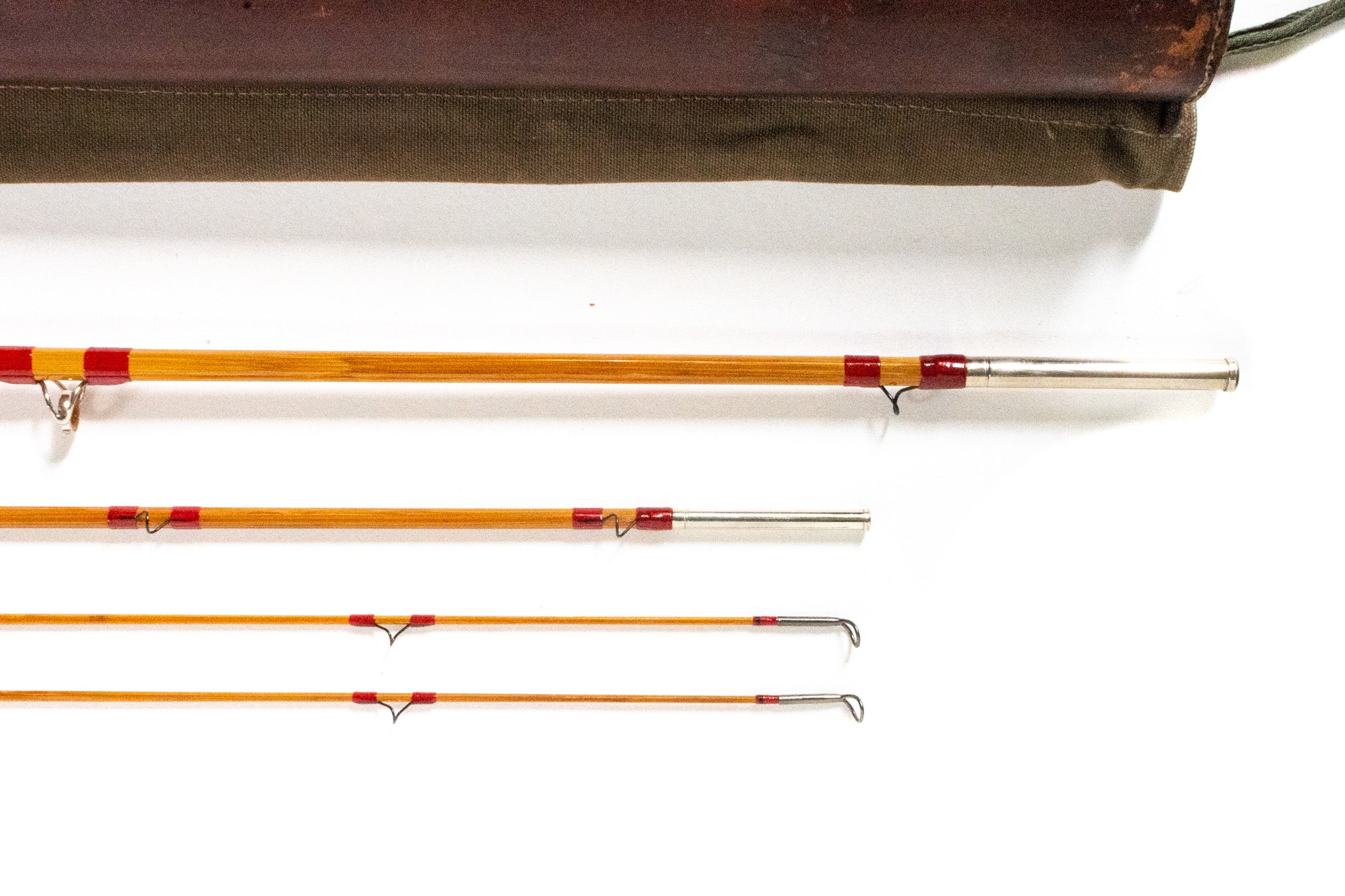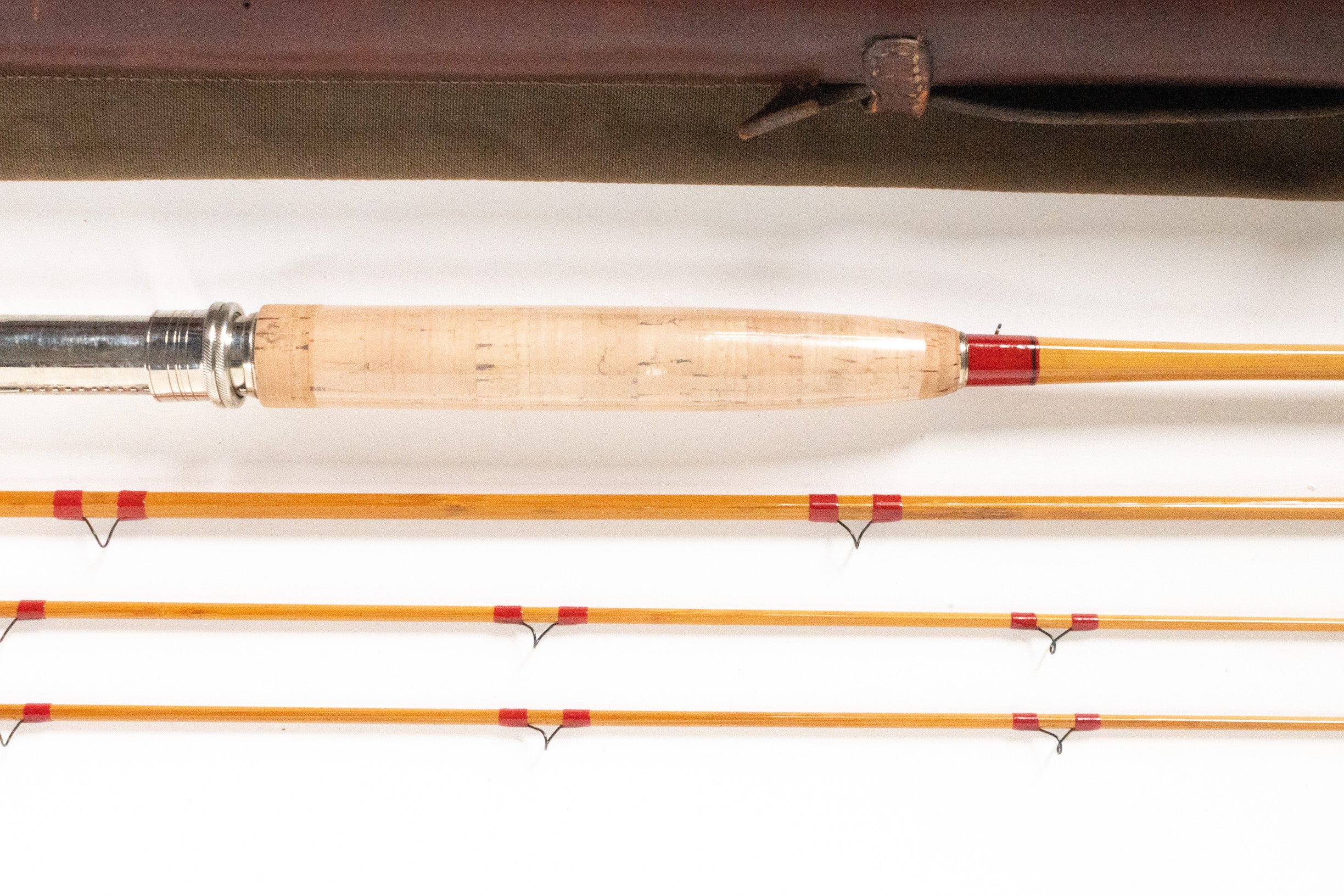 A nice Leonard Special Tournament fly rod, 8'6", 3-piece, 2-tips, built for a #6 or #7 line. The rod has not been fished since it was refinished by Leonard rodmaker Ted Simroe. The ferrule fits are good and the rod is nice and straight. The rod has a spliced joint running under the agate stripping guide on the butt section. The rod is wrapped red with a black band at the keeper, male ferrules, and tip-tops. The ferrules and reel seat hardware are polished bright. The grip is a 6 1/2" slim cigar profile appears to be a replacement. The grip is covered in heat shrink plastic. The reel seat is an all-metal downlock screwlock with square nickel silver wire soldered on and filed to act as thread teeth. A nickel silver pocket cap and ring are soldered on the bottom. The cap is stamped "The Leonard Rod, HL Leonard Rod Co, Maker" in a cartouche and below that "Reg US Pat Off" and "Special Tournament" is stamped on the barrel. The rod is missing the usual end cap but comes with the fighting butt (the rod is pictured with the fighting butt attached, hence the appearance of the butt section being longer than the mid and tips). I can't say if the bag is original and the rod comes in a leather case but I suspect that it is a substitute as the original case would have had a William Mills stamp on it. A very serviceable rod.