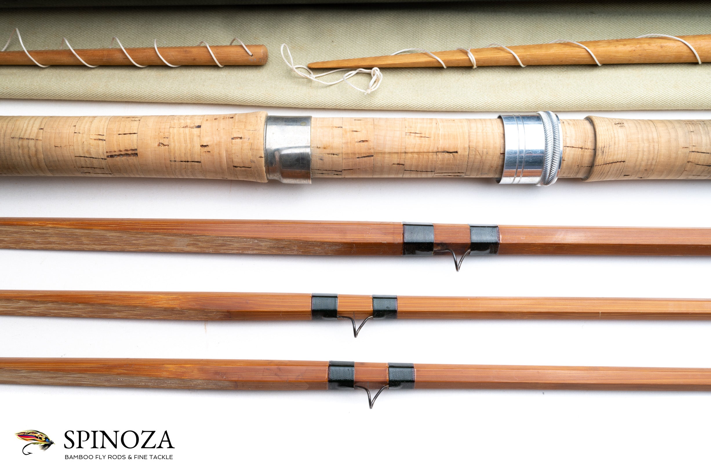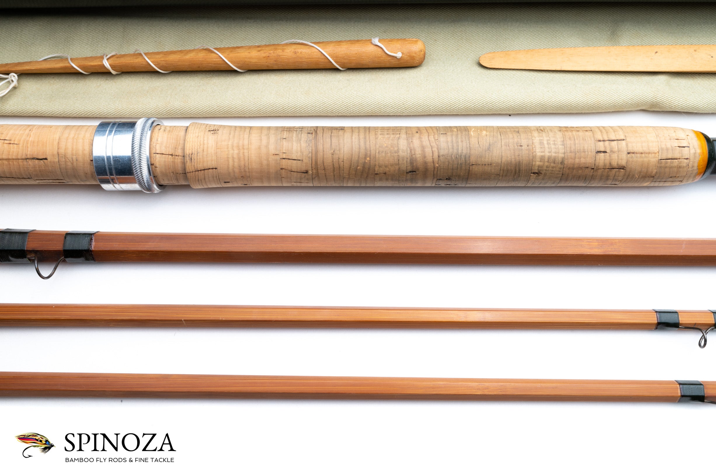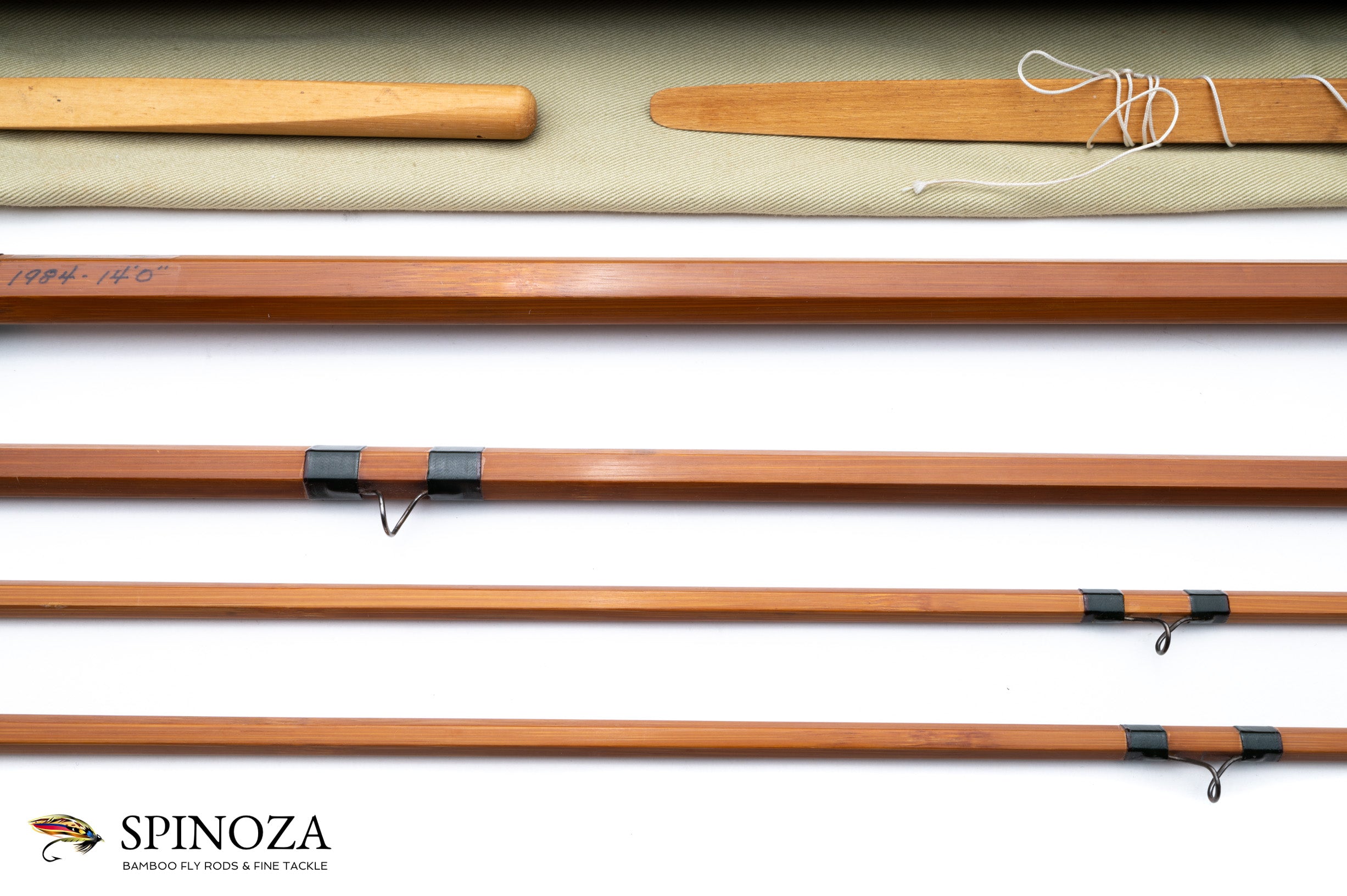 A Hoagy Carmichael two-handed bamboo fly rod, 14', 3-piece, 2-tip, and built for a #11 line. "H. Carmichael", and "1984 - 14'" are inked on the shaft just above the keeper wrap. The rod weighs 23 ounces on my scale. Hoagy made this rod in 1984 from blanks acquired from Harold Sharpe a few years earlier, and then finished the rod out. He relayed to me that he fished this on the Grand Cascapedia and in Scotland and Ireland, so there is some very nice fishing mojo with this rod, which remains in excellent overall condition. Hoagy himself has rewrapped the uppermost guide on the mid, but other than that the rod bears only light cosmetic wear, including some soiling to the grip, and a little brassing to the inner part of the guides. Impregnated cane built in a three up node pattern. Spliced joints which come with wooden protectors. Wrapped in very dark green tipped in red with an agate stripper and oxidized high arch snakes and tip tops. The grip is 23 1/4" long and is all-cork, shaped in the characteristic Garrison/Carmichael style, with a varnished wrap for the front cork check and a blunt cigar profile. The seat hardware is comprised of an aluminum slide band and a nickel silver pocket cap. The bottom grip transitions from cork into a 3/4" aluminum ring and lastly, a big black rubber button. The rod packs into a tan cloth bag and a large aluminum Garrison/Carmichael style aluminum tube with a brass collar and aluminum top. A neat rod for anyone who appreciates bamboo and salmon fishing.