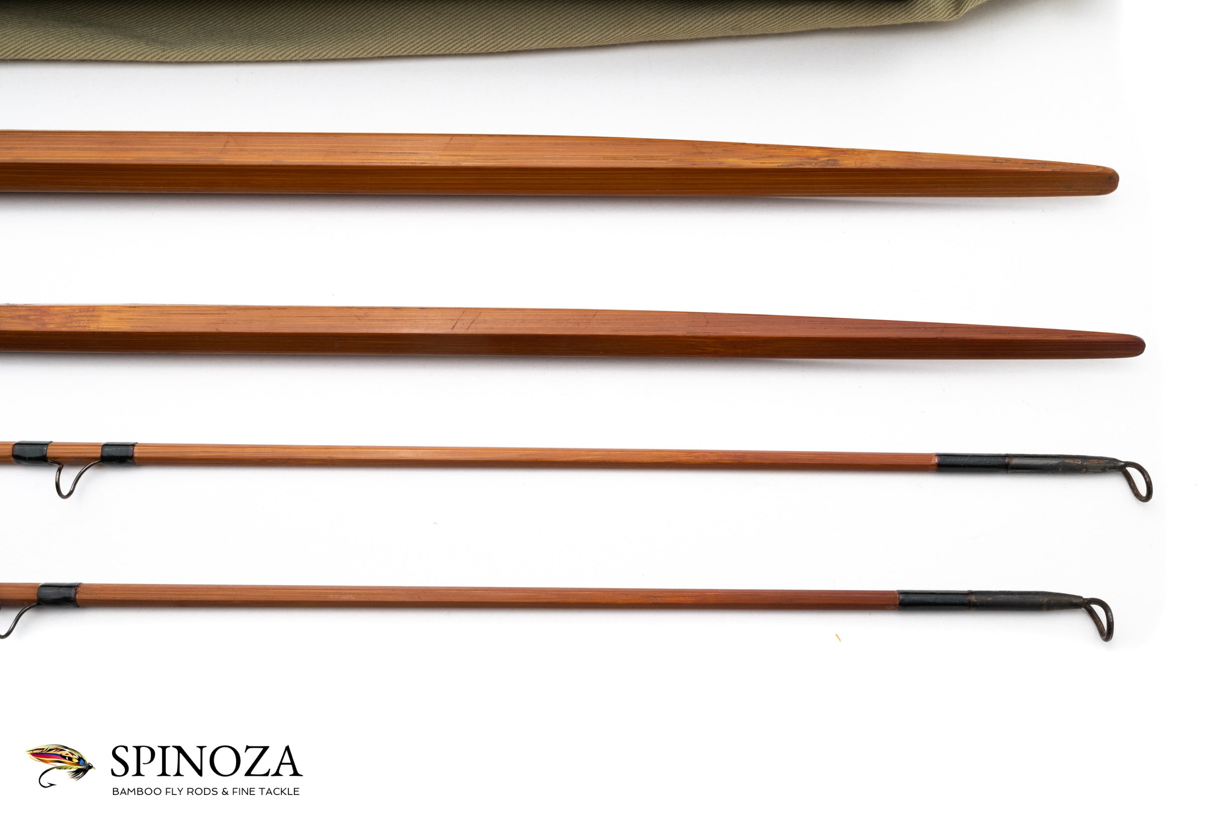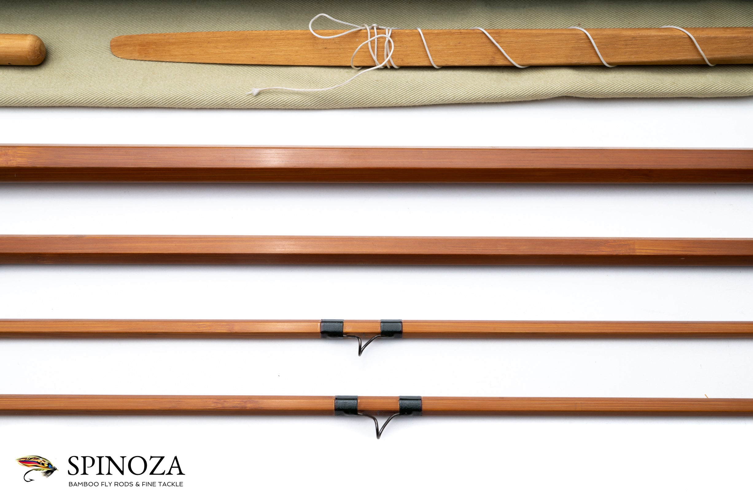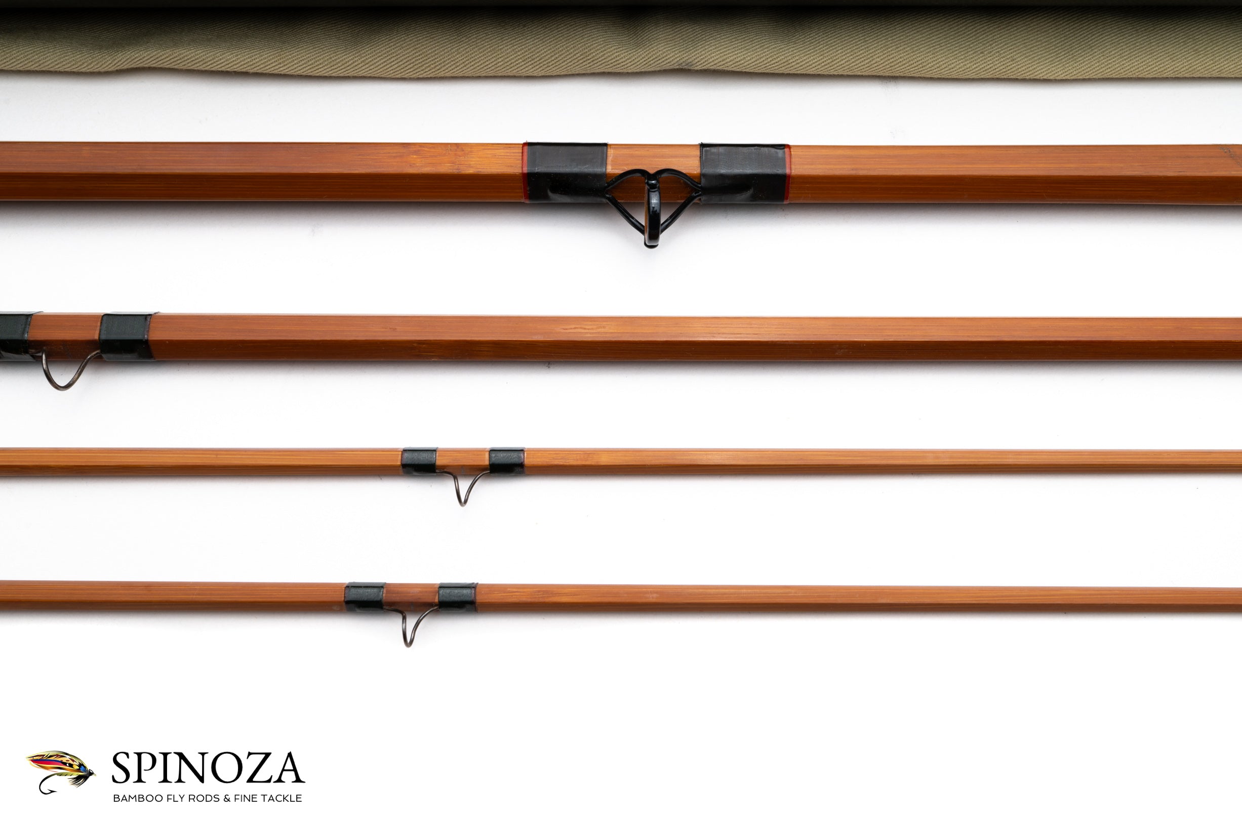 A Hoagy Carmichael two-handed bamboo fly rod, 14', 3-piece, 2-tip, and built for a #11 line. "H. Carmichael", and "1984 - 14'" are inked on the shaft just above the keeper wrap. The rod weighs 23 ounces on my scale. Hoagy made this rod in 1984 from blanks acquired from Harold Sharpe a few years earlier, and then finished the rod out. He relayed to me that he fished this on the Grand Cascapedia and in Scotland and Ireland, so there is some very nice fishing mojo with this rod, which remains in excellent overall condition. Hoagy himself has rewrapped the uppermost guide on the mid, but other than that the rod bears only light cosmetic wear, including some soiling to the grip, and a little brassing to the inner part of the guides. Impregnated cane built in a three up node pattern. Spliced joints which come with wooden protectors. Wrapped in very dark green tipped in red with an agate stripper and oxidized high arch snakes and tip tops. The grip is 23 1/4" long and is all-cork, shaped in the characteristic Garrison/Carmichael style, with a varnished wrap for the front cork check and a blunt cigar profile. The seat hardware is comprised of an aluminum slide band and a nickel silver pocket cap. The bottom grip transitions from cork into a 3/4" aluminum ring and lastly, a big black rubber button. The rod packs into a tan cloth bag and a large aluminum Garrison/Carmichael style aluminum tube with a brass collar and aluminum top. A neat rod for anyone who appreciates bamboo and salmon fishing.