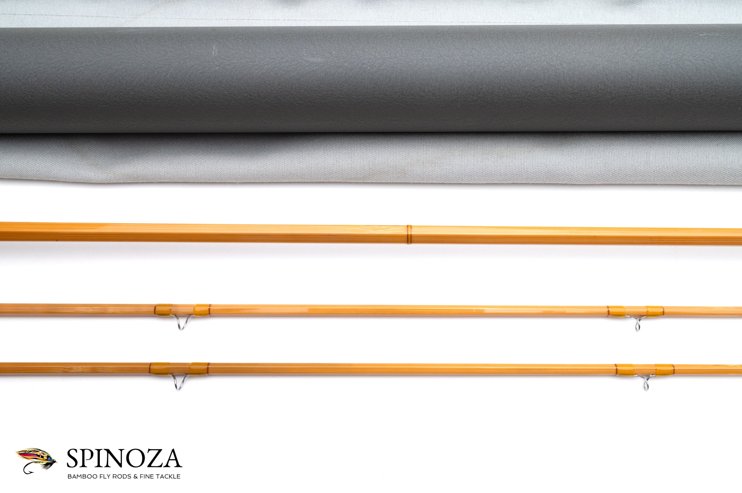 A Homer Jennings bamboo fly rod, 8', 2-piece, 2-tip, and built for a #4 or #5 line. Serial #457. The rod weighs 4 ounces. Moderately full flexing action but quick enough to put into the dry fly category. Condition is one of modest use, some early cracks from casting and very minor downward set (almost unnoticeable and not enough to warrant straightening) to both tips. The grip may have been cleaned chemically at some point. Light tan color cane with small three-up nodes. Main wraps very light yellow, transparent main wraps with brown edges and brown at the ferrules. The stripper is an agate and the tip tops + snakes are chrome. The swiss style ferrules are polished bright. The rod has a superbly done pane of glass varnish coat. The grip is a 6" long western with a slide band and cap seat. They are polished. The wood spacer is varnished myrtle burl. The rod has a female plug of bamboo and cork to keep the ferrules clean. The rod bag is grey color poplin with a stiffener. The aluminum tube is painted a matte grey and has brass fixtures.