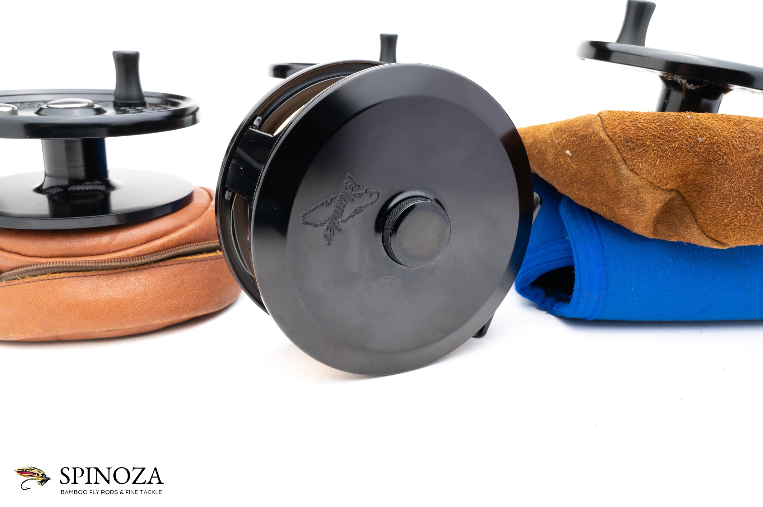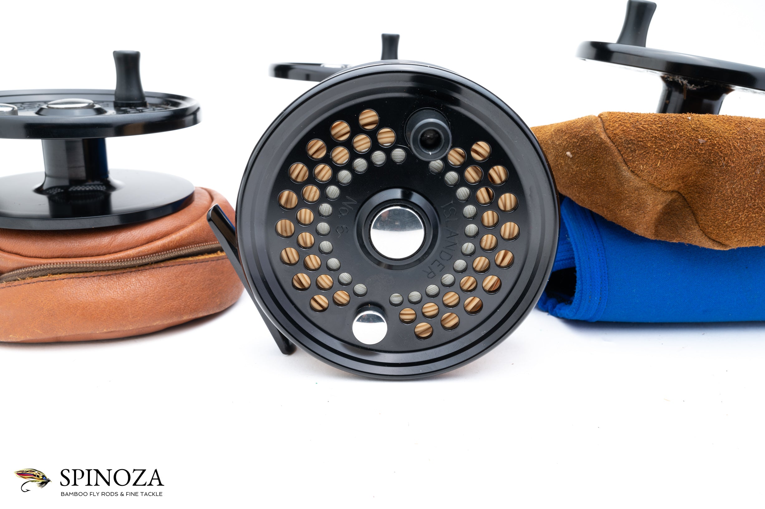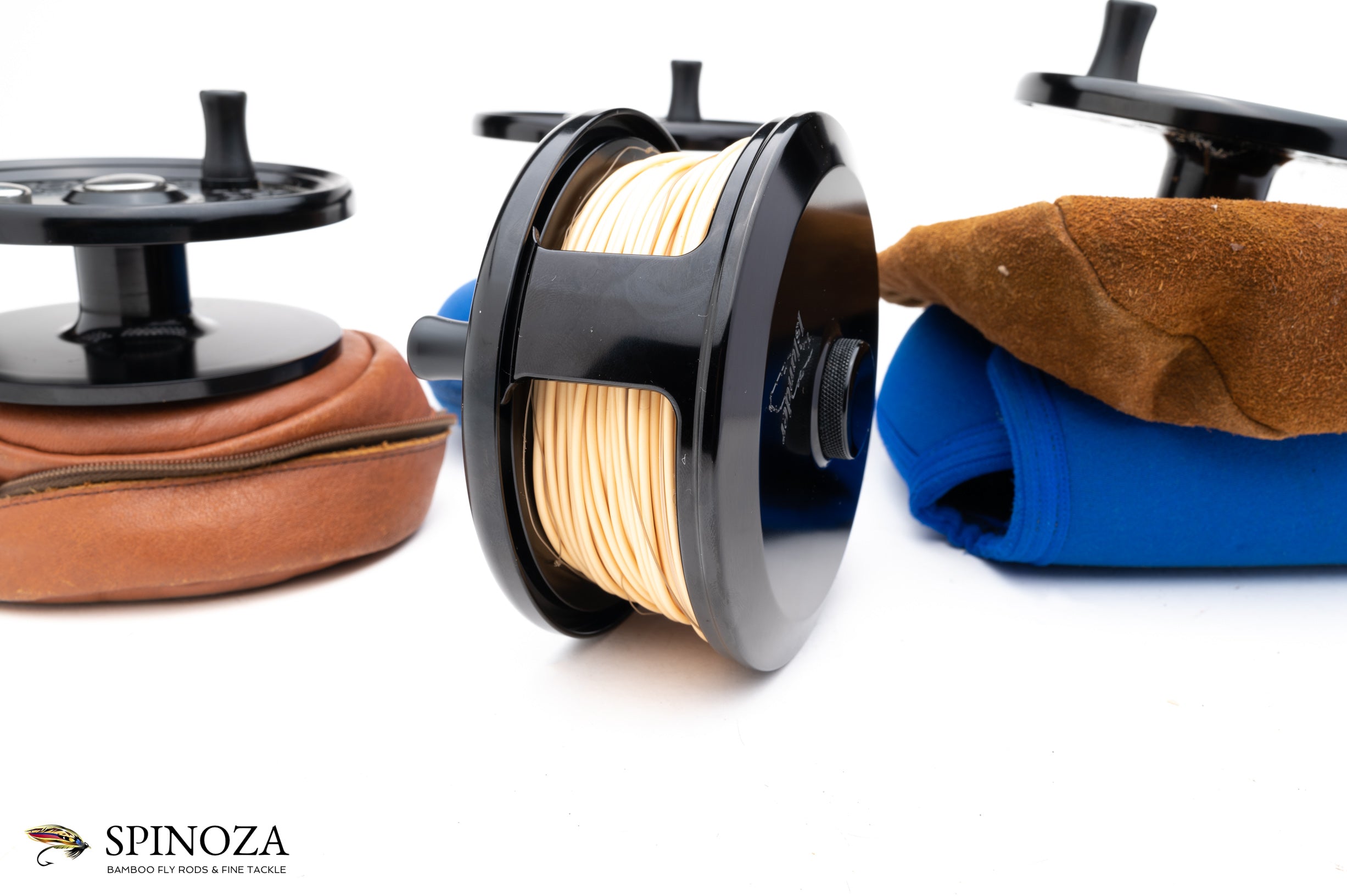 An Islander No 6 fly reel with three spare spools. Approximately 4 1/2" in diameter and set up for RHW. Black anodized throughout. Serial #296. The reel has a line loaded on it but appears unfished. Strong adjustable drag. The reel and spools pack into a mix of two islander neoprene pouches, a leather zip pouch, and a suede drawstring pouch respectively.