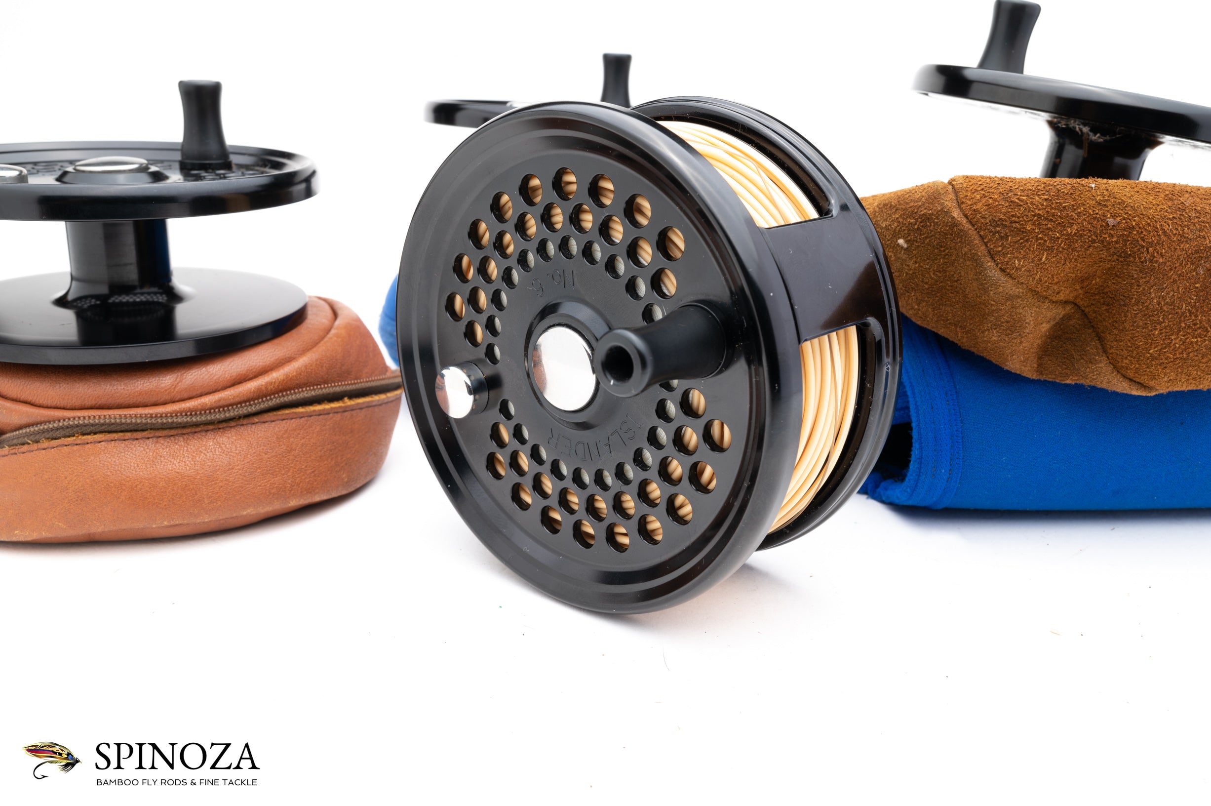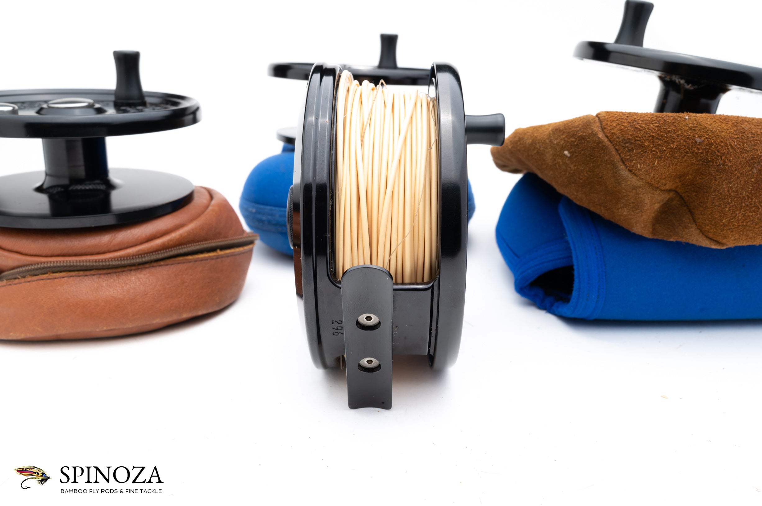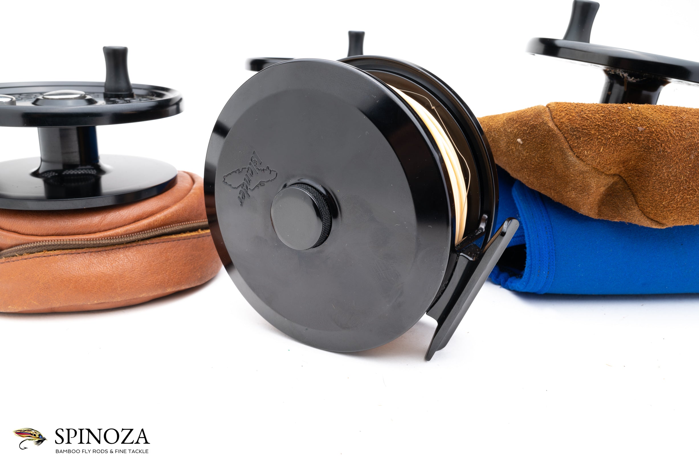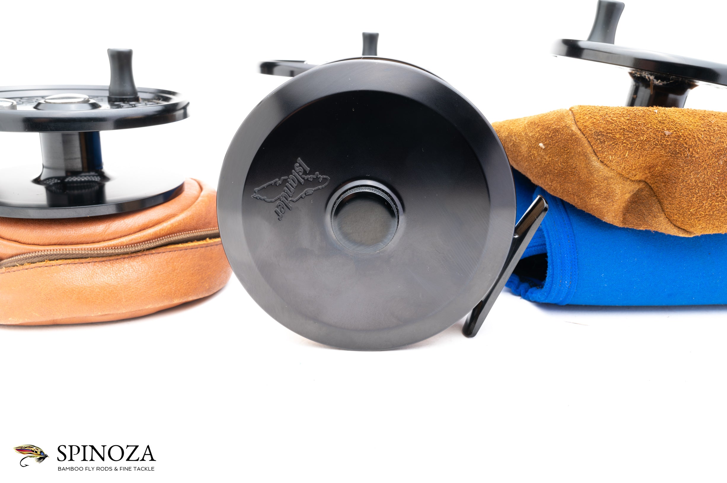 An Islander No 6 fly reel with three spare spools. Approximately 4 1/2" in diameter and set up for RHW. Black anodized throughout. Serial #296. The reel has a line loaded on it but appears unfished. Strong adjustable drag. The reel and spools pack into a mix of two islander neoprene pouches, a leather zip pouch, and a suede drawstring pouch respectively.
