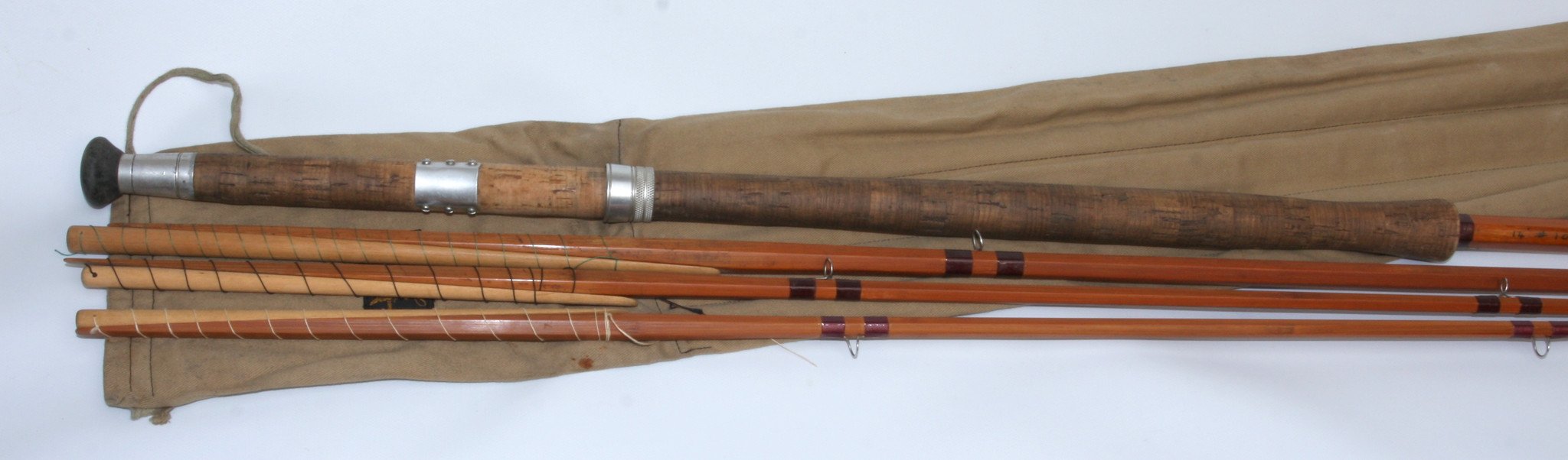 For sale here is a good example of Sharpe's Spliced salmon rods with splice protectors. 14'-0" #10 3/2.All original and in good condition, except the hole in the bag (only tiny, ½" across).Rod number on butt ~ 87 54.