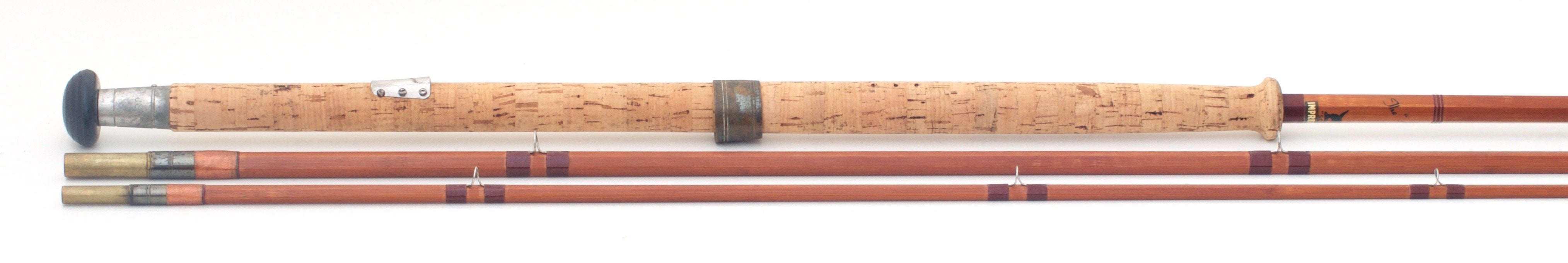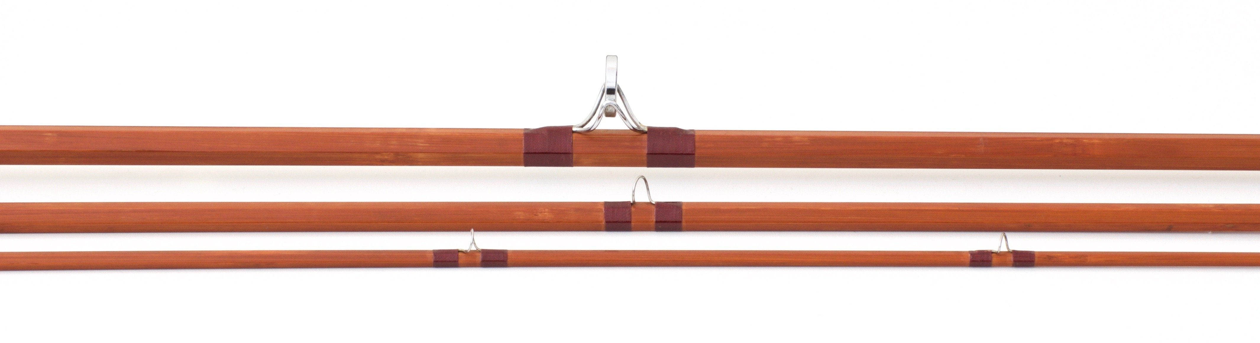 Moderately tempered cane with burgundy wraps. Copper or brass wire wraps at the ferrules with burgundy tipping. The decals and script remain clean with the exception of the "F" decal on the butt. The two-handed grip is a total of 23" from the winding check to the bottom of the fighting butt. The cork shows only the light soiling and is quite smooth. Oddly, it appears the cap from the reel seat was moved at one point. This left 6 small holes and a light indentation from where it was. It is now back in the correct place. The ring is brass while the cap is aluminum. The hard rubber fighting butt is free of any cracks or chips. "J.S. Sharpe Ltd Aberdeen" is stamped into the fighting butt check. The oxidized brass ferrules are size 21/64 and 29/64 with a great fit. Red witness marks as well as "33" stamped into each ferrule. The rod weighs 17.80 oz. Includes original bag with label.