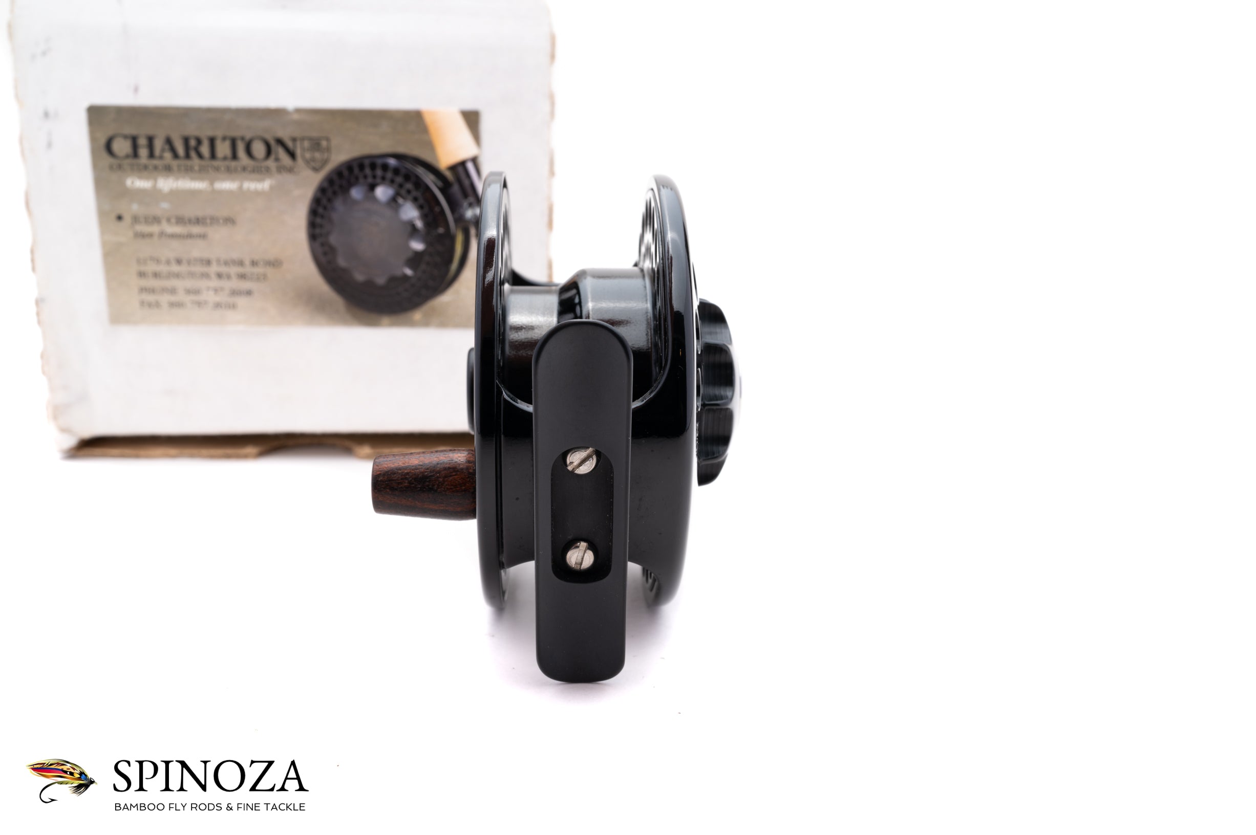 An excellent Charlton 8350C fly reel, set up for LHW. Serial #8350-9118. This reel is 3" in diameter with a 1" spool width and weighs a scant 4.5 oz. It is loaded with a 1-5 weight spool which has capacity for a WF3 with 150yds of 20#, a WF4 with 110yds 20#, or a WF5 with 100yds of 20#. Mint unused condition. All black type-III anodized finish, with heavy porting and a large arbor design. The button release on the spool allows for a quick change. Very high end machining on this reel. It packs into the original box (no bag).