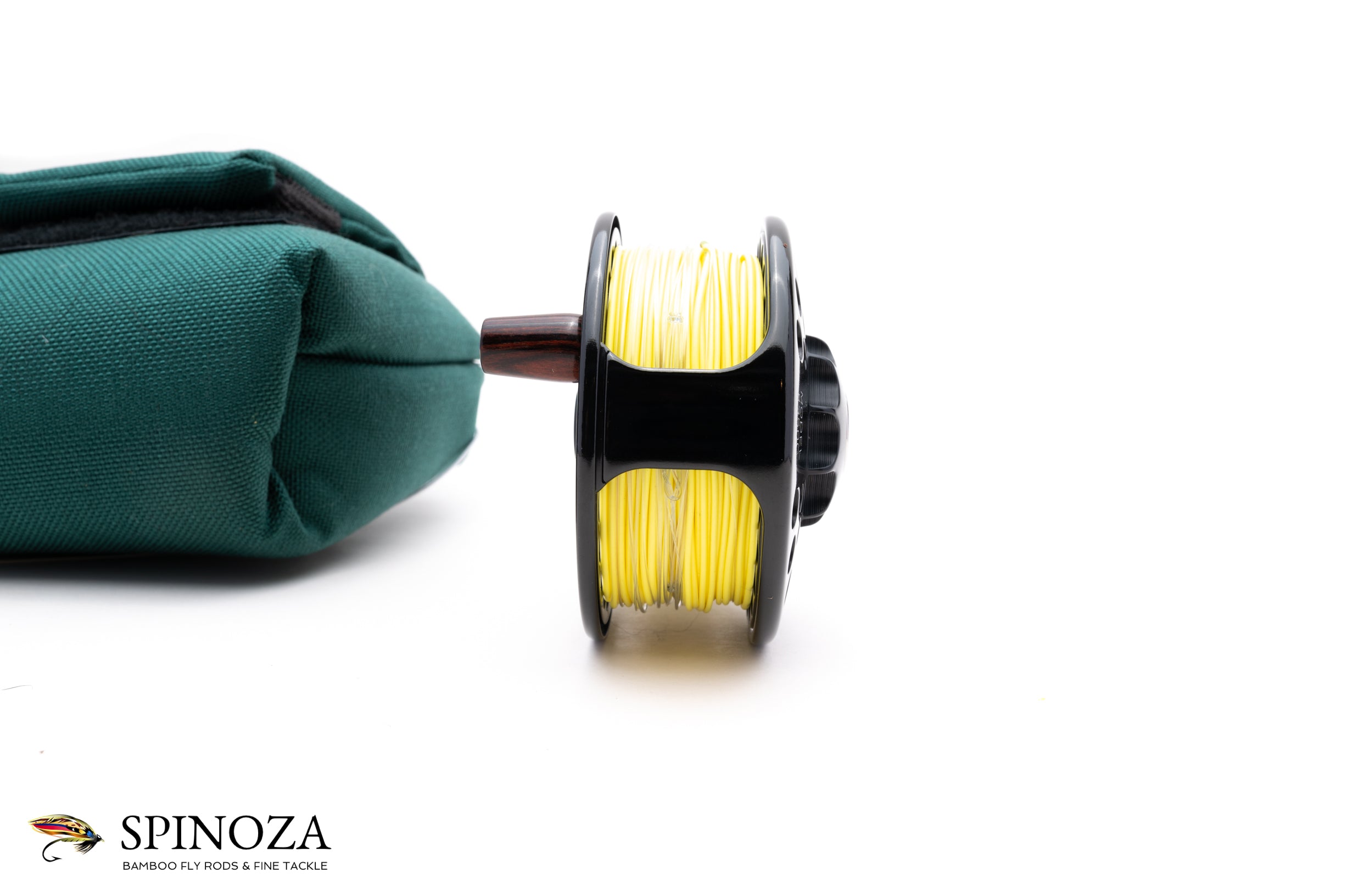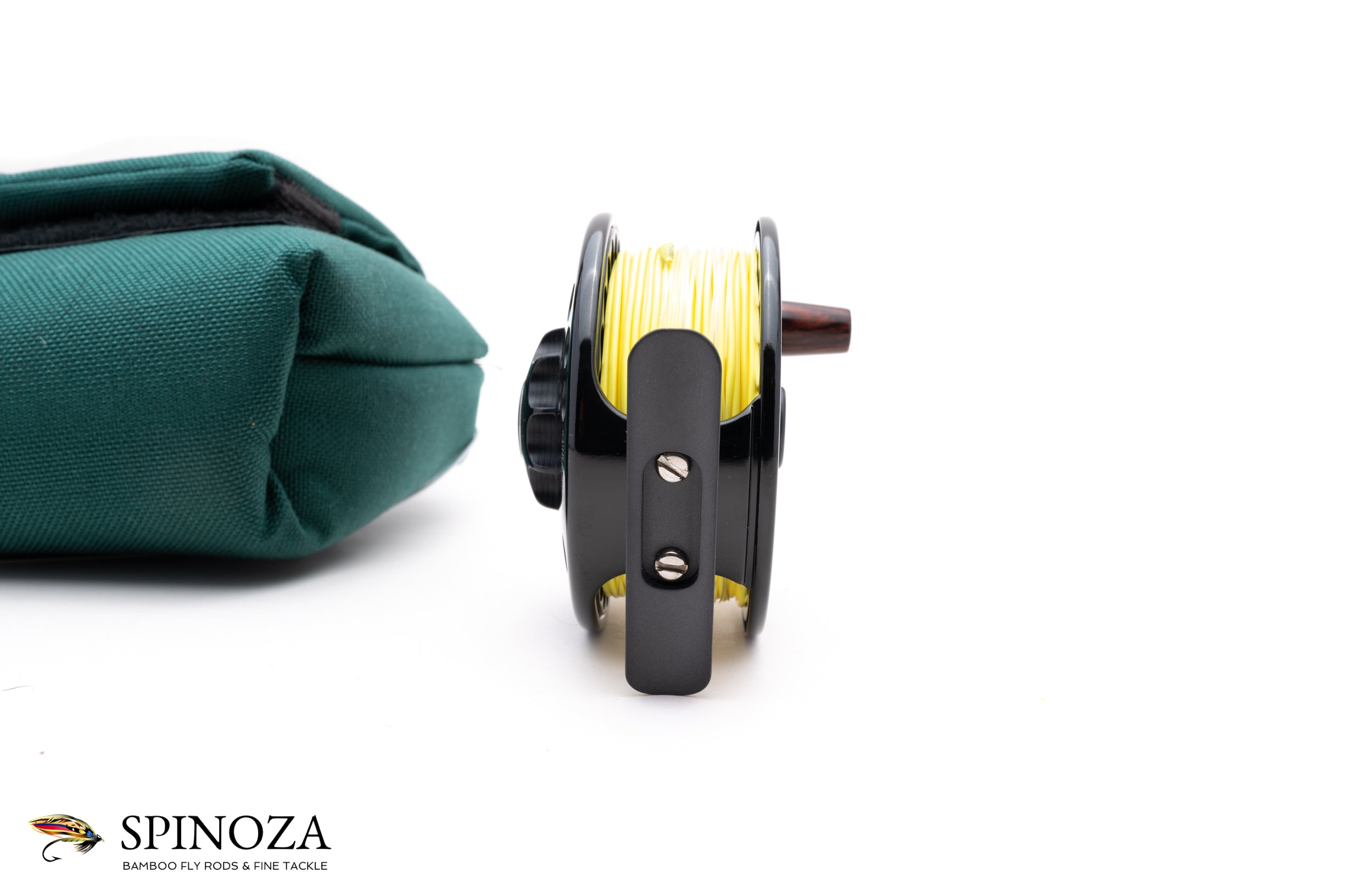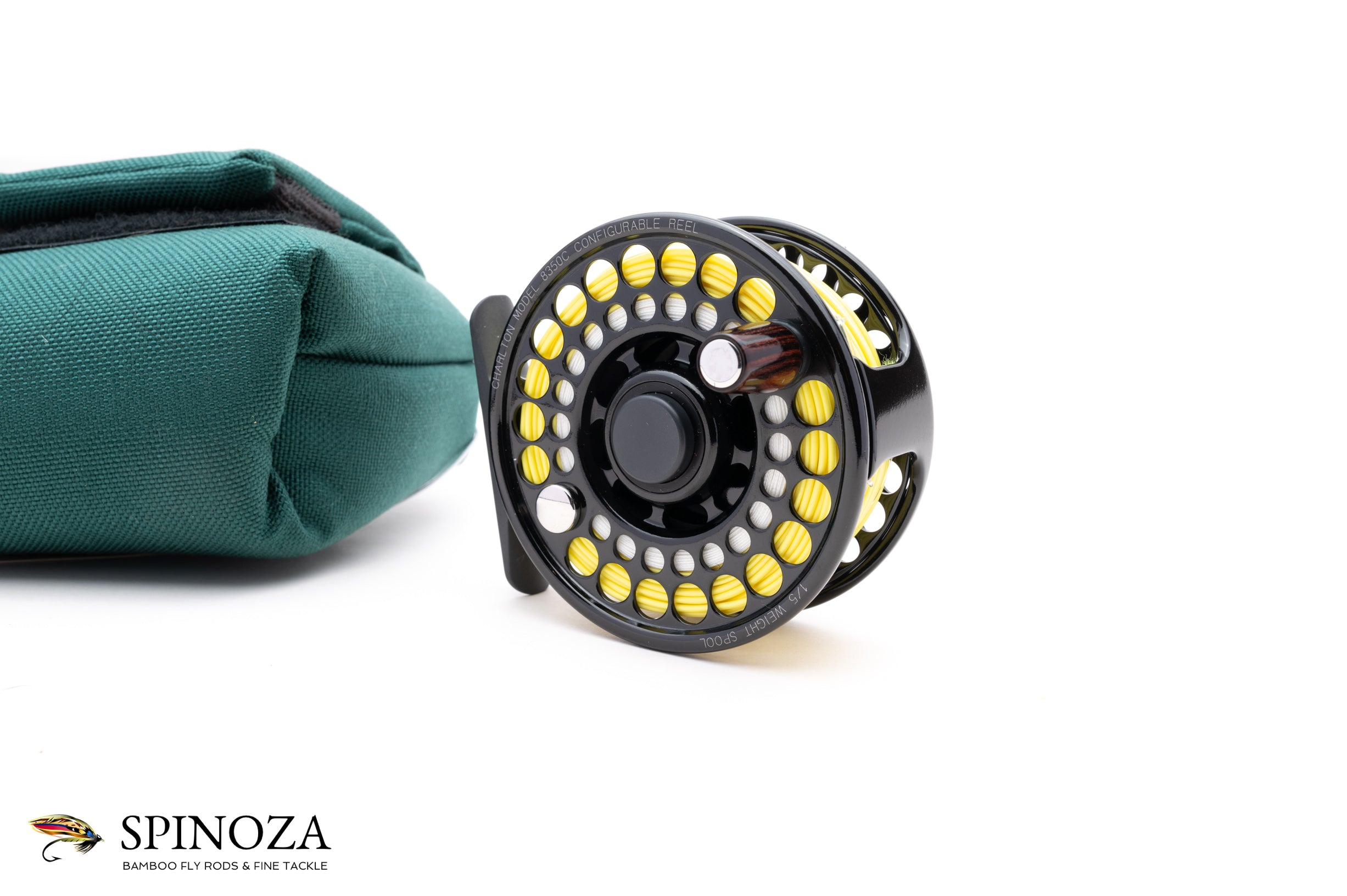 An excellent Charlton 8350C fly reel with a 1-5 Spool, set up for RHW. Serial #8350-9561. Mint, unused condition. This reel is 3" in diameter with a 1" spool width and a catalog weight of 4.4 ounces (this one weighs 5.6 with a line and backing loaded on it). The 1-5 weight spool has capacity for a WF3 with 150yds of 20#, a WF4 with 110yds 20#, or a WF5 with 100yds of 20#. All black anodized with very high end machining that Charltons were known for. The reel packs into the original green cordura pouch.