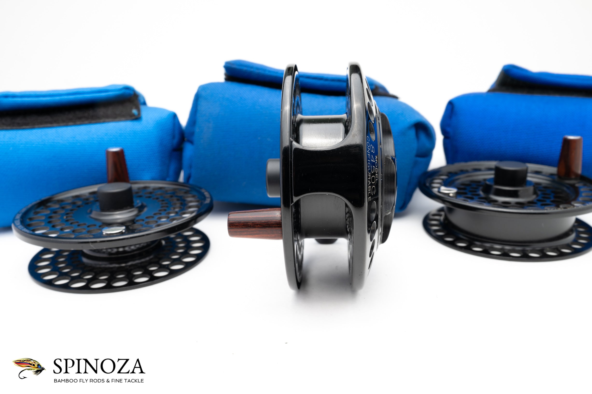 A very nice Charlton 8450C fly reel with all three spools (3/4, 5/6, and 7/8). Near mint condition with one faint mounting mark on the foot, one tiny nick on the frame, and one tiny nick on the edge of the 7/8 spool. Superb otherwise, and the reel and spools appear to have spent almost all of their time in the case. Set up for LHW but can be easily reversed to RHW. A very nice package here and with all three spools you can easily tailor the reel to your needs and conditions. The exclusive configurable system accommodates three different quick-change spools: 3/4, 5/6, and 7/8 weight. The retrieve rate increases as you mount spools engineered for smaller line weights, resulting in a large arbor, quick-retrieve reel. When mounted with the smaller spools it becomes a lightweight, quick-retrieve, freshwater reel. Carbon fiber disk drag system built for serious stopping power. Type III anodizing for maximum saltwater protection. Oversized 5/8" smooth-riding aerospace bearings. Complete enclosure of all mechanical components to protect against contamination from the elements. The snap-reverse system instantly reverses to left- or right-hand retrieve with the push of a button on the inside of the frame. The reel and spools come in the standard blue cordura Charlton pouches. A great do-it-all package that will last you a lifetime.
