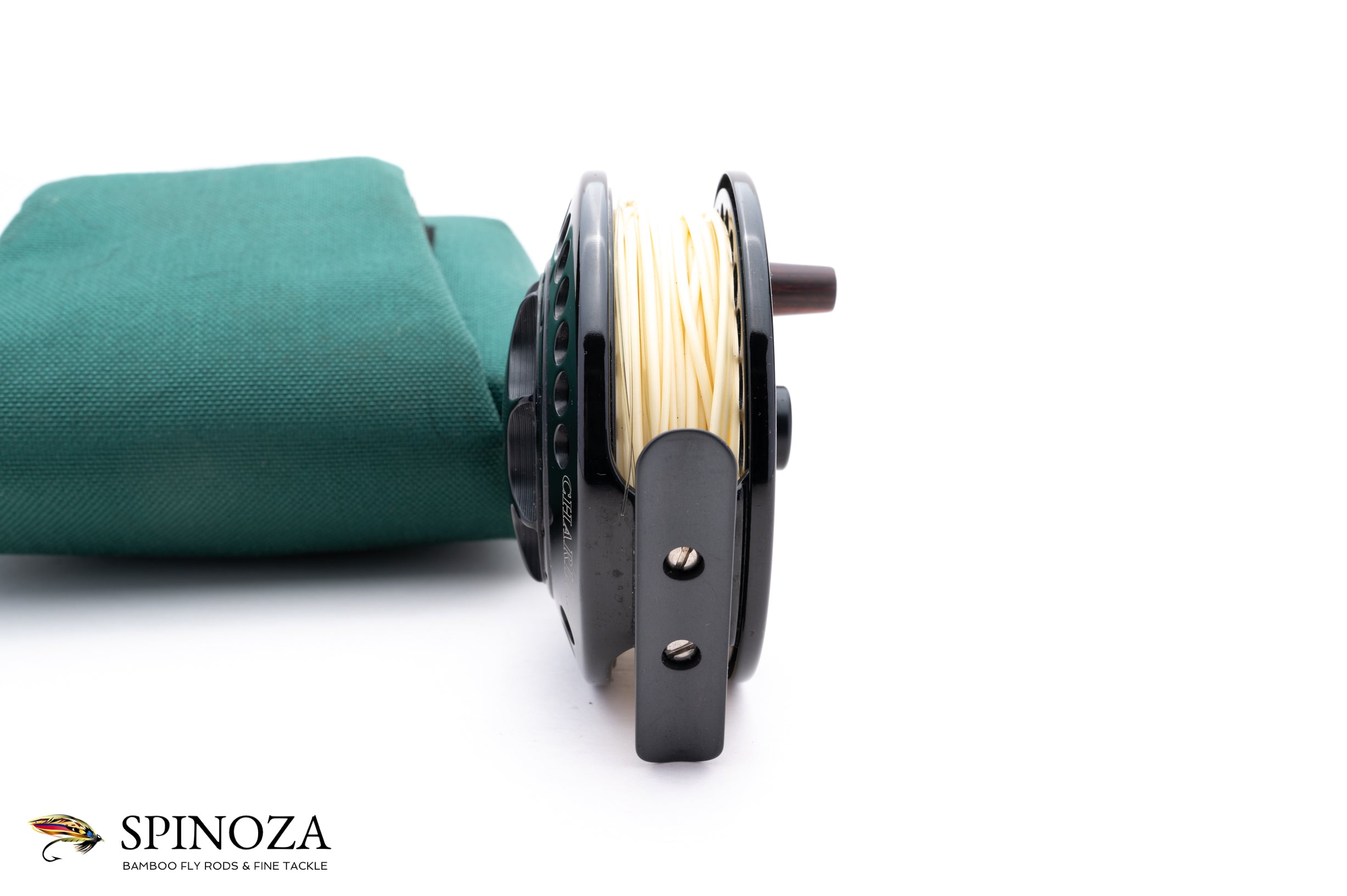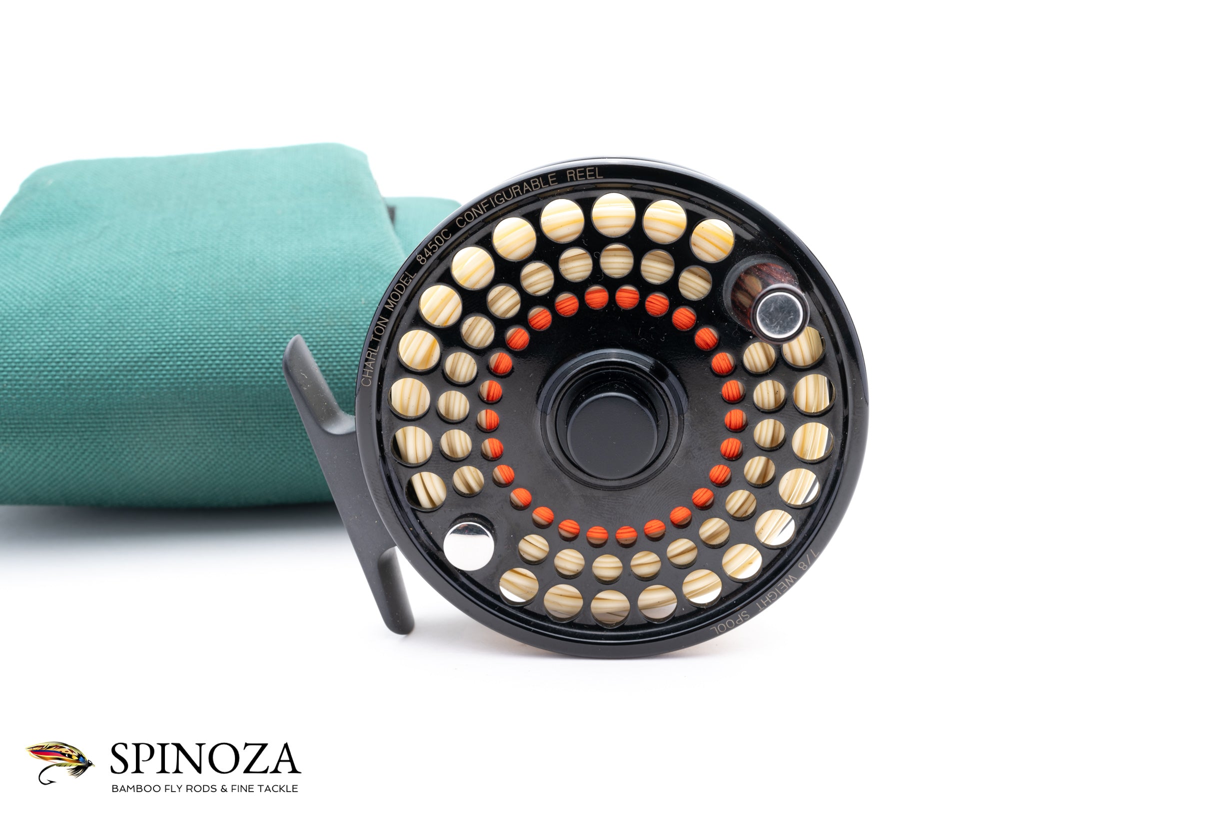 A nice Charlton 8450C fly reel with a 7/8 spool. Set up for RHW but can be easily reversed to LHW. Near mint condition with just a few very minor touches of cosmetic wear. Exceptional quality and the intelligent configurable design that these reels were known for. With the quick change of a spool you can alter both the weight of the reel and line with appropriate backing capacity, and swap in one of the 3/4, 5/6, and 7/8 weight options. Carbon fibre disk drag system. Type III black anodization for maximum saltwater protection. Oversized 5/8" smooth-riding aerospace bearing with a complete enclosure of all mechanical components to protect against contamination from the elements. The reel packs into the original green cordura pouch and there is a line still loaded on the reel.