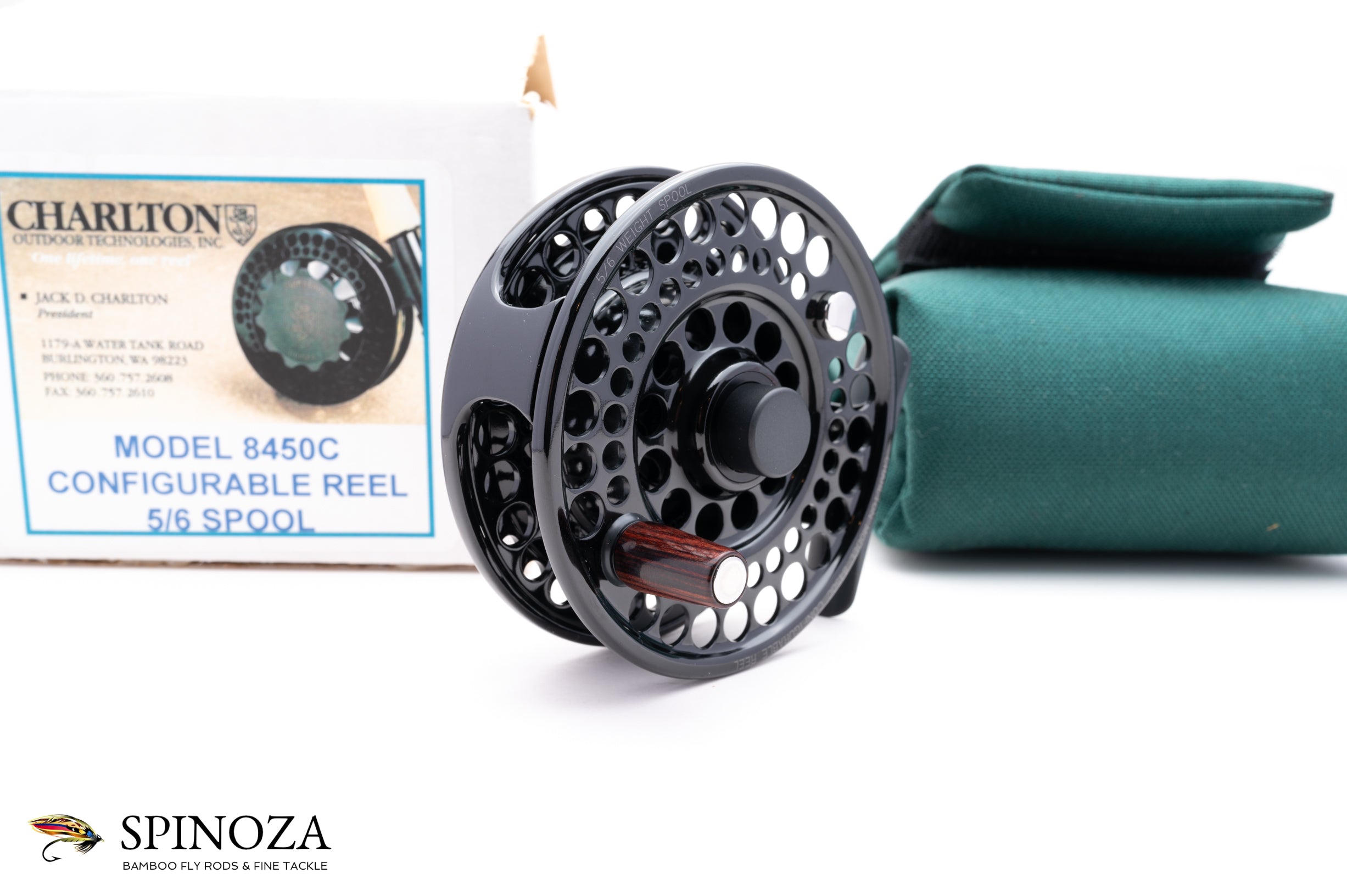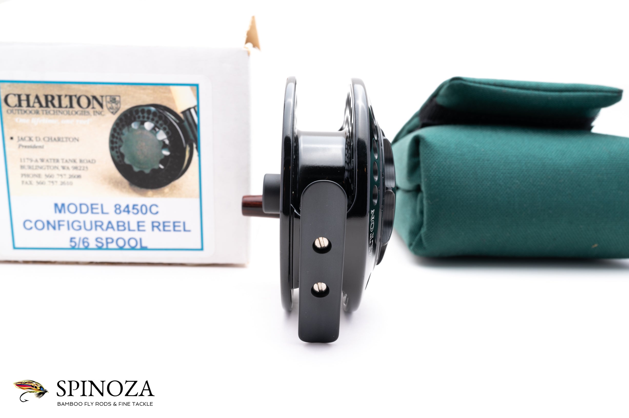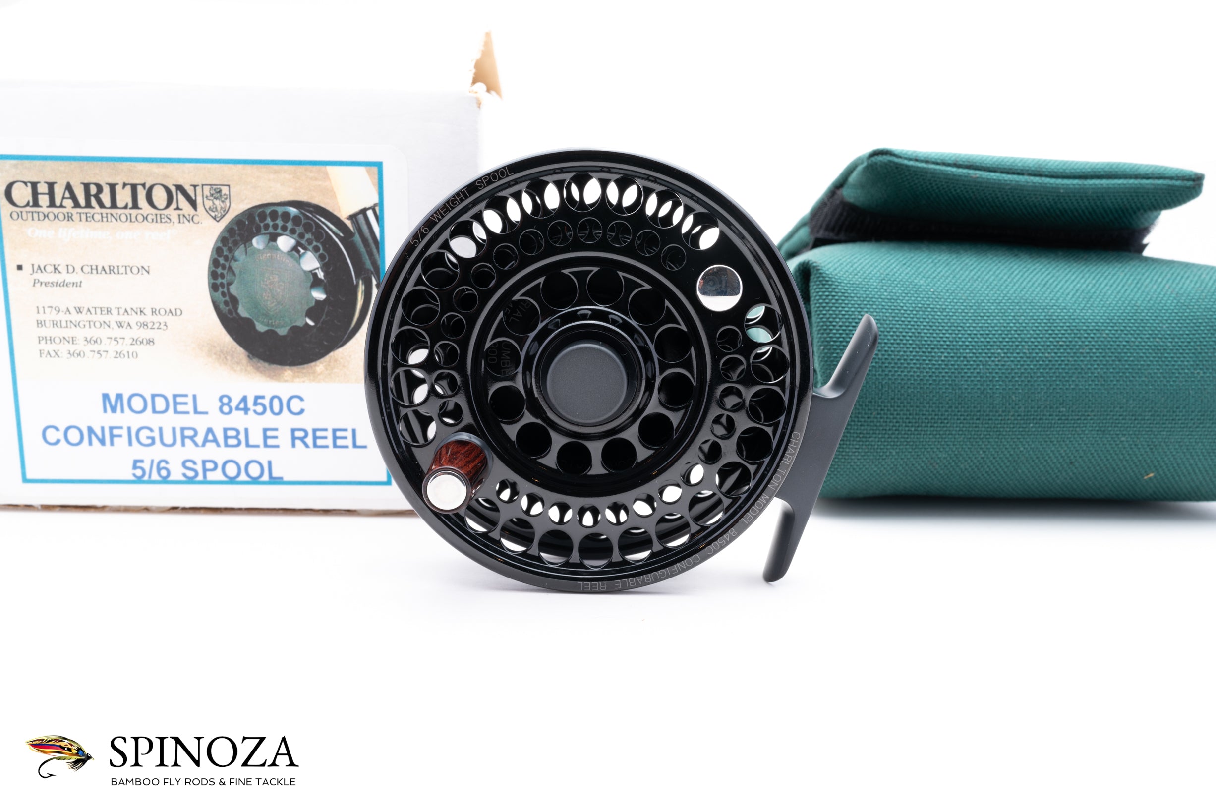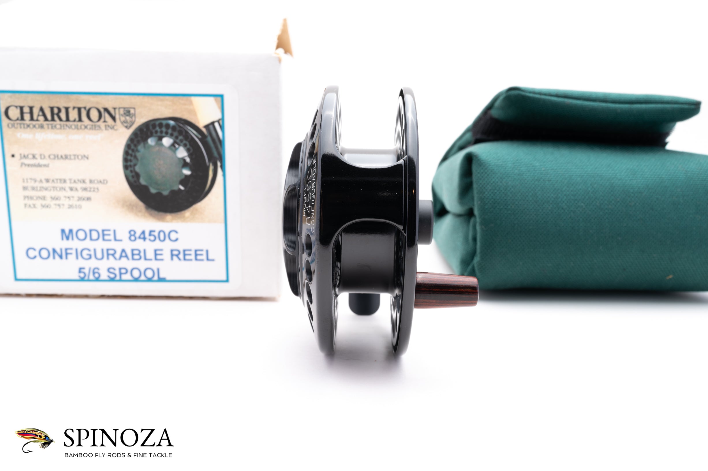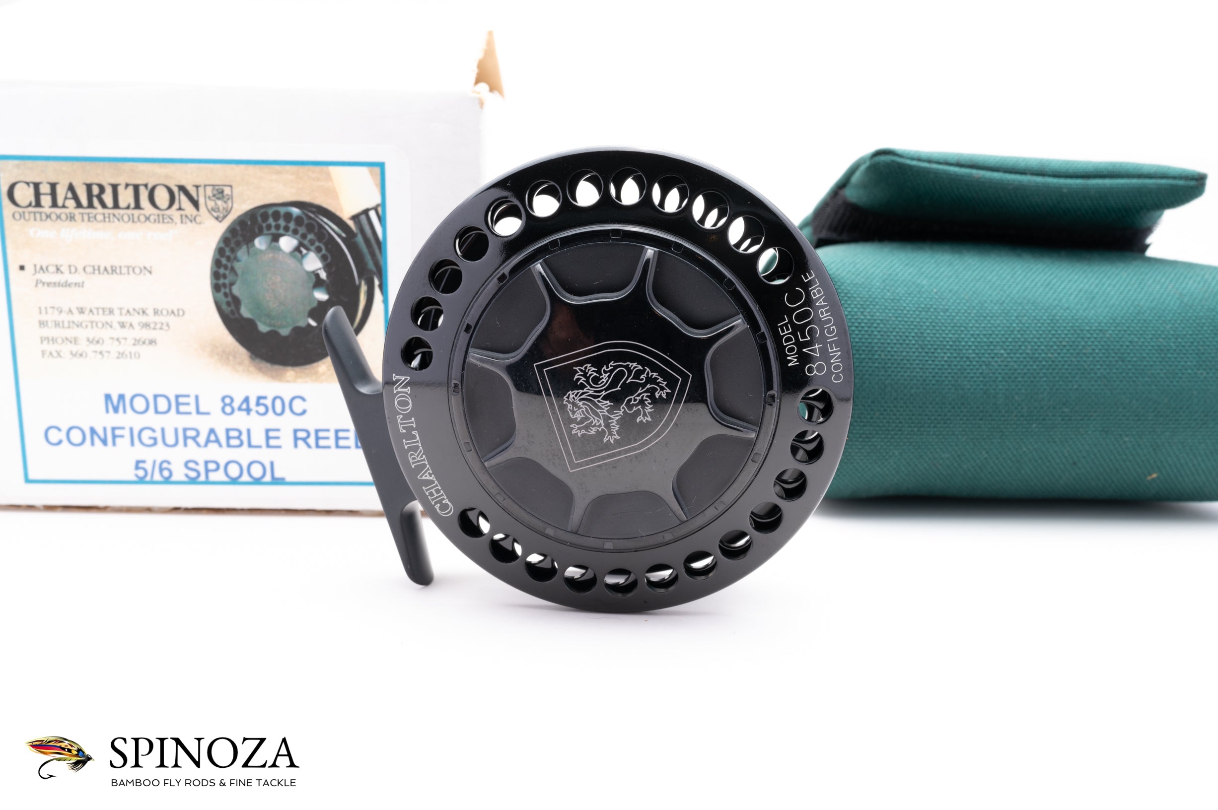 A nice Charlton 8450C fly reel with a 5/6 spool. Set up for RHW but can be easily reversed to LHW. Mint, unused condition. Serial number "8450-10900". Exceptional quality and the intelligent configurable design that these reels were known for. With the quick change of a spool you can alter both the weight of the reel and line with appropriate backing capacity, and swap in one of the 3/4, 5/6, and 7/8 weight options. Carbon fiber disk drag system. Type III anodization for maximum saltwater protection. Oversized 5/8" smooth-riding aerospace bearing with a complete enclosure of all mechanical components to protect against contamination from the elements. The reel packs into the original green cordura pouch and the original box with paperwork.