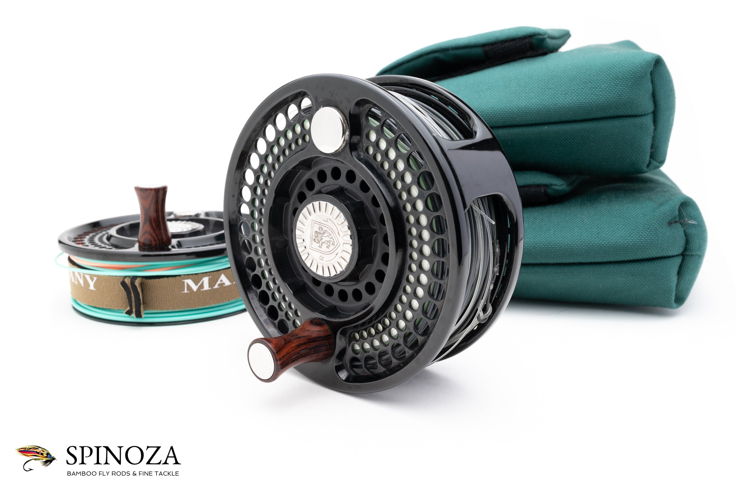 An excellent Charlton 8550C fly reel with two tarpon spools. Set up for LHW. The reel and both spools are in near mint condition with just a faint touch of rubbing in a spot or two, and free of any scratches or other defects. I doubt this reel was fished much at all, or if so, only a time or two and very well taken care of. Both spools are loaded with line and backing, one appearing to be a floating line, the other sinking. 4 1/2" diameter with a 1 3/16" spool width. The capacity for this model is listed as WF 10 and 400 yards of 30 lb backing. The sealed carbon fiber disk drag is self-adjusting and has over 9-square inches of surface area. Excellent all-black type-III hard anodizing except for the centre medallion and the counterweight which are done in chrome. The reel and spare spool are packed in the original padded green pouch. A highly sought-after Charlton model here, it doesn't get much better than this for chasing large saltwater species and with a spare spool you could quickly swap floating lines for sinking and vice versa.