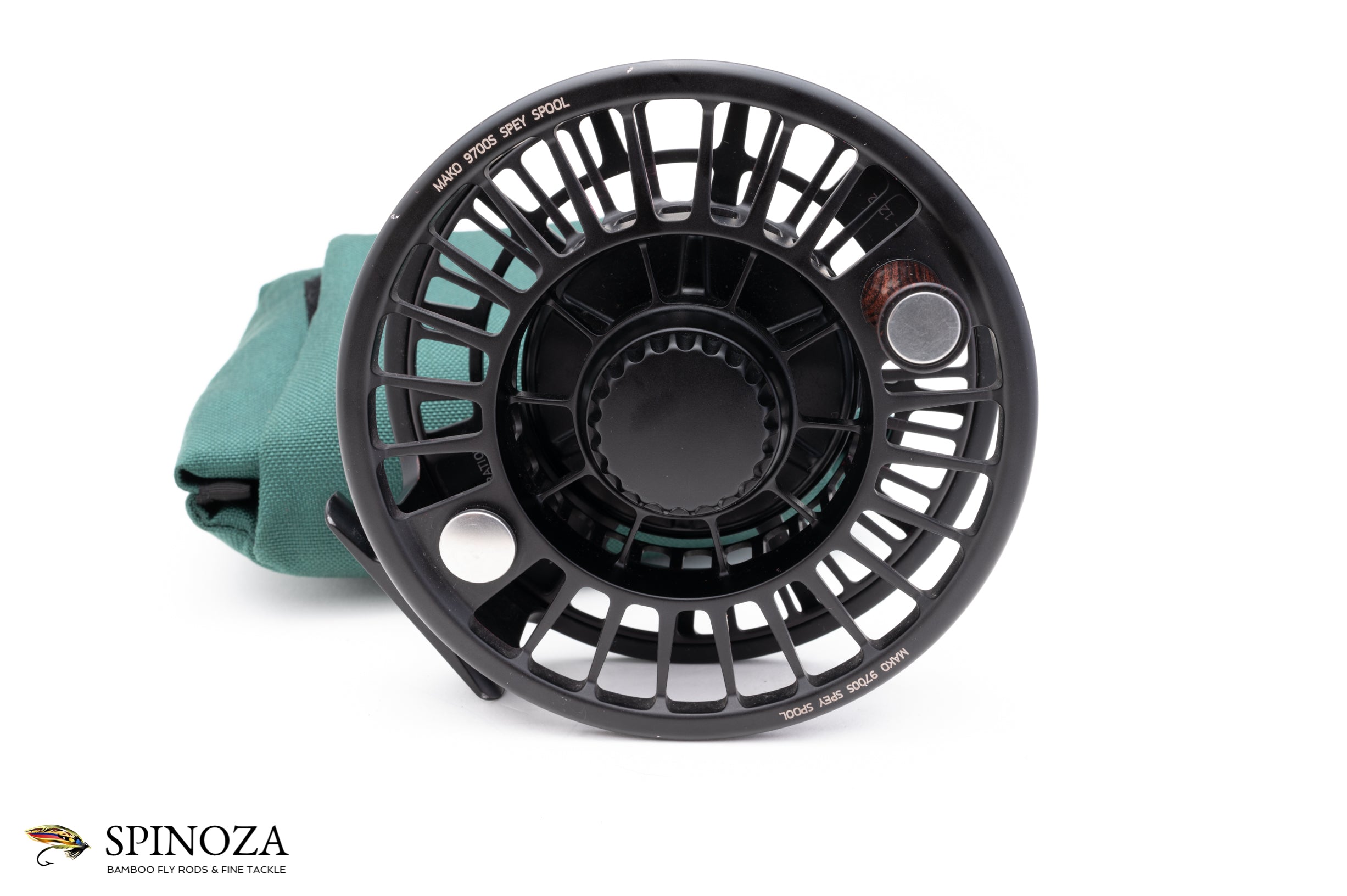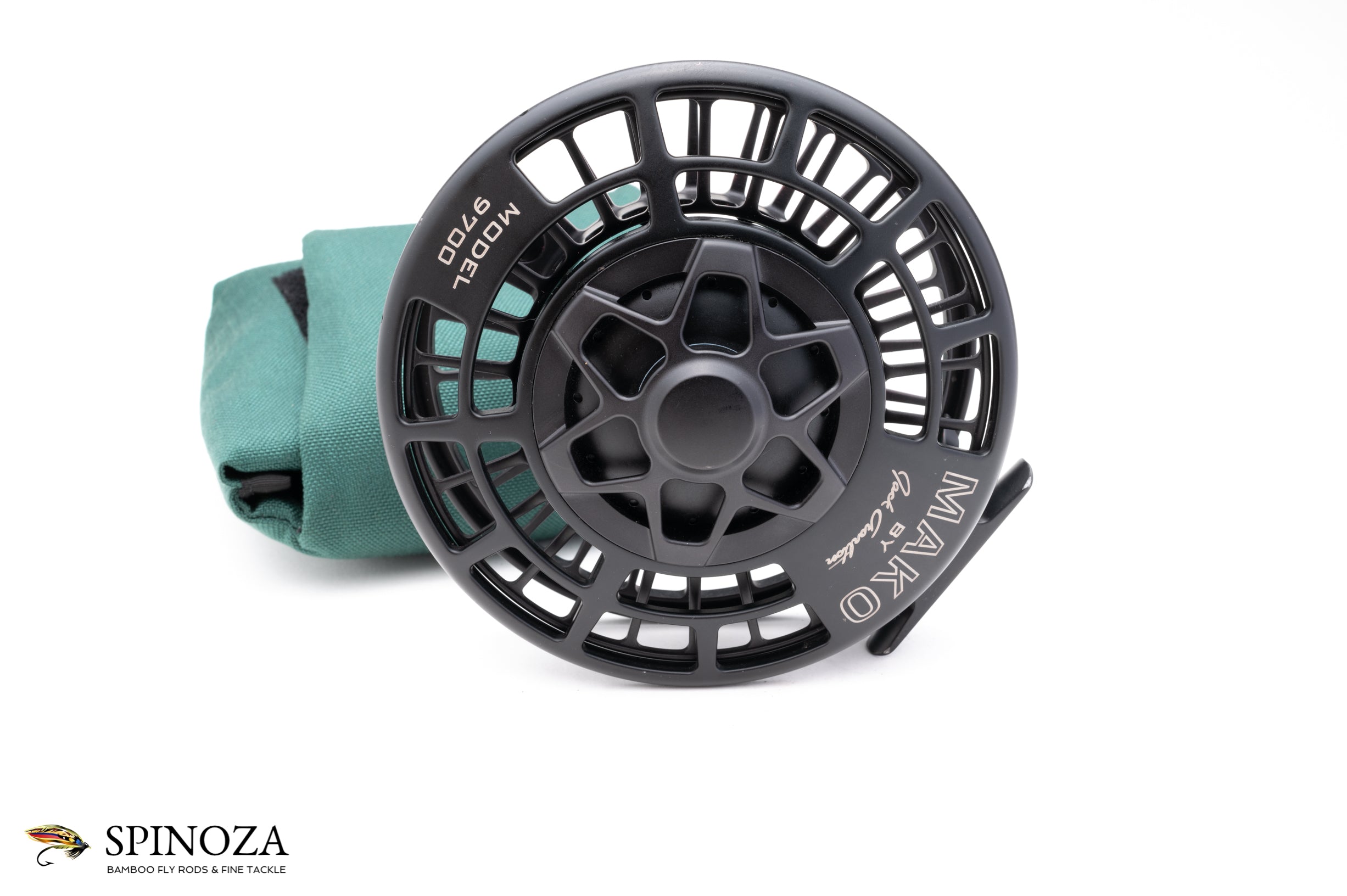 A nice Charlton Mako Model 9700 reel, set up for LHW. 5 1/2" diameter and 14 7/8 oz. Excellent used condition with a few small nicks on the edge of the frame and spool but clean otherwise. Stealth matte finish. Heavily ported large arbor design, which, along with the spey spool, allows for substantial capacity which clocks in at 400 yards of #50 gel spun with a long belly spey line. Comes in the original green cordura pouch. If you're looking for durable reel with serious capacity, this is it!