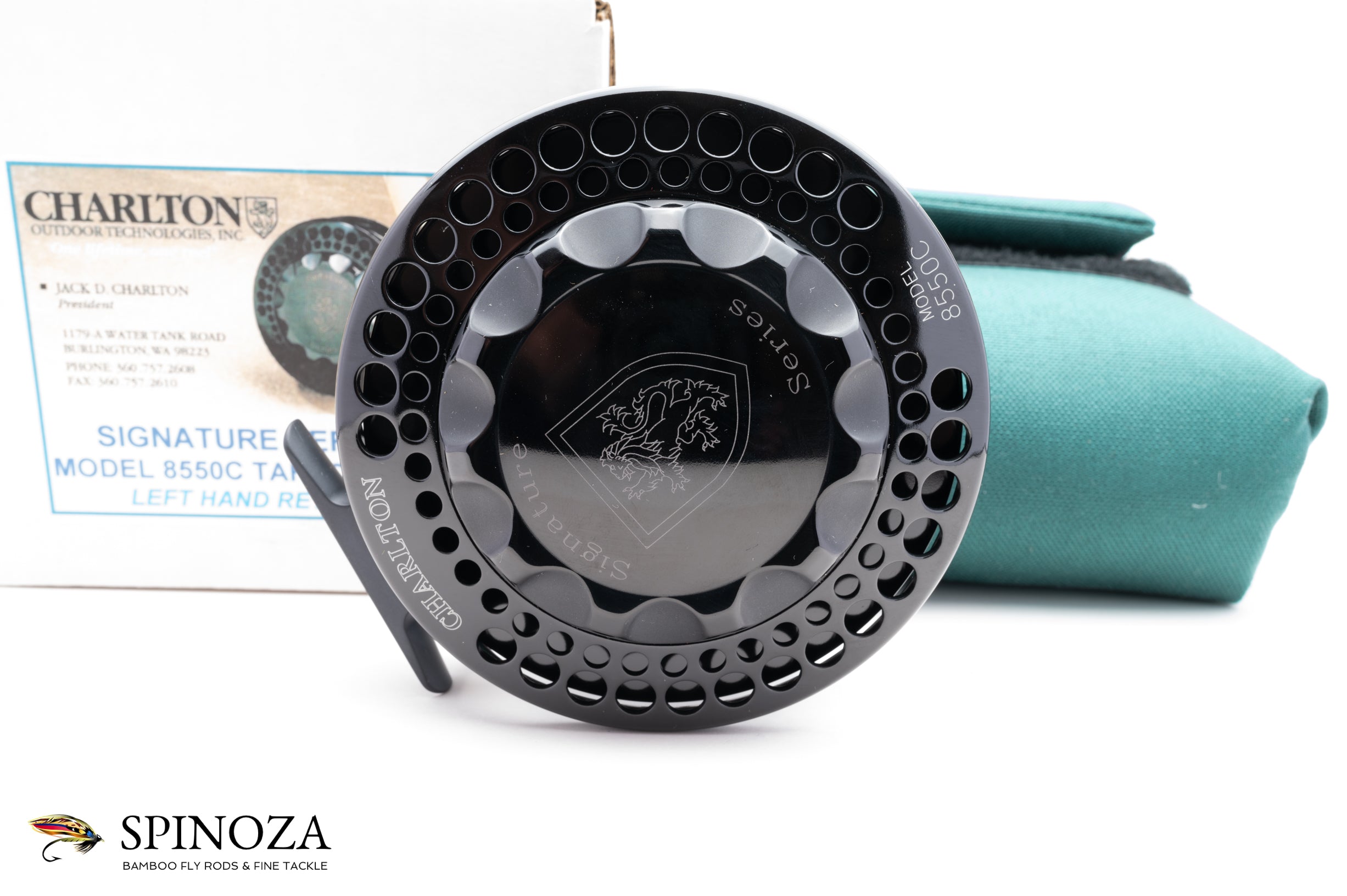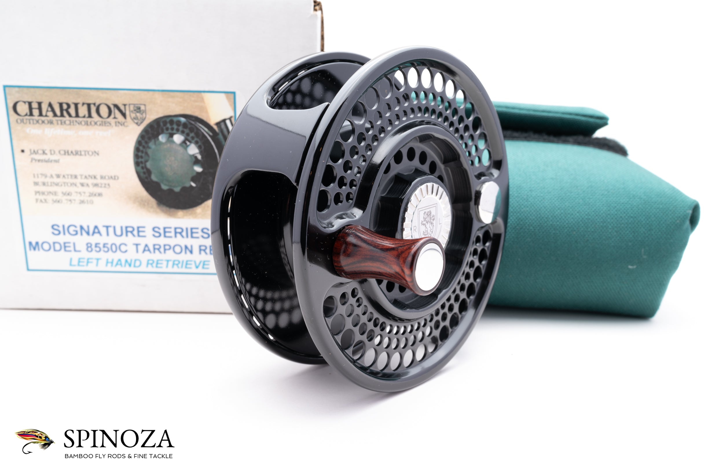 A superb Charlton 8550C fly reel with a tarpon spool. Set up for LHW. Mint, unused condition. 4 1/2" diameter with a 1 3/16" spool width. The capacity for this model is listed as WF 10 and 400 yards of 30 lb backing. Serial #8550-9768. The sealed carbon fiber disk drag is self-adjusting and has over 9-square inches of surface area. Excellent all-black type-III hard anodizing except for the center medallion and the counterweight which are done in chrome. The reel is packed in the original green cordura pouch with the box and paperwork. A highly sought-after Charlton model here, it doesn't get much better than this for chasing large saltwater species.