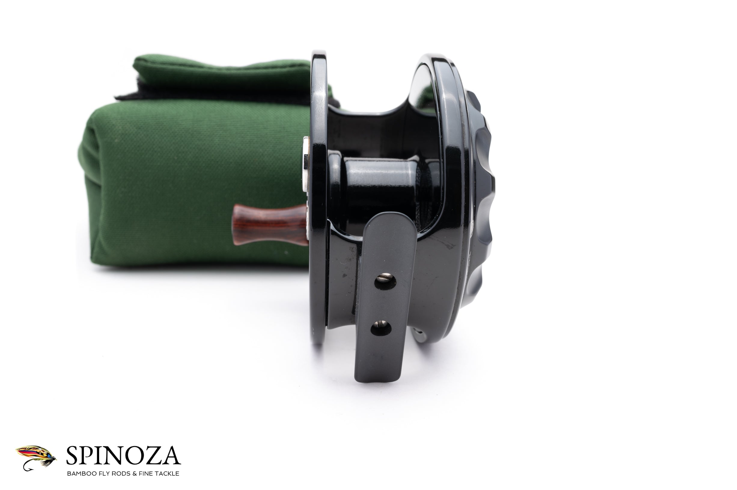 A nice Charlton 8500 Signature Series 1.2 fly reel, 3 3/4" diameter and set up for LHW. Near mint condition. There is one very tiny ding on the spool edge, and a tiny amount of scuffing on the frame edge in one spot, but the reel is exceptionally clean otherwise with no other signs of use. 1.2" spool width and it weighs 11.2 ounces on my scale. Designed to hold a WF10 and 275 yards of backing. Characteristic type III glossy black anodized throughout with the matte finish on the reliefs on the spool. Serial number "SS10430" noted on the interior of the frame. With a sealed carbon fiber drag, this is a great saltwater model designed to handle anything you can throw at it. The reel comes in the original green cordura pouch.