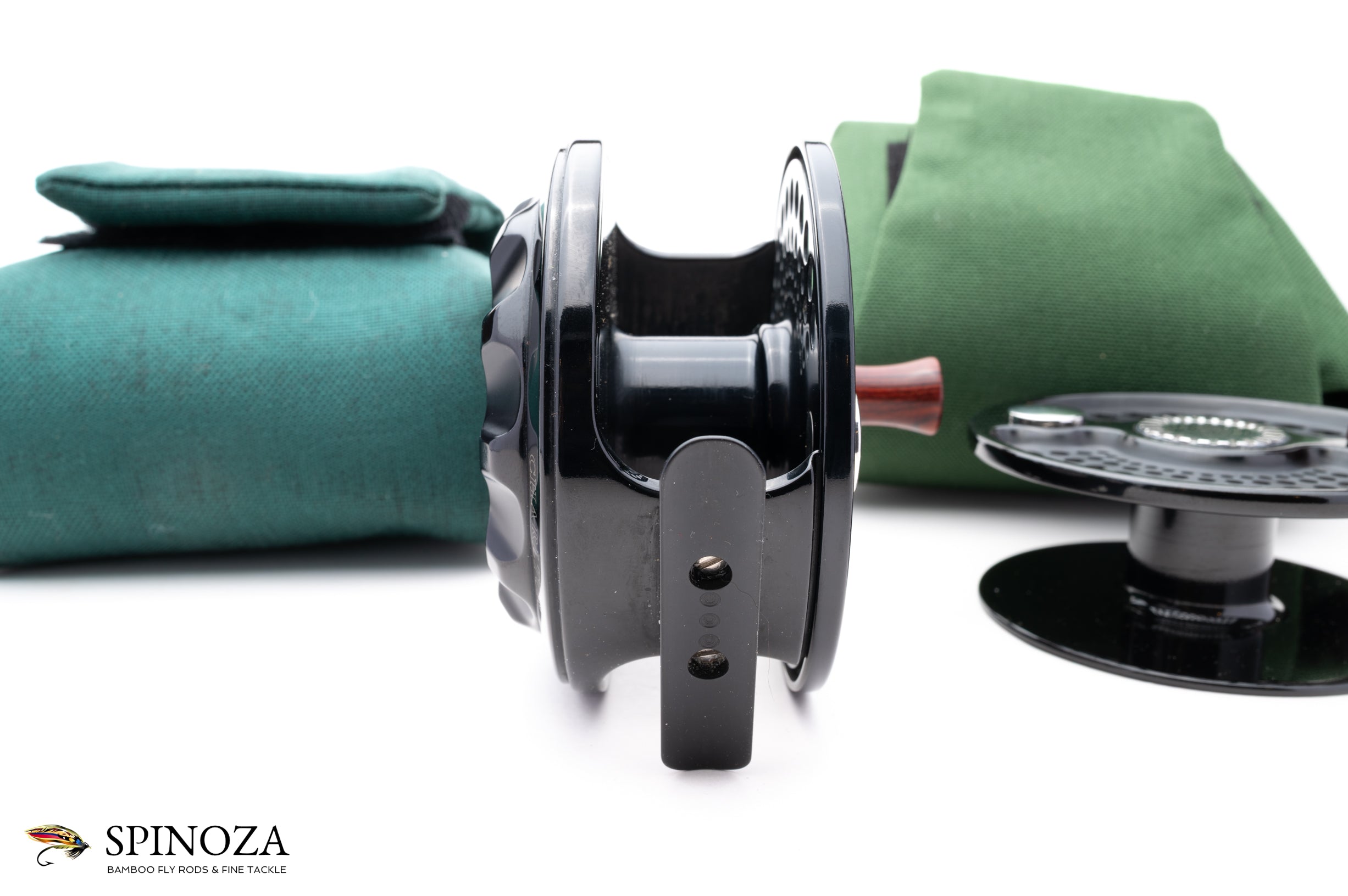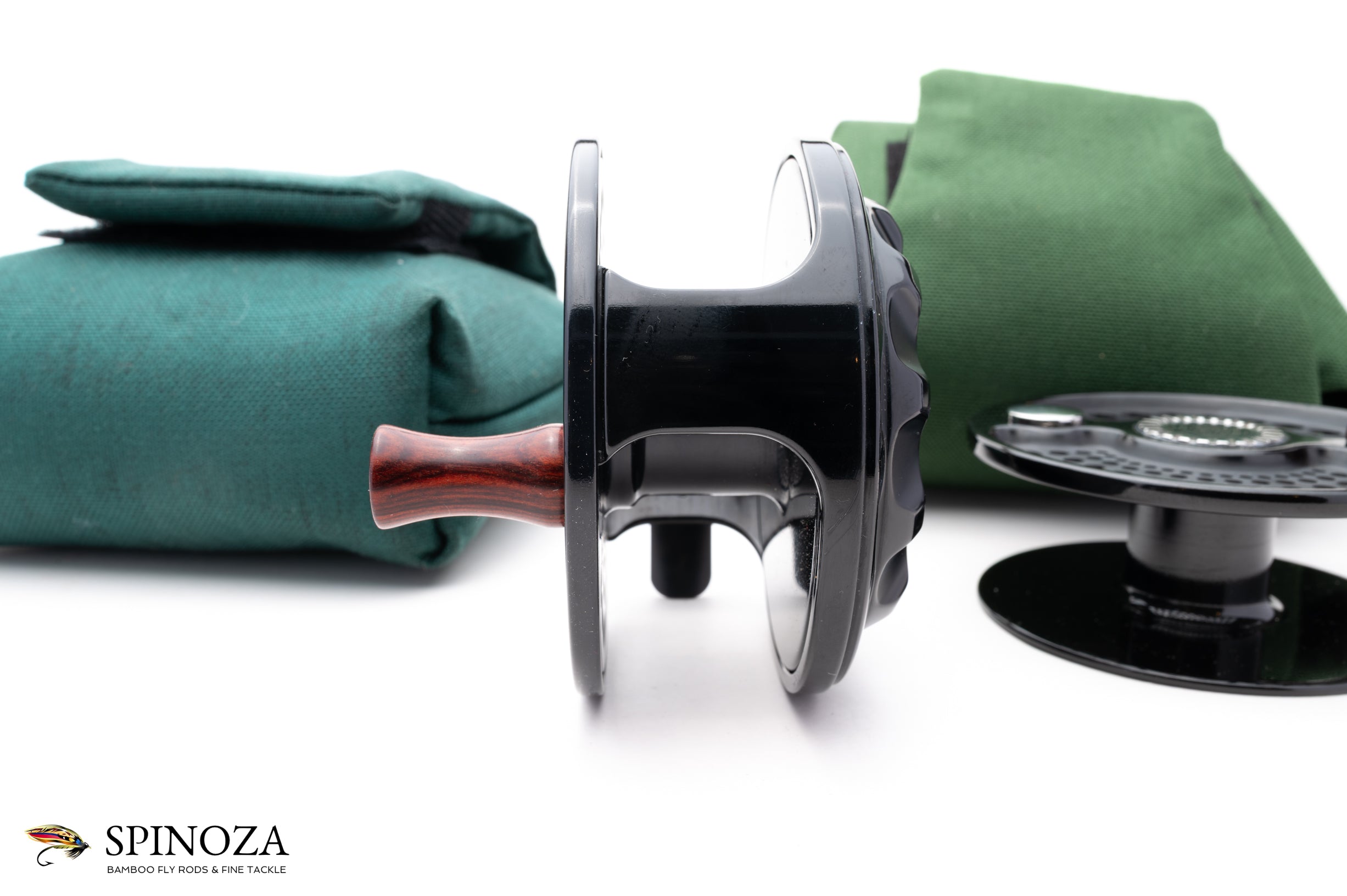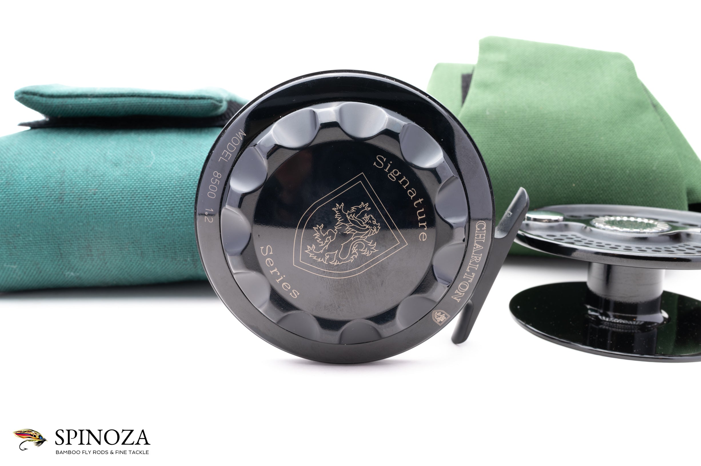 A nice Charlton 8500 Signature Series 1.2 fly reel with a spare spool, 3 3/4" diameter and set up for RHW. Lightly used condition with a few spots of rim rash here. 1.2" spool width and the reel weighs 11 ounces on my scale. Designed to hold a WF10 and 275 yards of backing. With a sealed carbon fiber drag, this is a great saltwater model designed to handle anything you can throw at it. Both the reel and the spare spool come in their original green cordura pouches.