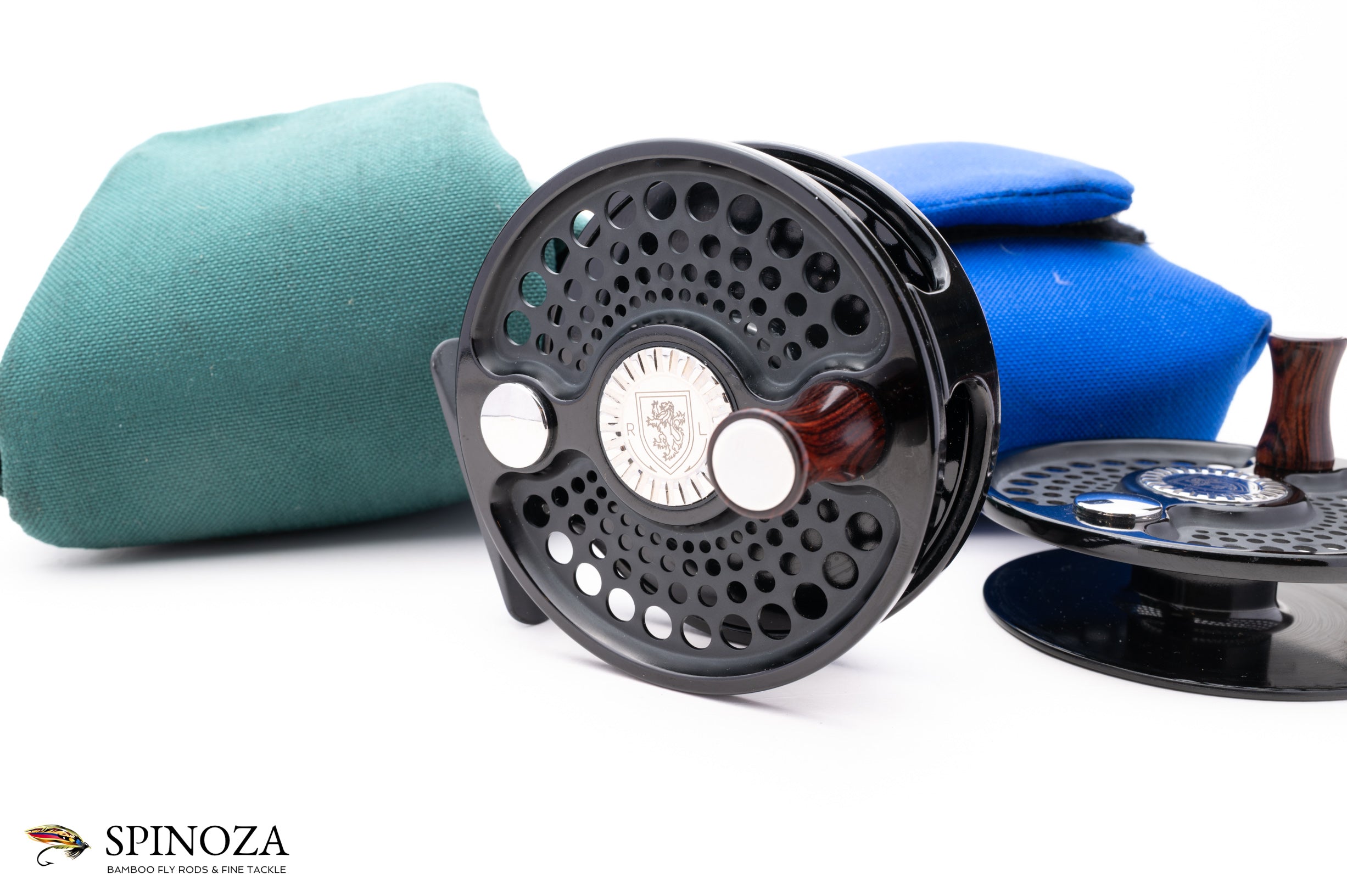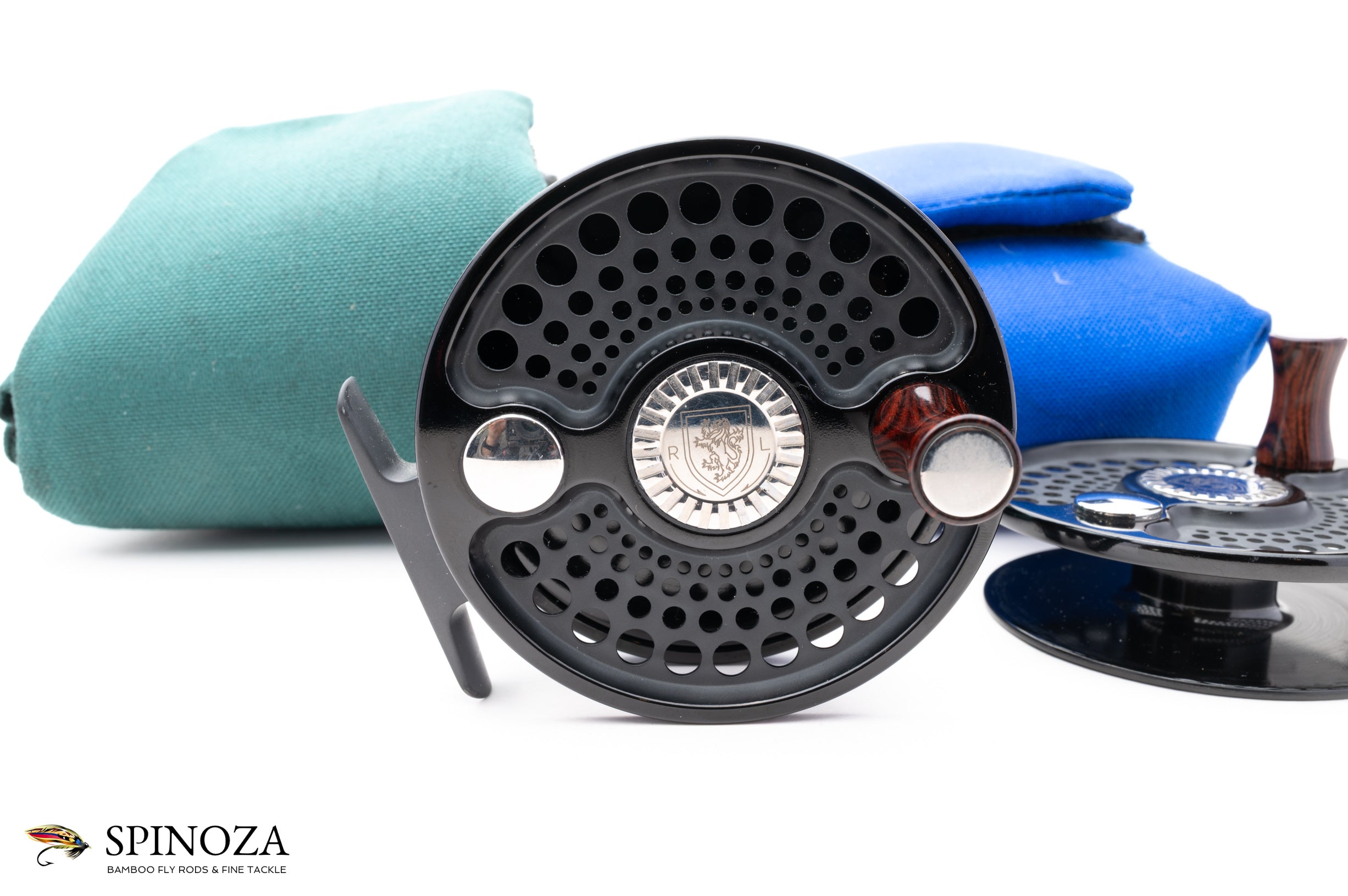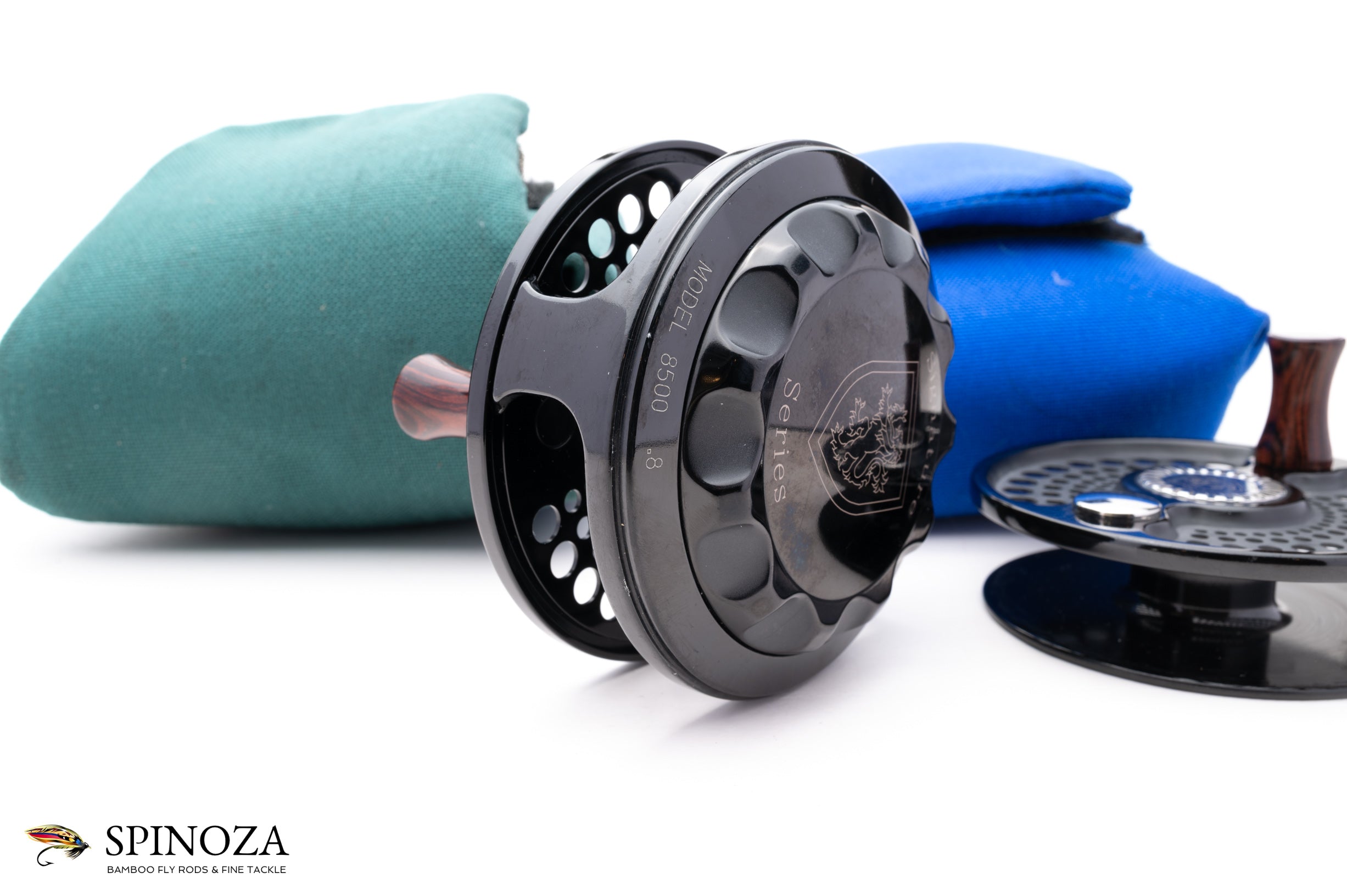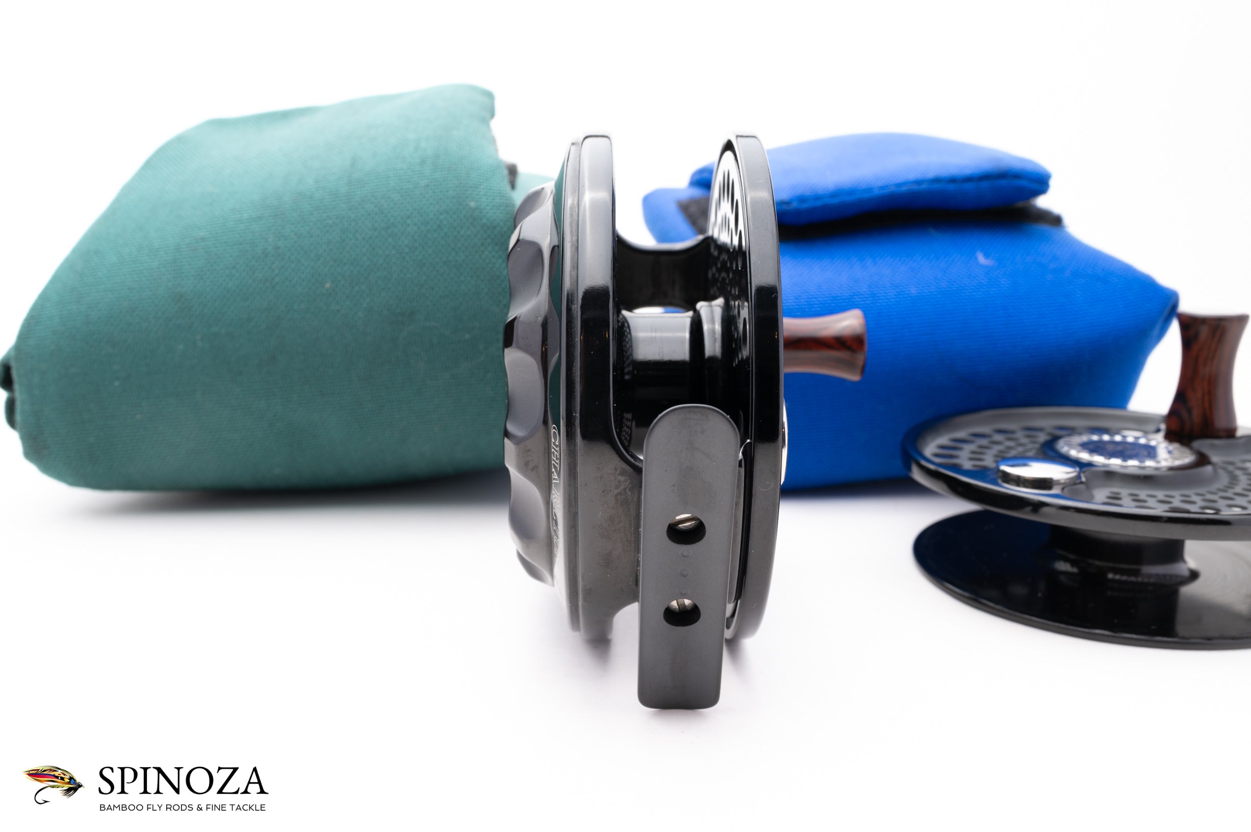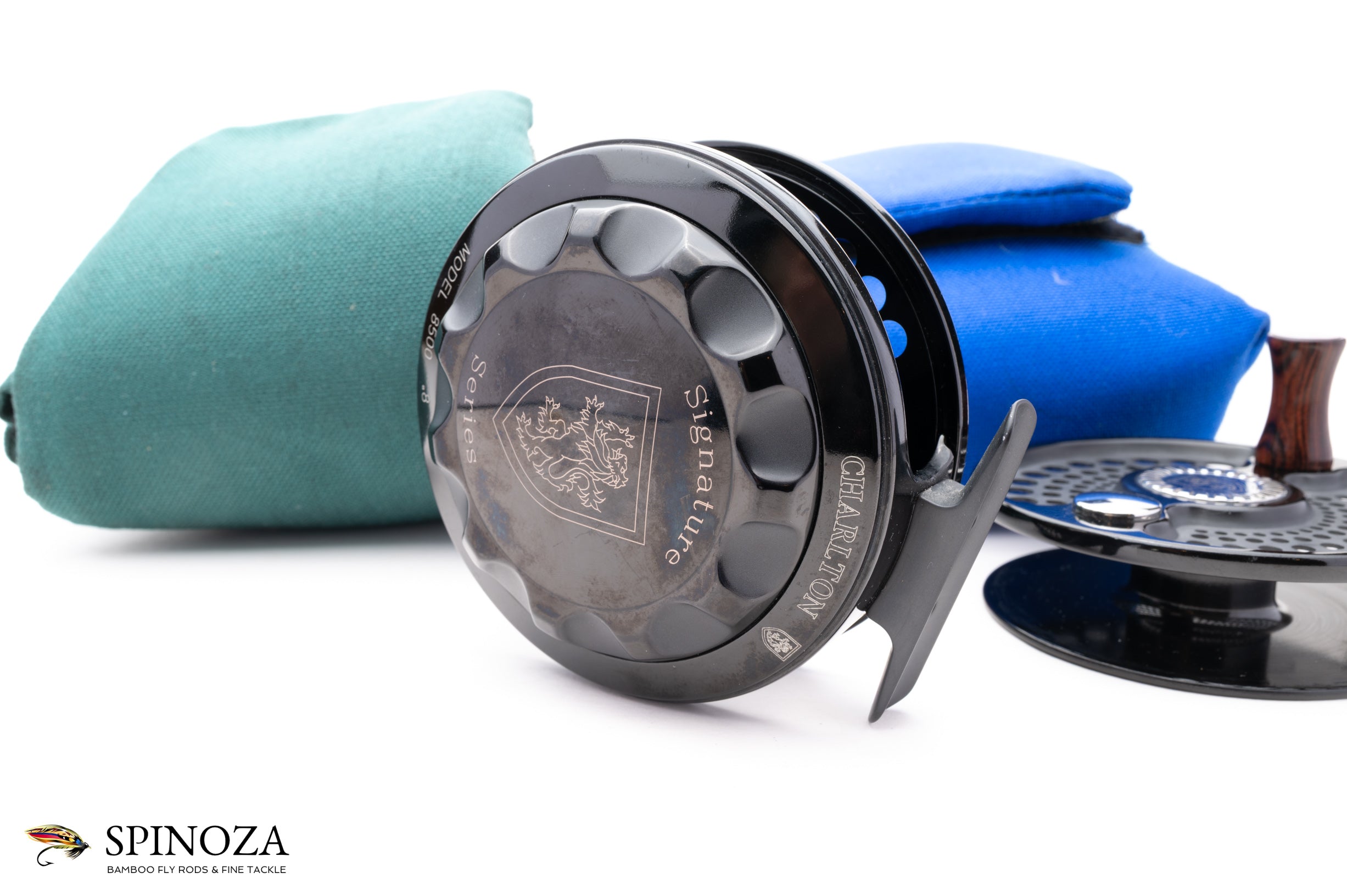 A nice Charlton 8500 .8 Signature Series fly reel with a spare spool. Set up for RHW. Excellent lightly used condition with a few minor touches of cosmetic wear. The 0.8 spool can fit a WF8+150 30# or a WF10+160 20#. Meticulously coated with a high-polished, deep black Type III anodized finish with matte reliefs. Fully machined from high-grade aluminum and steel. Has a sealed, self-adjusting carbon fiber disk drag which includes over 9-square inches of surface area and boasts five oversized aerospace precision bearings. A large arbor design gives the angler over 1 foot of line retrieve per revolution. Both the reel and spare spool come in their original green and blue cordura pouches.