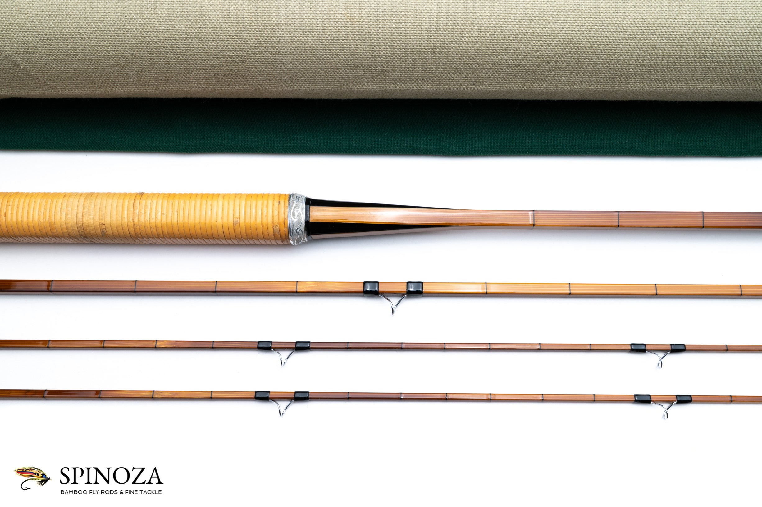 A nice JD Wager Presentation Quad fly rod, 7'6", 3-piece, 2-tip, and built for a #5 line. DF action. 6.2 ounces. A really nice job here by Jeff who has built one of the finer quads I've seen in a while. This rod was lawn cast and then put away. All of the ferrules, checks, and hardware are engraved. Rattan handle. The cane is a medium flame and the nodes are done in a two opposed pattern. The varnish is superb. The wraps are black with tiny black intermediates. The stripper is a dark grey or black agate. The snake guides are chrome. The four strips of the butt are inlaid into ebony to form the grip swell. A large front grip check is engraved in the same pattern as the ferrules and reel seat hardware. The grip is rattan and 6" long. The reel seat is varnished mortised ebony with an uplocking screw lock and a hidden pocket cap. The rod packs into a green cloth bag with a black painted brass top rod tube with Jeff's logo sticker and a cloth overbag. I have been told that this rod was done as a one-off request for a customer.