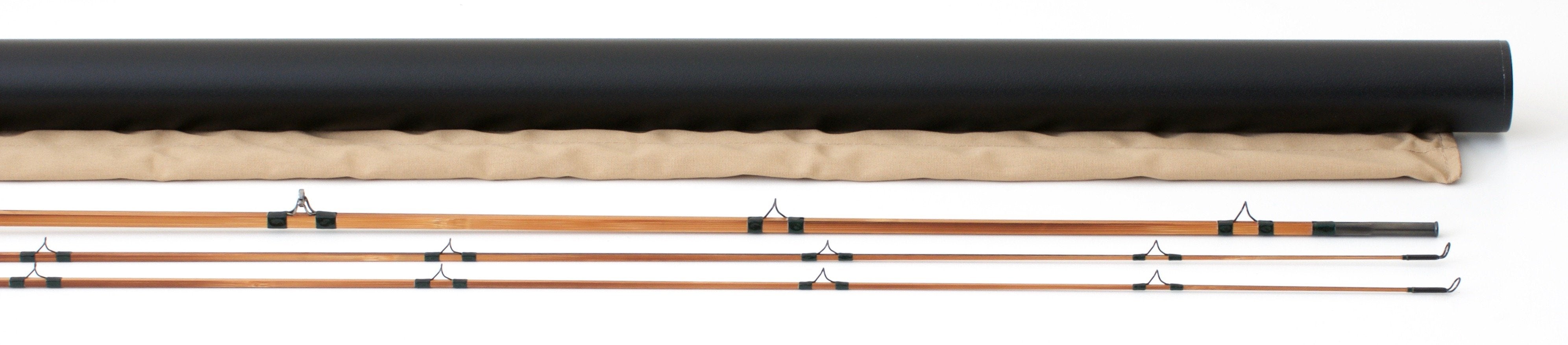 Darkly tempered cane with a matte finish. Dark emerald green wraps and blued guides. Blued nickel silver squared winding check. The cigar grip measures 5 1/2" in length. Blued nickel silver cap and ring reel seat over a cork spacer. There is a bit of color variation in the bluing on the reel seat. The nickel silver ferrules have a perfect fit, nice and tight. The rod weighs 3.10 oz. Medium-fast action. Includes original bag with leather hang tag and the original labeled tube with brass fittings.