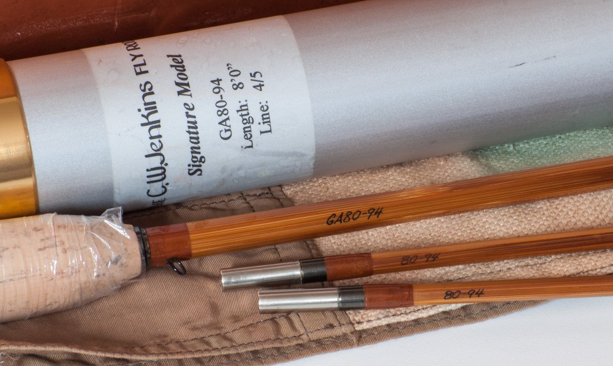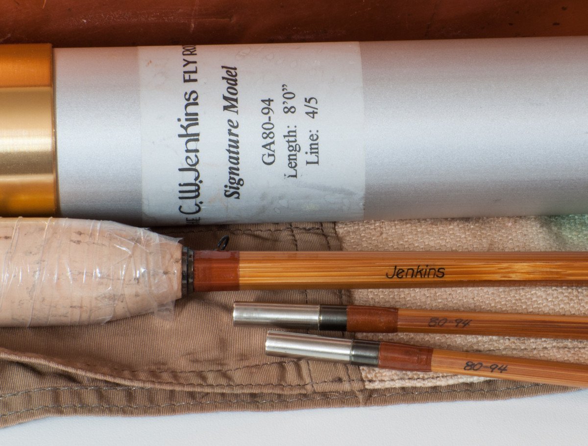 For sale here is a Jenkins Model GA80 bamboo rod from the bench of Charlie and Steve Jenkins. The rod is in unused condition. 8 feet, 2/2 format for a 4 or 5 weight. Weighs 4 oz. Stunning dark oxidized nickel silver cap and ring. Chestnut thread wraps. Oxidized nickel silver ferrules. Oxidized guides. Includes replacement two-section cloth bag and the original labeled aluminum tube.The still-wrapped cigar cork grip has a tiny gouge from one of the guides impacting it at some point.The rod has a very pleasant medium action and a progressive taper. A very capable rod, whether dry fly fishing or swinging wets. A wonderful all-around trout rod.