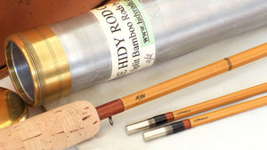 For sale here is a Jim Hidy hollowbuilt bamboo rod. Seven feet six inches in length, two sections with two tips, made for a four-weight fly line. Near mint condition with slight soiling of the grip (I can clean if desired). The varnish is flawless and all bluing remains on the hardware. Blonde cane, oxidized nickel silver micro ferrules, bright guides and tip tops, and n/s cap and ring reel seat. Brown silks with black tipping. Extremely smooth progressive action, casts very well with very little line out and holds plenty of reserve power for longer casts. I'd rate it on the medium side of medium-fast dry fly action. The rod weighs 3 3/8 oz. Original bag and tube.