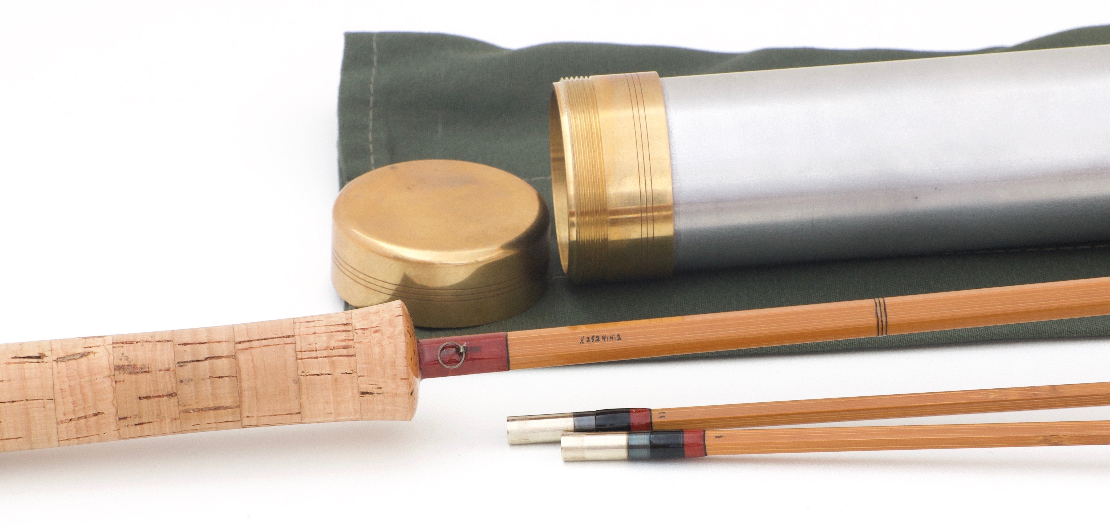 Beautiful, moderately tempered cane. Amber wraps, double-wrapped at the guides with fine black tipping at the winding check, male ferrules, and tip-tops. The ferrules are wrapped in black. Blued hardware throughout. Agate stripping guide. Ring hook keeper. The full wells grip measures 6 1/4" in length. Elegant nickel silver cap and ring reel seat over a gorgeous mortised wood spacer. The truncated Swiss-style ferrules have a perfectly snug fit. The rod weighs 3.60 oz. Extremely smooth and balanced progressive action, casts very well with very little line out and holds plenty of reserve power for longer casts. Overall medium fast action and flexes well into the butt section. Suitable for all types of fly fishing -- dries, wets, and small streamers. Lastly, the length makes for excellent mending and roll casts. All sections are full length and straight. Includes the original bag and tube with fine brass fittings.