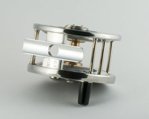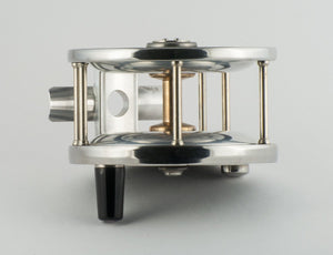 Perhaps a once in a lifetime opportunity to acquire a Joe Janciuras 6/0 Vom Hofe Restigouche style reel. Stainless steel rims, ebonite sideplates, with nickel silver fittings. Joe made only two of these reels in his lifetime. Absolutely exquisite craftsmanship, testament to why many think Joe was one of the most talented reel makers of the entire 20th century. Silky smooth drag operation. The reel has never been lined and remains in like-new condition. Comes with a fine Arne Mason leather case with Joe's oil cap affixed to the top (also the only reel case ever made with this feature).