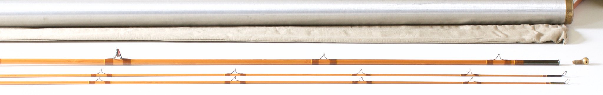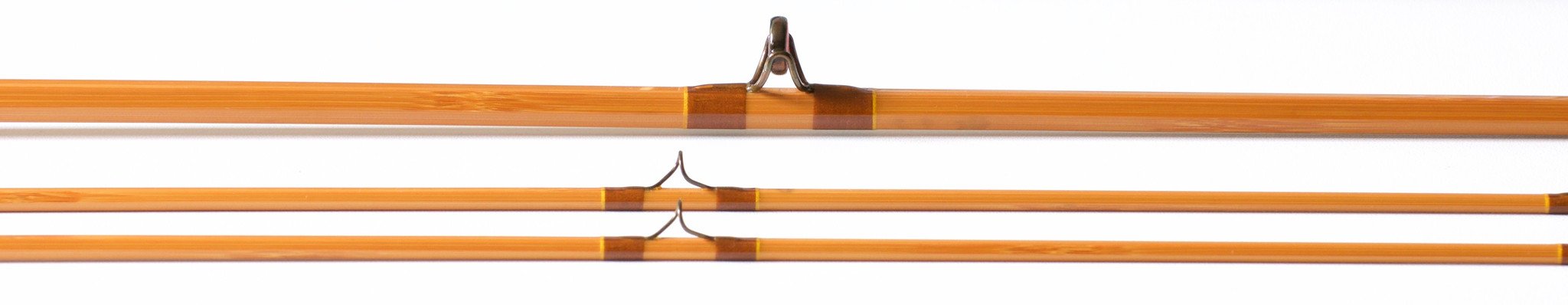 For sale here is a rarely seen John Bradford Legacy bamboo rod. 8 feet for 5 weight line -- modeled after the Dickerson 8013 taper. Serial number 1622. The rod is in excellent++ condition having been fished very sparingly. All sections are full-length, straight and free of repairs or issues. The rod has oxidized hardware, attractive knurling on the pocketed cap, ring and cork check. Golden brown windings with yellow edges and three signature wraps on the butt section. Medium progressive action. Comes with ferrule plug, original bag and original labeled tube. The rod weighs 4.7 oz. and the ferrules are size 13/64 with an excellent fit.