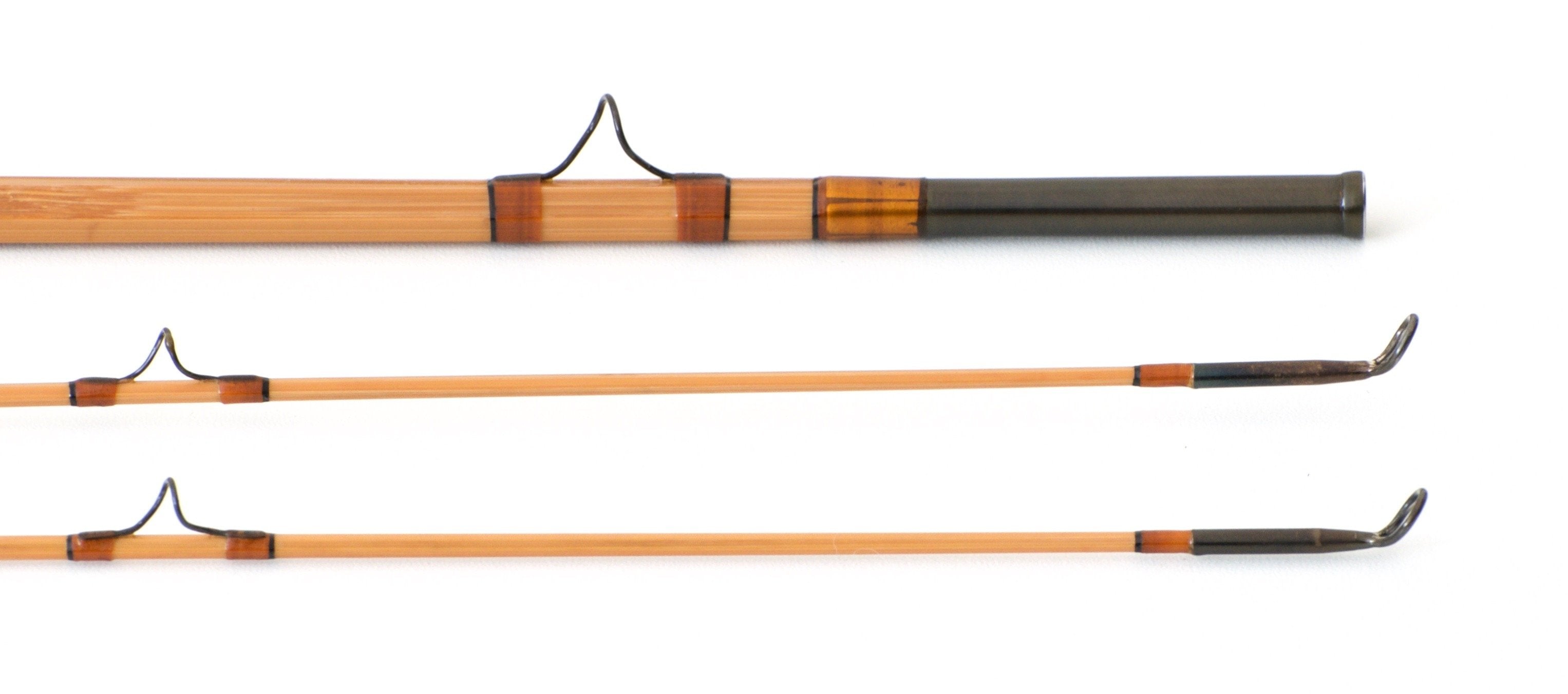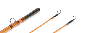 Straw colored cane finish with transparent caramel wraps and black tipping. Blued guides and ferrules. The script remains clean and bold. Bronzed loop hook keeper. Bright hexagonal nickel silver winding check. The reverse half wells grip is 6 7/8" in length with slight soiling. Bright aluminum down-locking reel seat over a beautiful burl walnut spacer. Nickel silver butt cap. The ferrules are size 14/64 with a perfect fit. The rod weighs 4.95 oz. The rod has a powerful dry-fly action on the fast side of medium-fast.